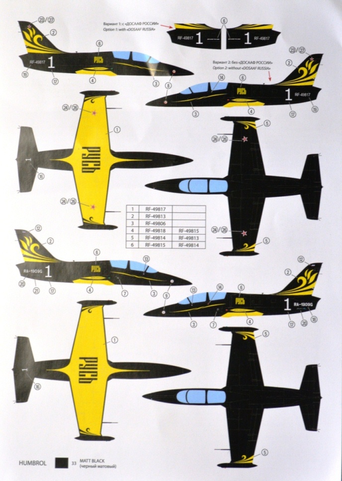 Декаль на самолеты АГВП "Русь" в современной ливрее. Даны варианты на все самолеты группы, включая как российскую, так и прибалтийскую регистрацию. Как я понял, это только начало серии декалей на Л-39. Я, например, очень жду предыдущий, "чешский" вариант окраски :)