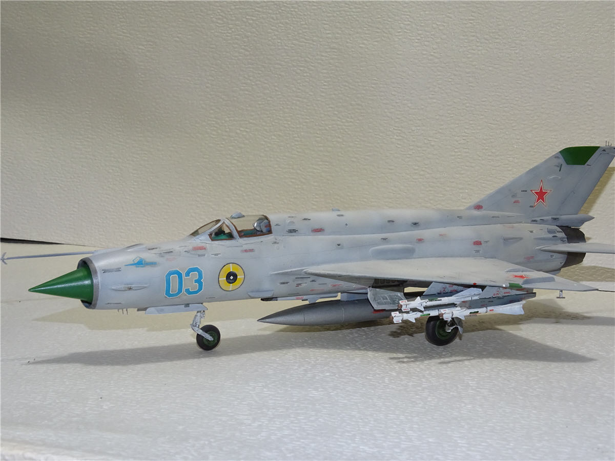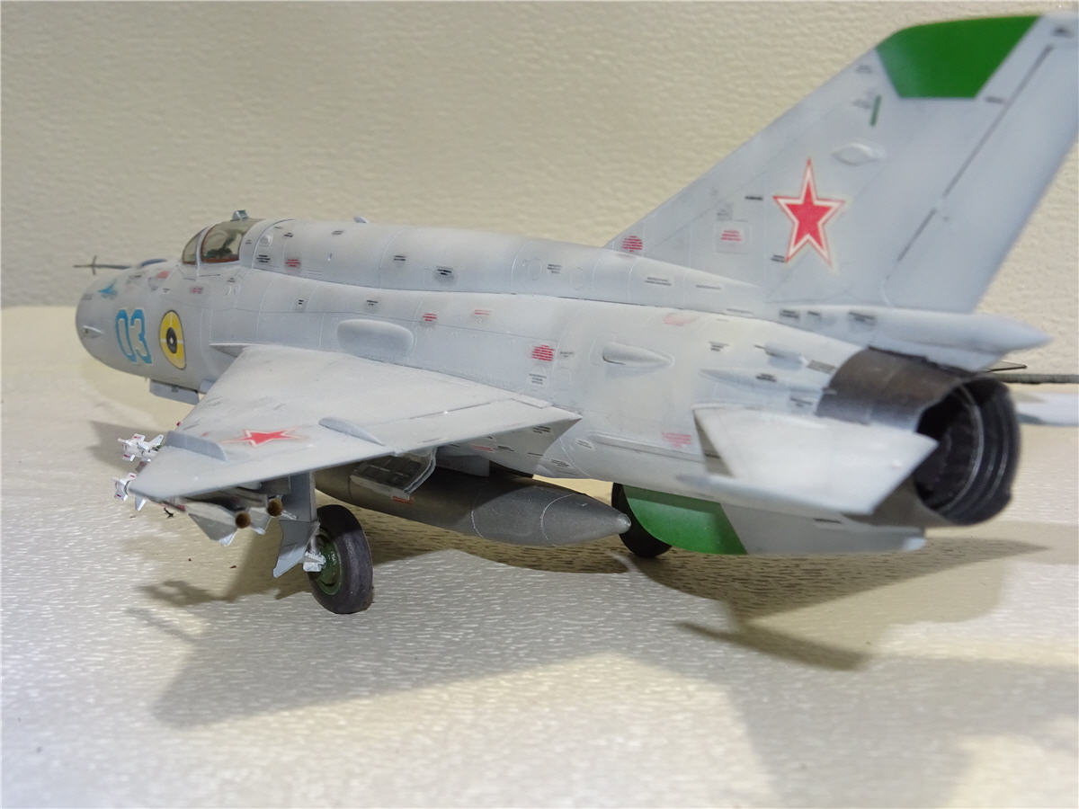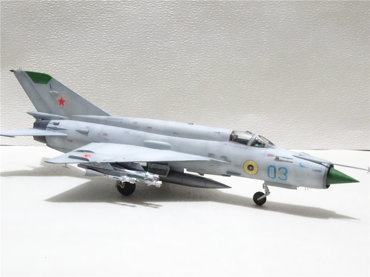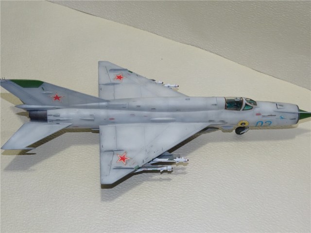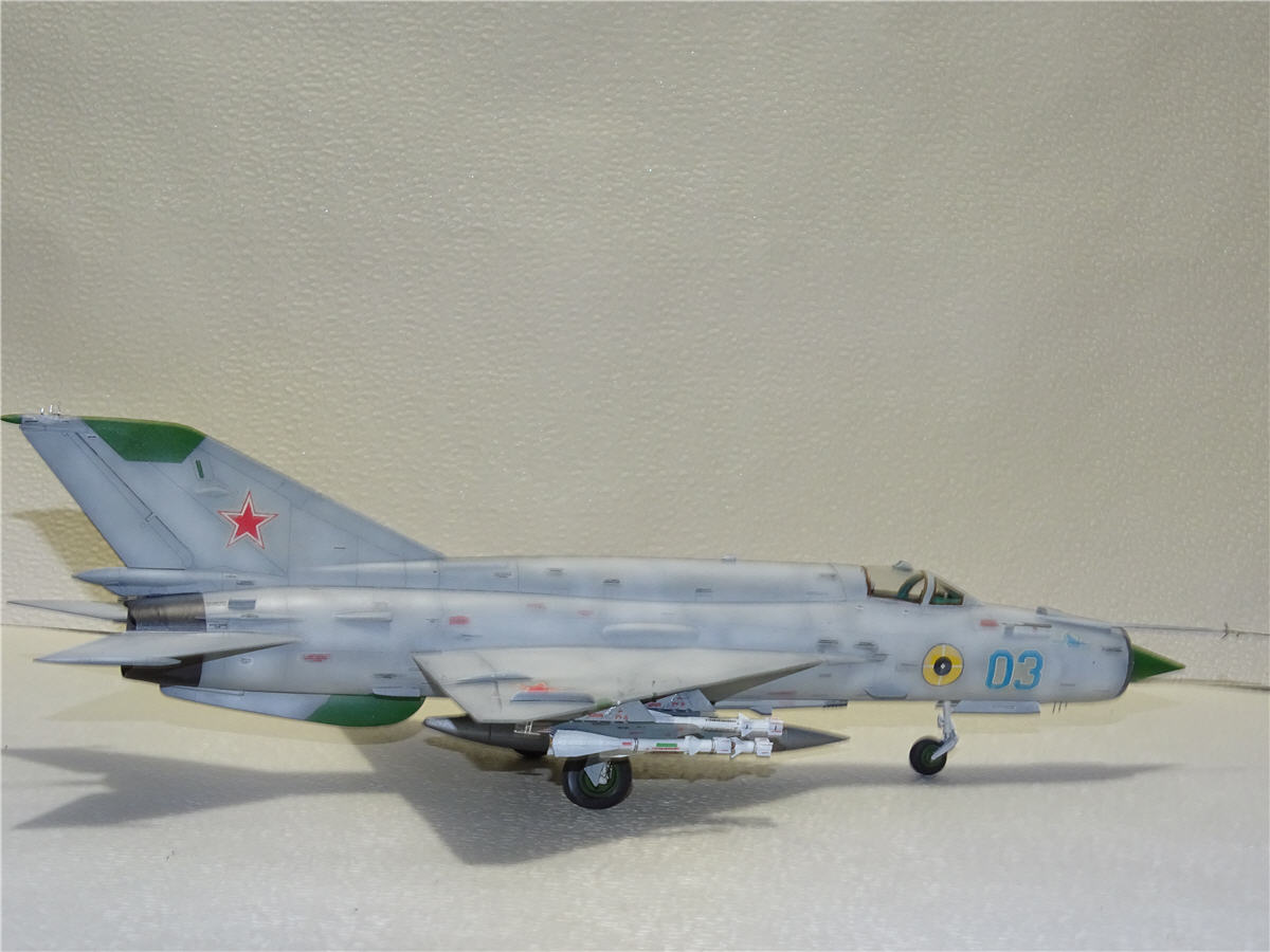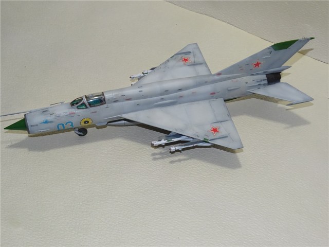 Ну,вот и заканчиваю свой "сериал"про МиГ-21,моделью МиГ-21бис.Собирал я её в паре с МФ поэтому сделал обвязку ниш как положено,ещё не отошёл от "глубокого запила".Правда самолёту,верней данной модели не повезло,в процессе изготовления.Сначала потерялась ПВД,но тут пришла коробка с ПФМ,где на плате была ненужная для ПФМ, но прекрасно подходящая дли БИС-ПВД. Красить я собирался его под самолёт ВВС СФРЮ. Под него подготовил подвески как на фото,покрасил,наклеил техничку(само собой Бегемот).Чем мне понравился данный борт на выцветшей краске чёткими пятнами выделялась техничка.Для этого после наклейки её я прошёлся по ней слегка аэрографом,после чего прошёлся тампоном с растворителем по места где под краской была техничка с целью её выделения...И когда наступил радостный момент нанесения ОЗ на киль,я понял что модель не совсем счастливая.Пропала дека на киль,перерыл всё,но увы.Пришлось в срочном порядке искать замену югославу,чтоб не перекрашивать модель...Попался серый борт 03 ВВС СССР(в деках Бегемота он есть)правда в жизни он выглядел не много по другому.Но я же говорю не везучая модель...