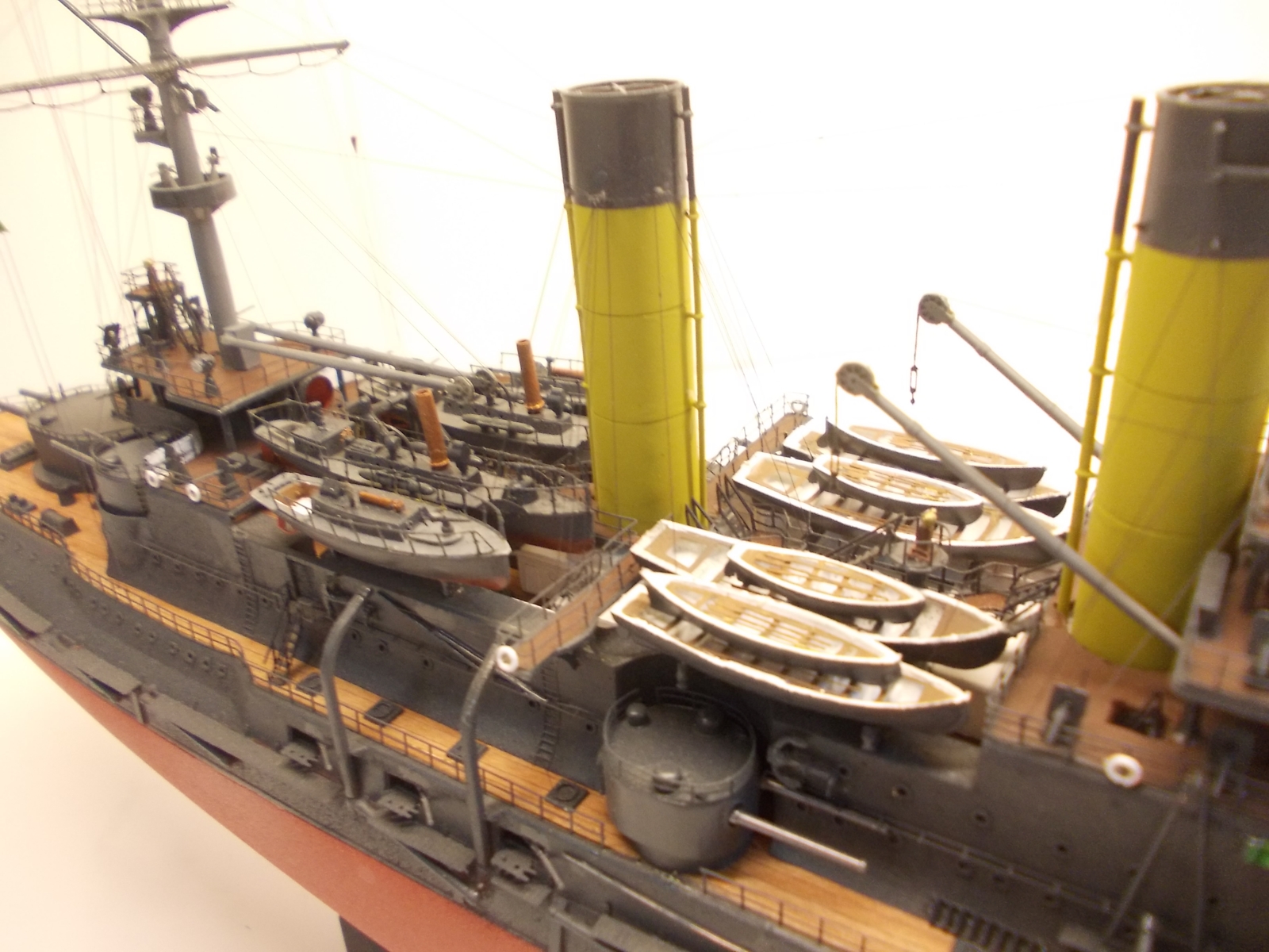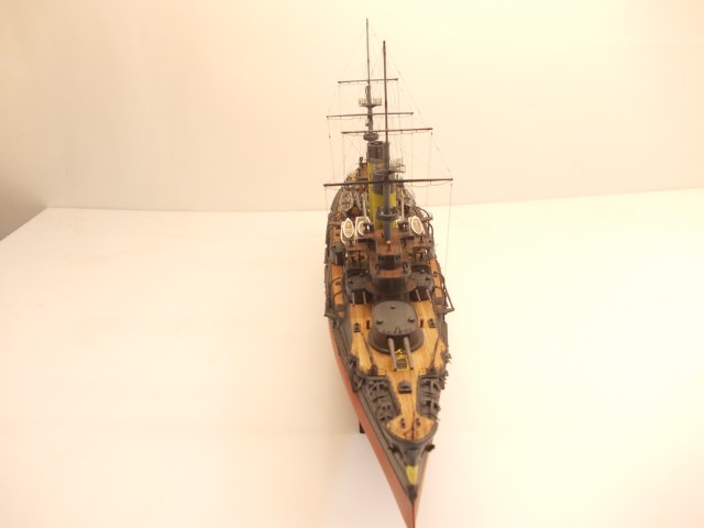 Переделал ходовую и нижнюю часть боевой рубки, исправил ватерлинию по правому борту, правильно разместил иллюминаторы, трапы, мусоропроводы, поправил противоминные шесты. Исправил переходные мостики, добавил компасную площадку и раструб перед кормовой надстройкой. Закрыл борта у башен 152мм калибра, поменял башни, трубы и 56ти футовые катера на zip. Стеньги на мачтах поменял на проволоку, чтоб не деформировались под такелажем. Такелаж -бантик, сделал несколько блоков на рее.