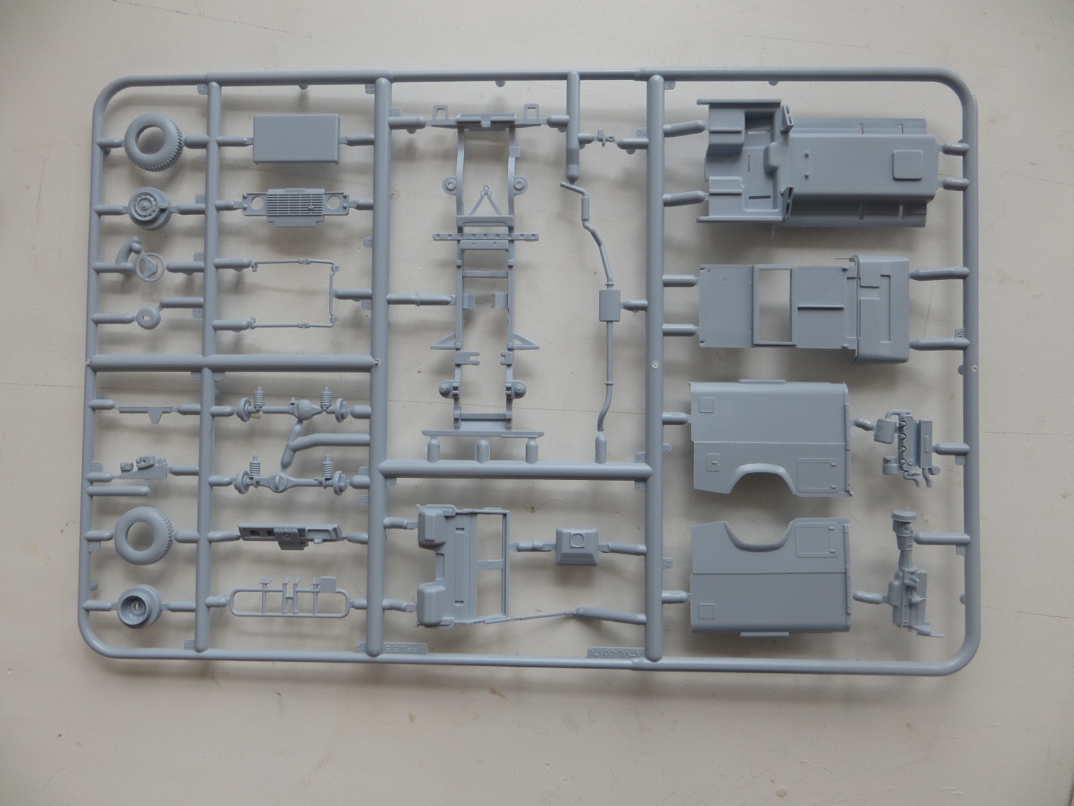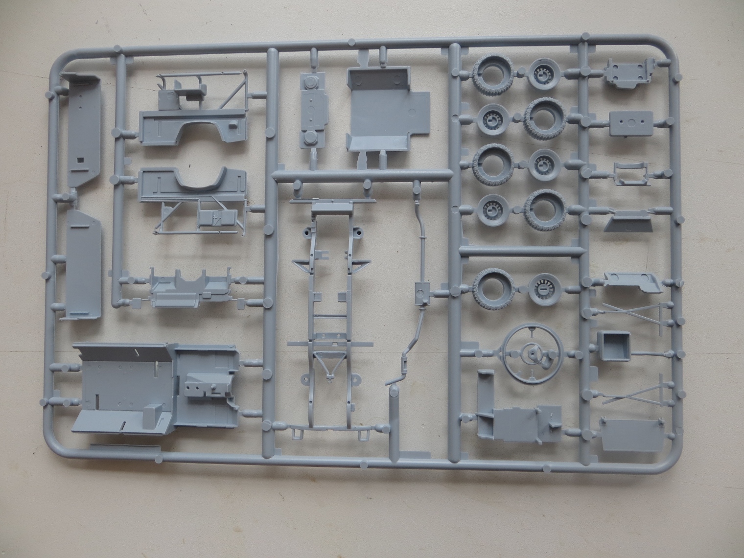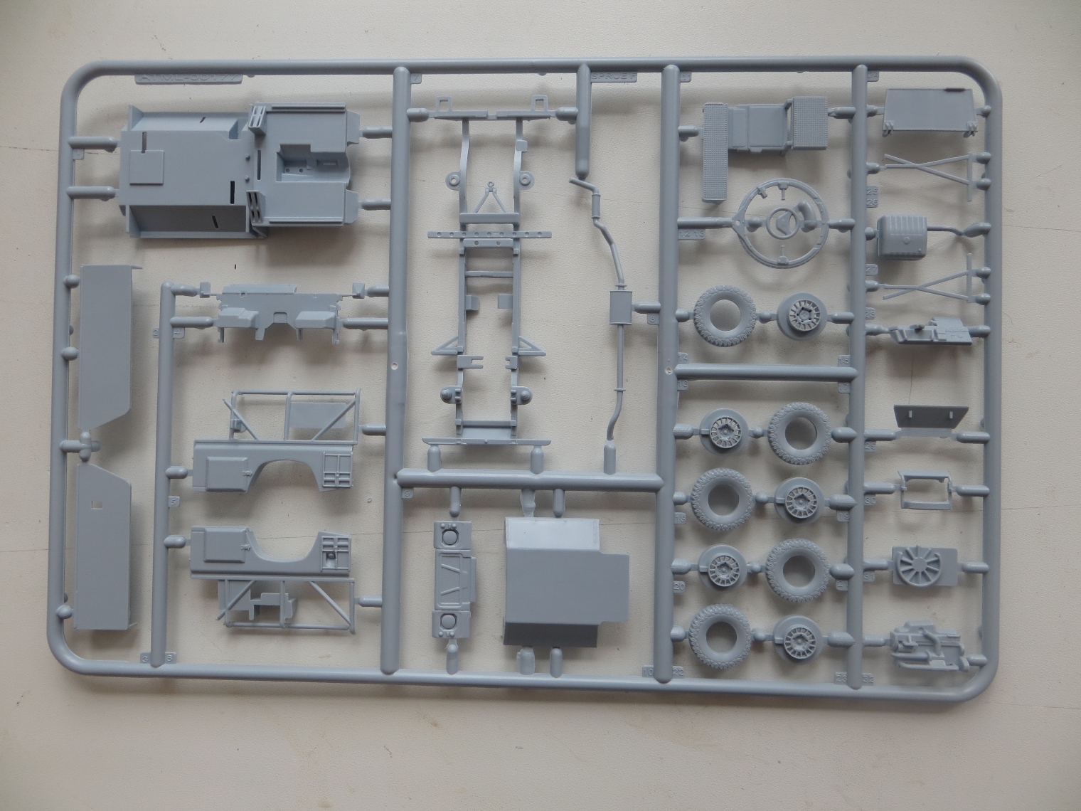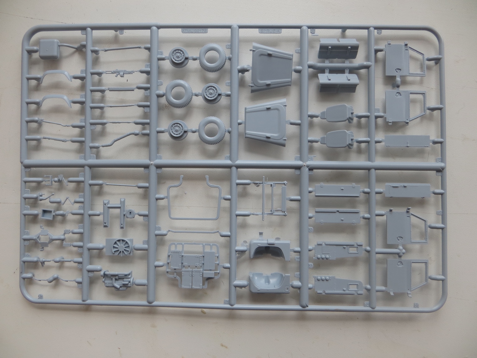 Коробка содержит 4 литника (по 2 на модель), 1 литник прозрачных деталей, декаль - одна на две модели, инструкцию и приглашение вступления в официальный клуб Airfixa за 16,99 фунтов. Имитация решеток на стекла сделаны декалями, буду менять на металлические от наушников или кассет от вибросит. В наборе имеются варианты деталей для закрытых и открытых дверей и капота у обеих моделей. Качество литья на первый взгляд хорошее, имеются кое-где на нескольких деталях небольшой облой. Удивило не одинаковая толщина литников (в центре очень толстый, по периметру обычной толщины). Еще немного расстроила имитация просадки колес, придется закапывать в песок. Также на коробке есть инструкция по цветам окраски. Сам буду делать из набора конверсию шести колесную постапокалиптическую (даже две, позже еще один набор прикуплю).