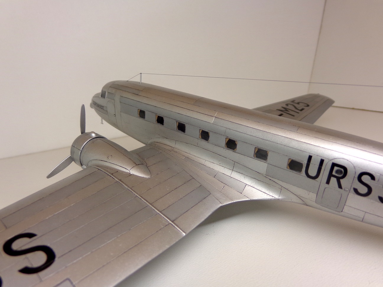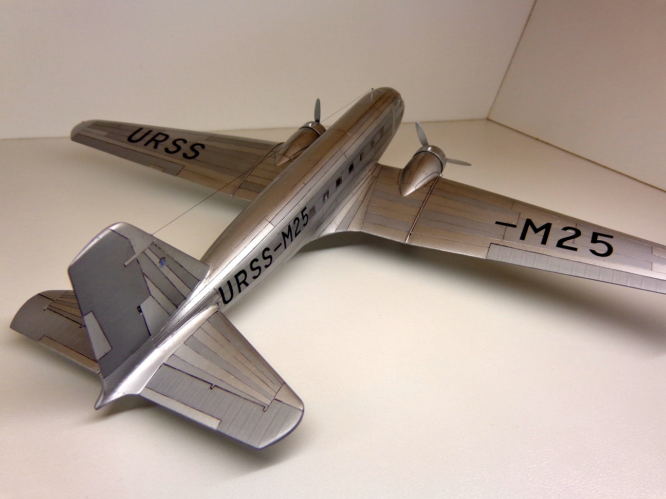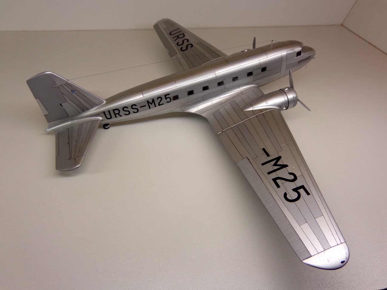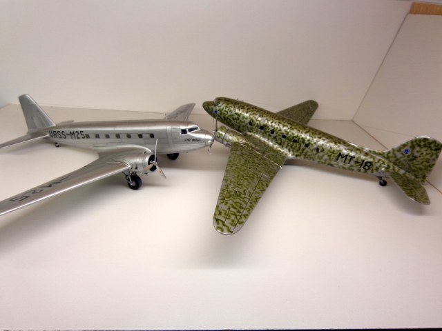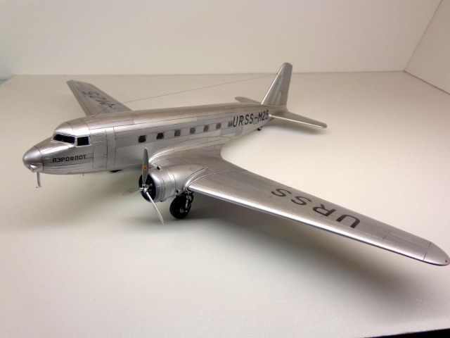 Модель чешских производителей, "МРМ", я приобрёл год назад. И довольно дорого она обошлась. Сегодня может и не купил бы уже. На первый взгляд, модель кажется незатейливой, небольшое количество деталей, отливки ЛНД без облоя и деформаций, кажутся изящными. Сборка была несложной, хотя получилось не очень удачной, например стык половинок фюзеляжа всё таки остался заметен. Посадочные фары опять у меня получились мутными. Чертежей этого самолета у меня не было, не нашел. Хороших фотографий советского "Дугласа" тоже не нашел, так что некоторые моменты пришлось делать наугад, додумывая по ходу дела. Кое-что, упущенное производителем пришлось добавить: пассажирские кресла, недостающие воздухозаборники, на окнах изобразил занавески, подправил ниши шасси. Мотогондолы д.б. подлинее, но я поленился и не исправил этот "косячок". "Родная" декаль с двумя вариантами гражданских авиакомпаний США не понадобилась, использовал только две малюсенькие эмблемы фирмы "DOUGLAS", остальное пришлось заказать. На сколько было возможно я стремился передать наиболее достоверней облик советского DC-2 с номером М25. Настоящий самолет не окрашивался, лишь полировался. Поэтому попытался также воспроизвести "панельный эффект". О постройке я уже поведал в "Сказках", поэтому хочу поблагодарить тех у кого модель вызвала интерес и положительные отклики, хотя это была обычная для меня "искаропка", без каких-либо "наворотов".
