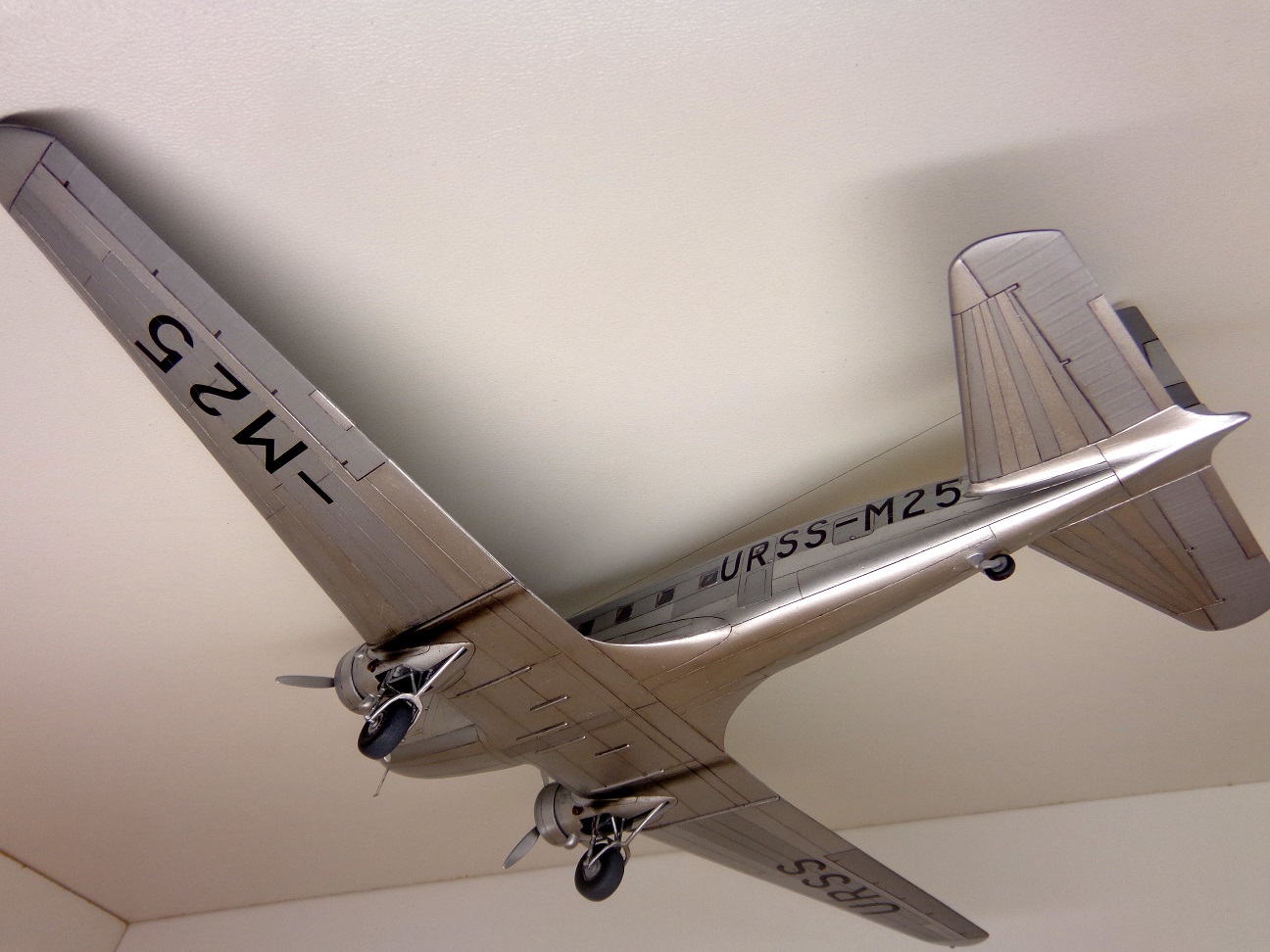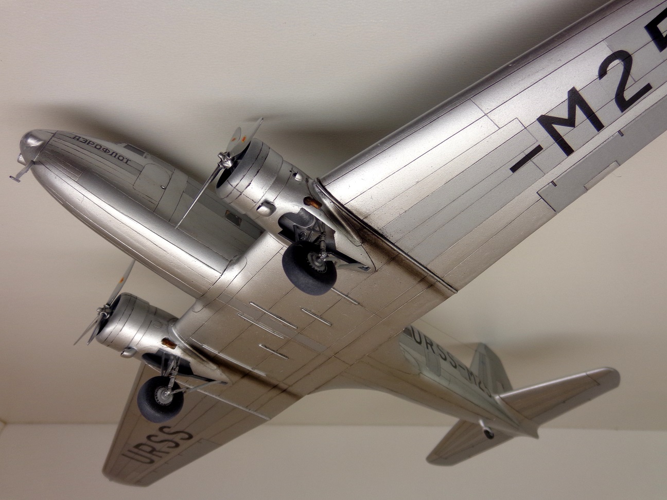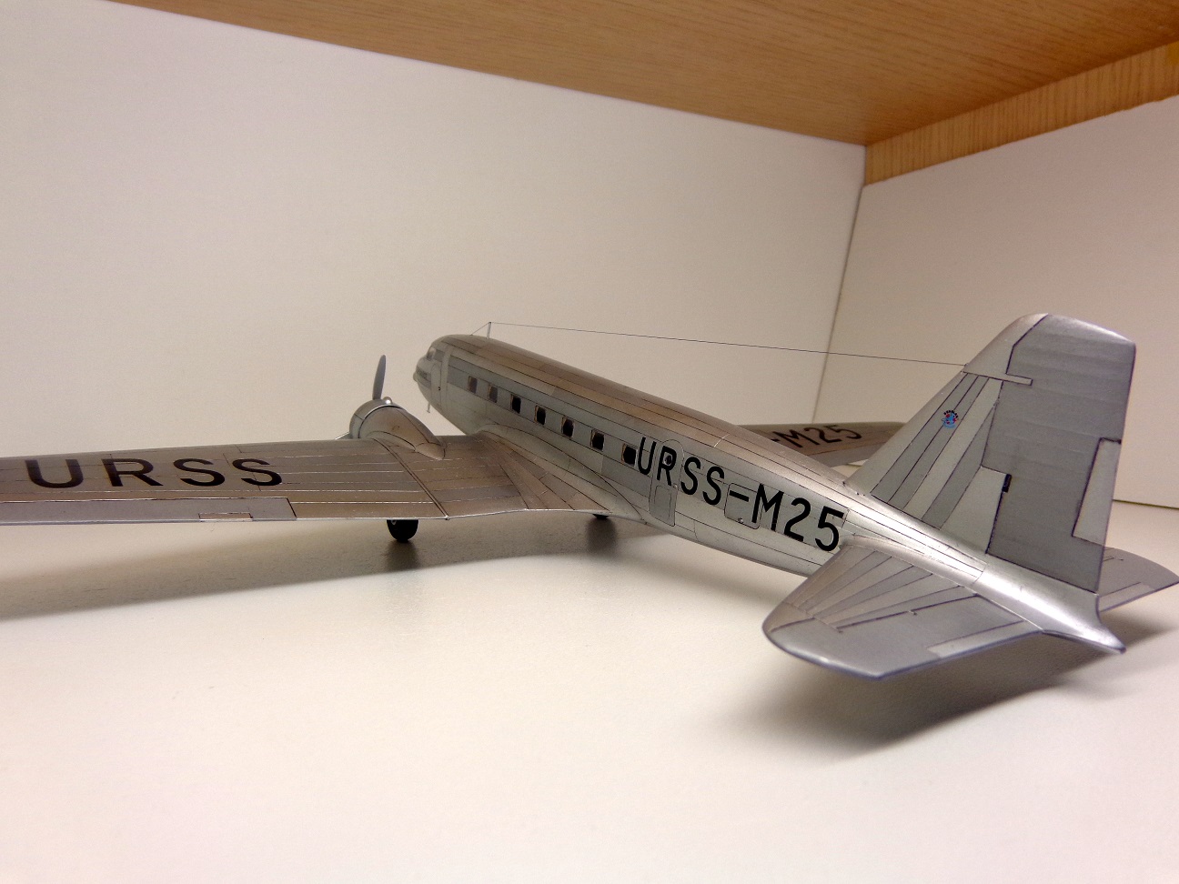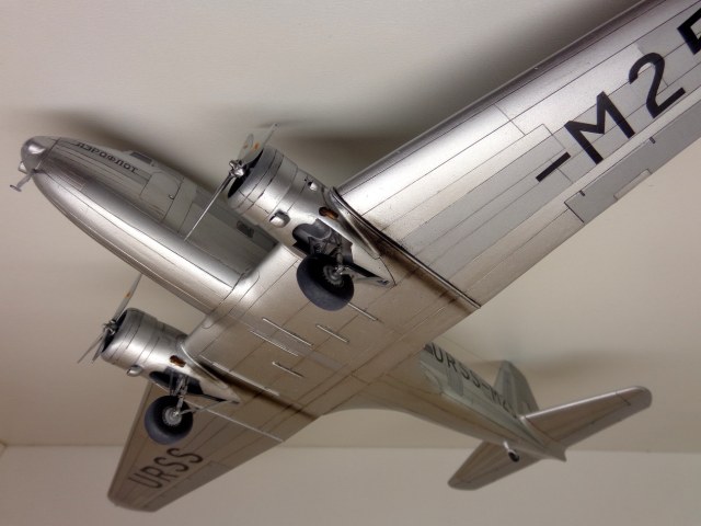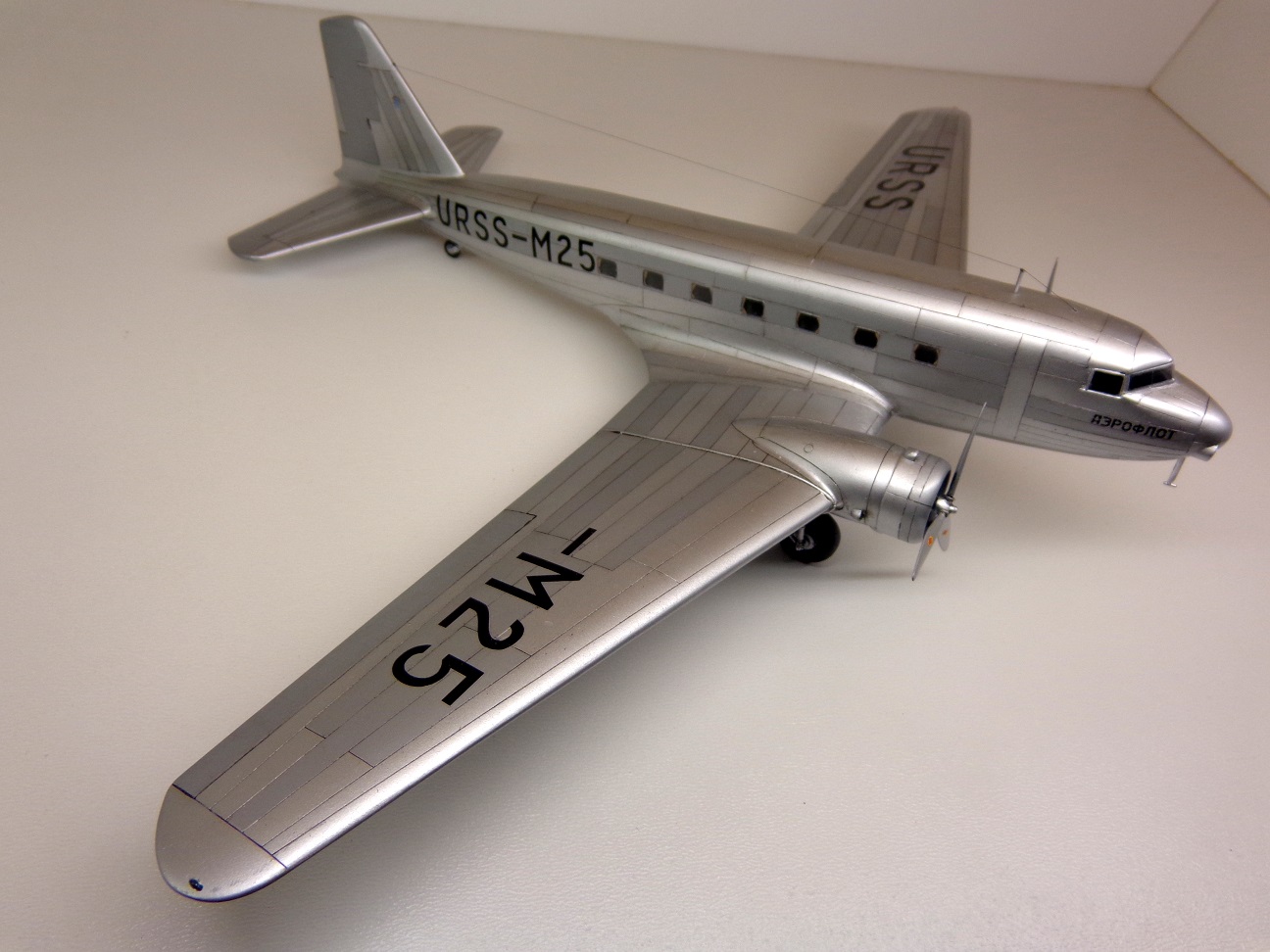 Модель чешских производителей, "МРМ", я приобрёл год назад. И довольно дорого она обошлась. Сегодня может и не купил бы уже. На первый взгляд, модель кажется незатейливой, небольшое количество деталей, отливки ЛНД без облоя и деформаций, кажутся изящными. Сборка была несложной, хотя получилось не очень удачной, например стык половинок фюзеляжа всё таки остался заметен. Посадочные фары опять у меня получились мутными. Чертежей этого самолета у меня не было, не нашел. Хороших фотографий советского "Дугласа" тоже не нашел, так что некоторые моменты пришлось делать наугад, додумывая по ходу дела. Кое-что, упущенное производителем пришлось добавить: пассажирские кресла, недостающие воздухозаборники, на окнах изобразил занавески, подправил ниши шасси. Мотогондолы д.б. подлинее, но я поленился и не исправил этот "косячок". "Родная" декаль с двумя вариантами гражданских авиакомпаний США не понадобилась, использовал только две малюсенькие эмблемы фирмы "DOUGLAS", остальное пришлось заказать. На сколько было возможно я стремился передать наиболее достоверней облик советского DC-2 с номером М25. Настоящий самолет не окрашивался, лишь полировался. Поэтому попытался также воспроизвести "панельный эффект". О постройке я уже поведал в "Сказках", поэтому хочу поблагодарить тех у кого модель вызвала интерес и положительные отклики, хотя это была обычная для меня "искаропка", без каких-либо "наворотов".
