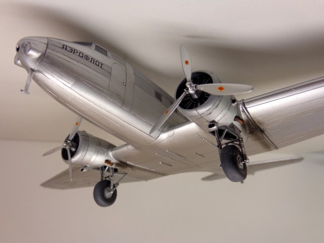 А вот контрастность "панельного эффекта", довольно спорная вещь. Всё зависит от освещенности, даже при рассматривании этой модели. После покраски мне даже казалось, что он мало заметен. Так как при ярком свете ламп он вообще почти пропадал. И я предполагал, что когда буду фотографировать модель, из-за этого ничего не будет видно. А вот как, например, выглядел один из первых советских DC-3.