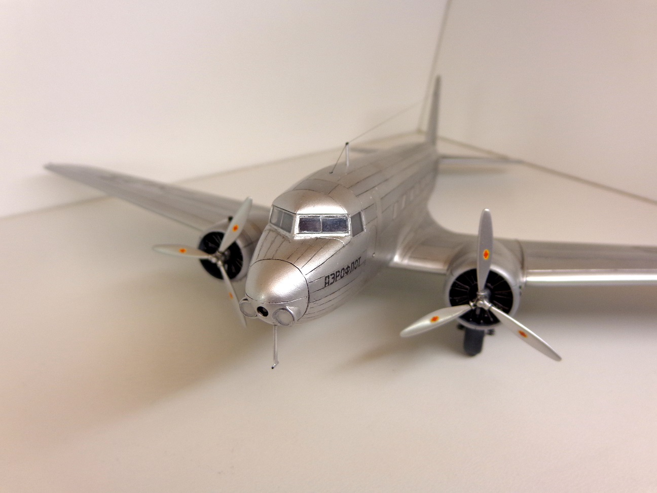 Владимиру Шутову - да, двигатель однорядный, и с капотом, где он прячется, кажется всё в порядке. Но вот сама мотогондола кажется короткой даже, если рассматривать фото настоящих DC-2. Чертежей же у меня не было, поэтому это чисто зрительные умозаключения. Окрашивал двумя серебрянками, Тамия и Валехо.