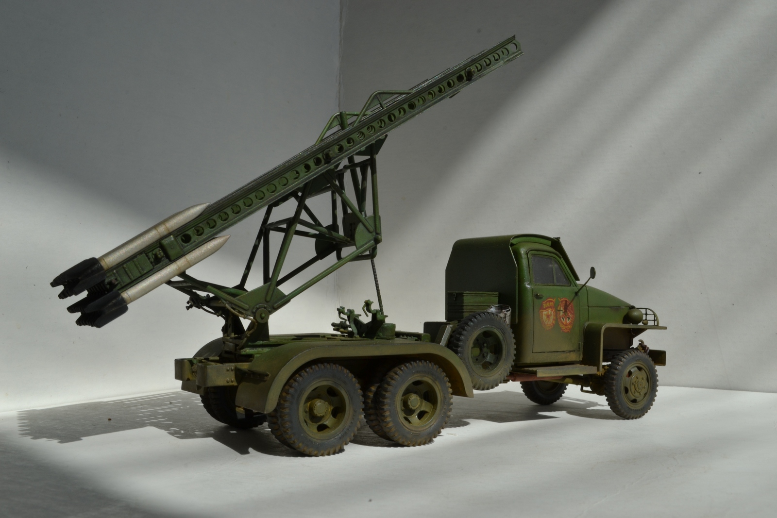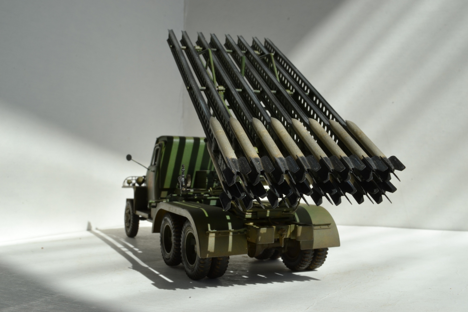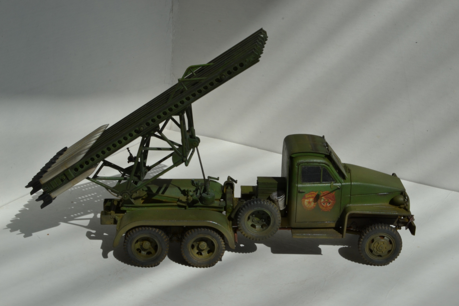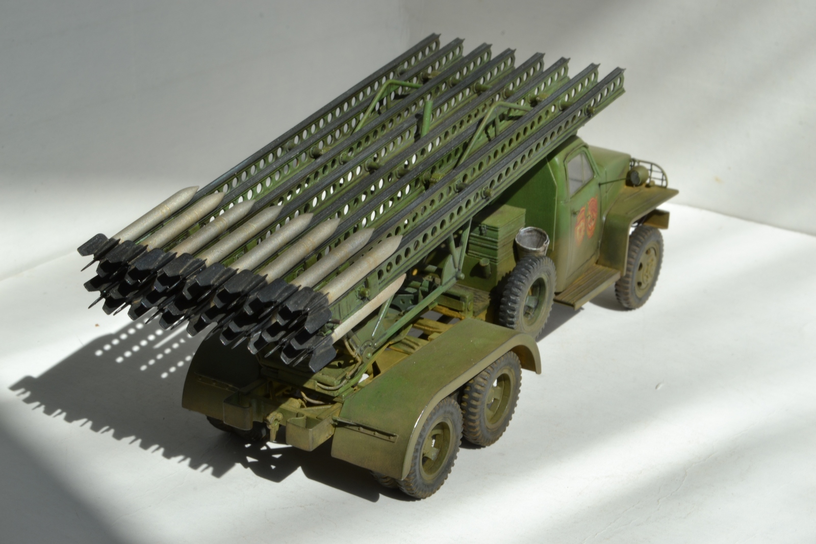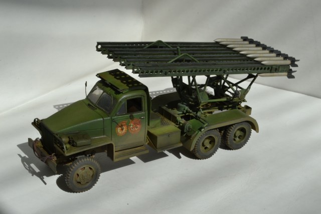 Немного истории. После успешных испытаний в марте 1941г., 21июня1941г. была принята на вооружение БМ13 получившая прозвище "Катюша". Первый залп по врагу был произведён 14июля1941г. в 15ч.15мин. в районе Орши батареей реактивной артиллерии под командованием капитана И.А.Флёрова. С весны 1942г. реактивный миномёт устанавливался на ввозимые по ленд-лизу полноприводные шасси. Наиболее известным среди них стал Studebaker US-6/ C 1943г. БМ-13 получила индекс "Н" - нормализованная.