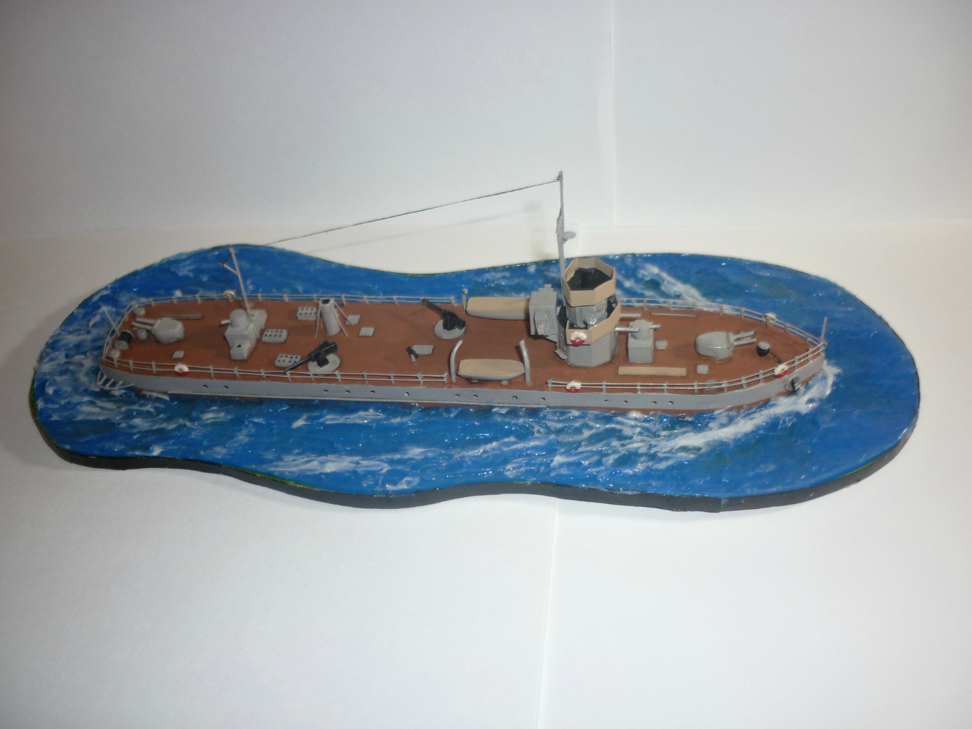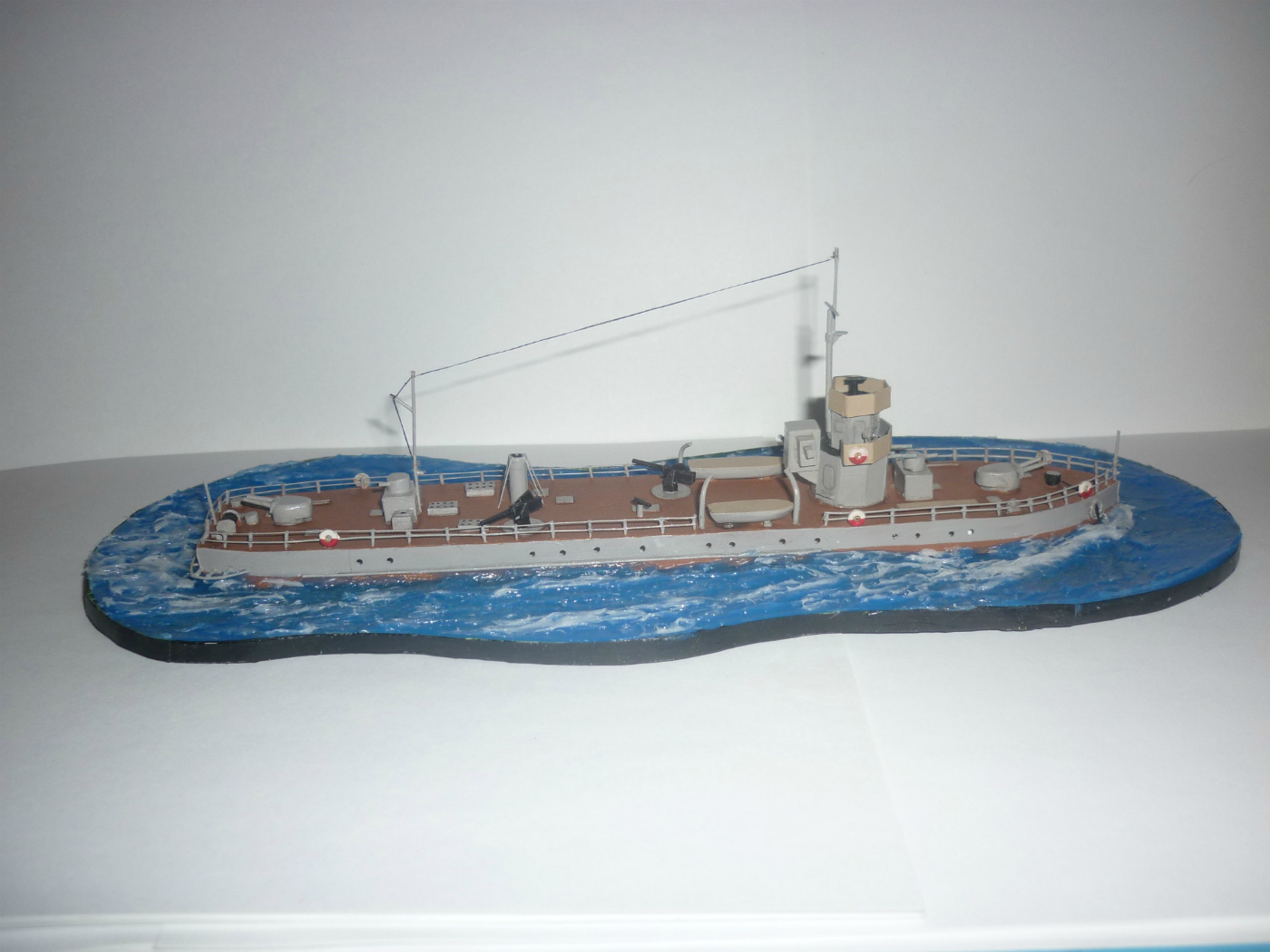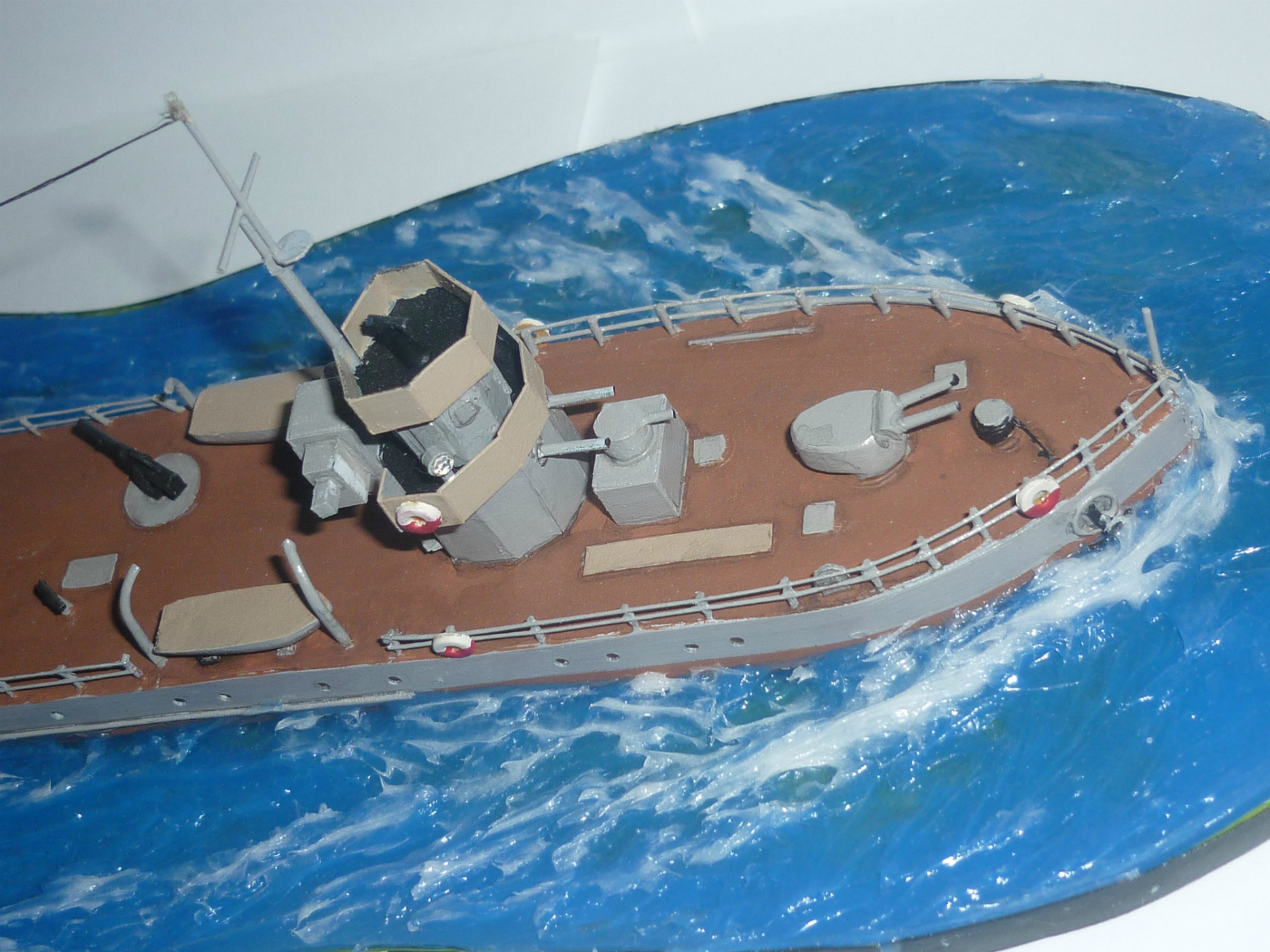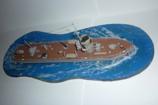 По самой модели даже не знаю чего и рассказать. Делал исходя из возможностей. Единственное, что бы переделал - ограждения рубки. Нужно было все таки сделать их открытыми из тянутого литника.