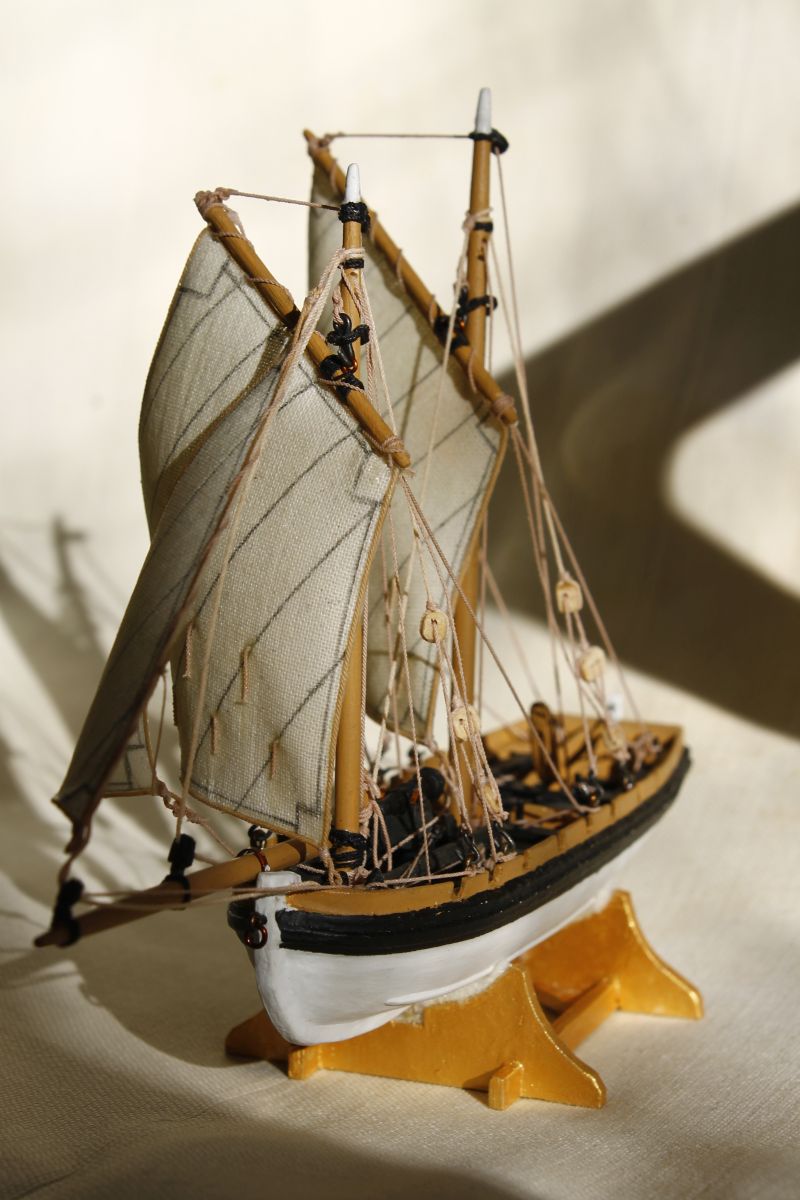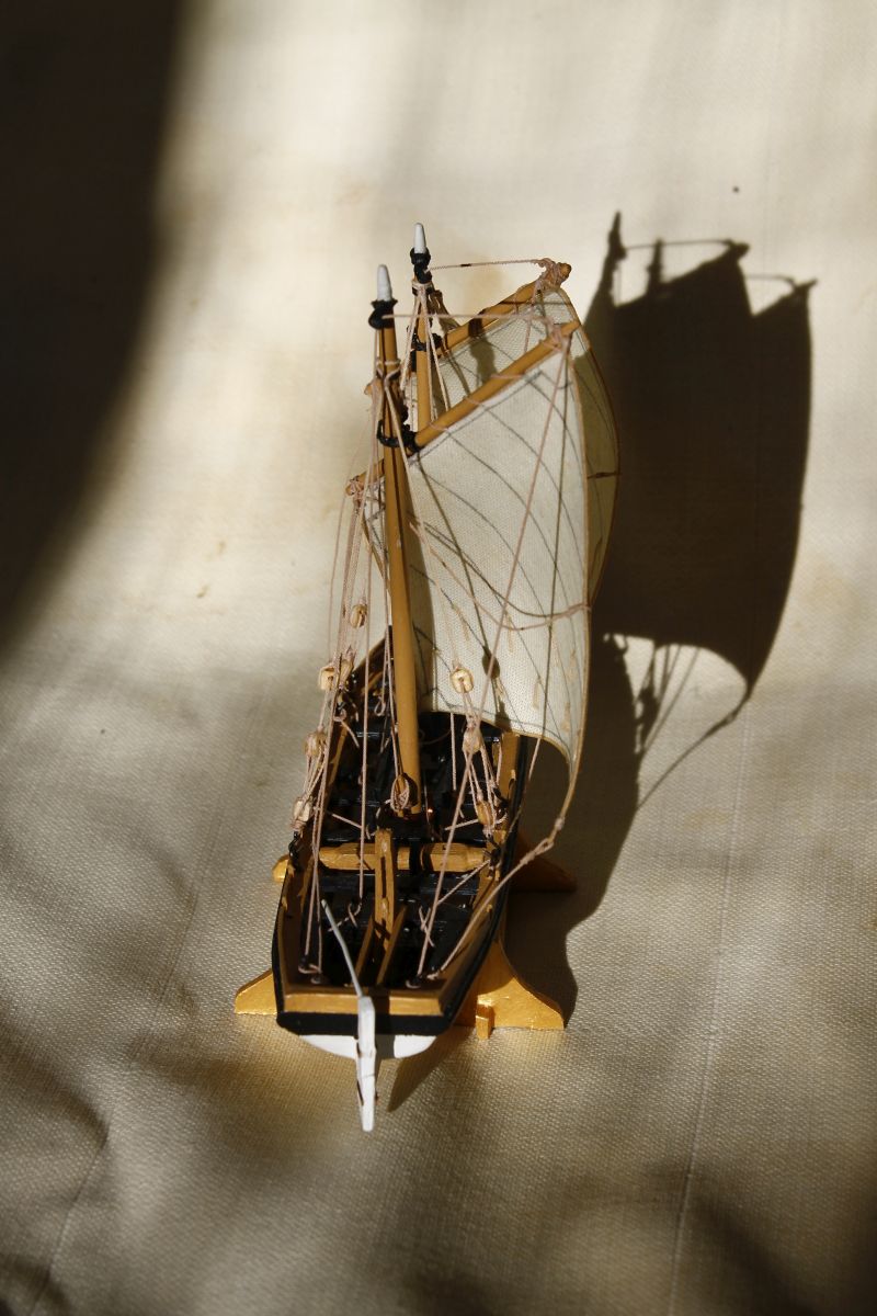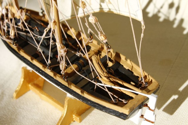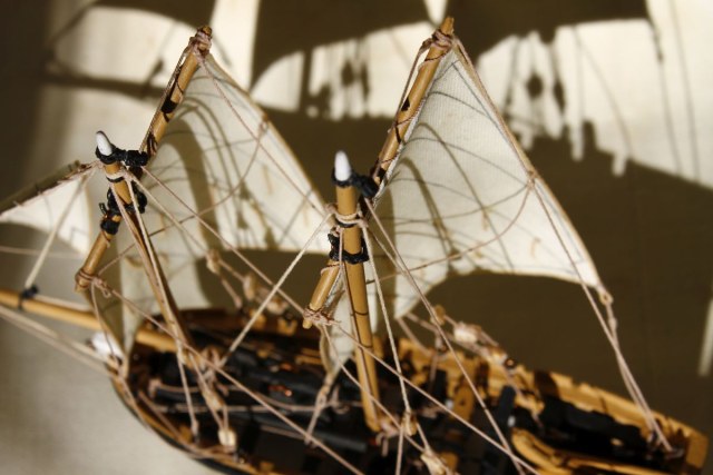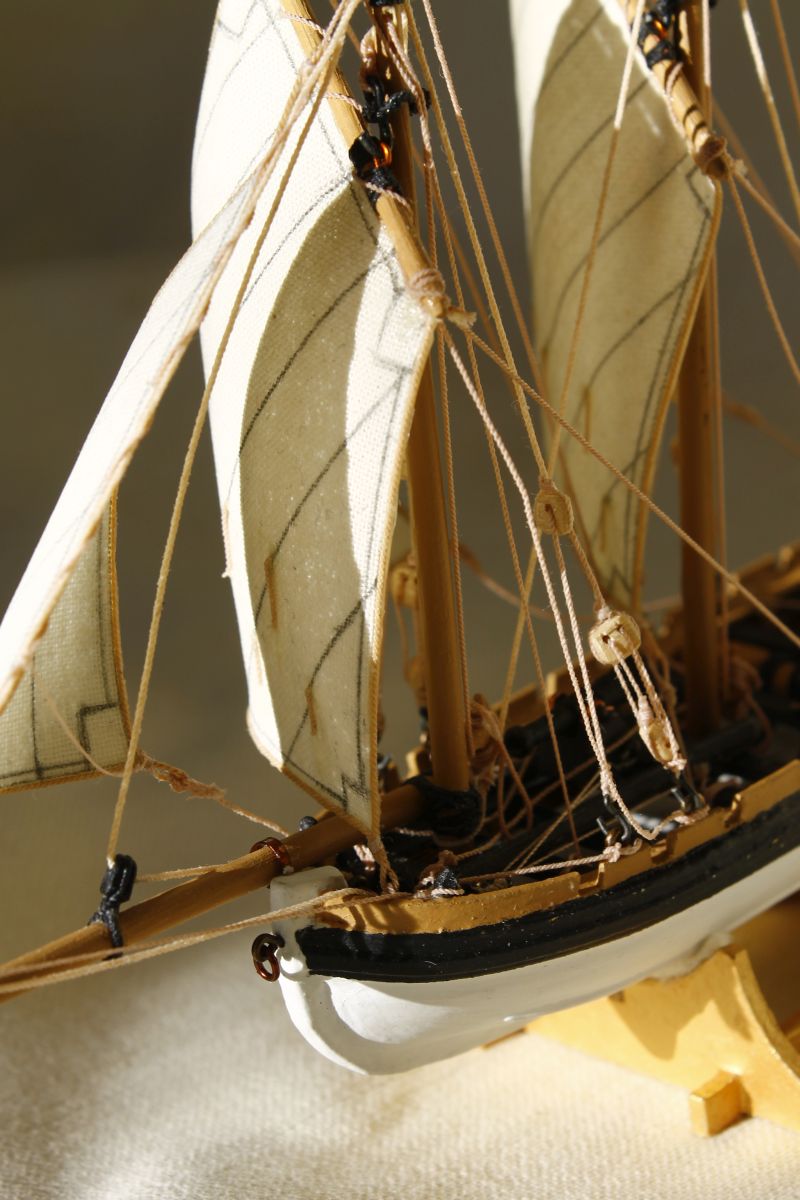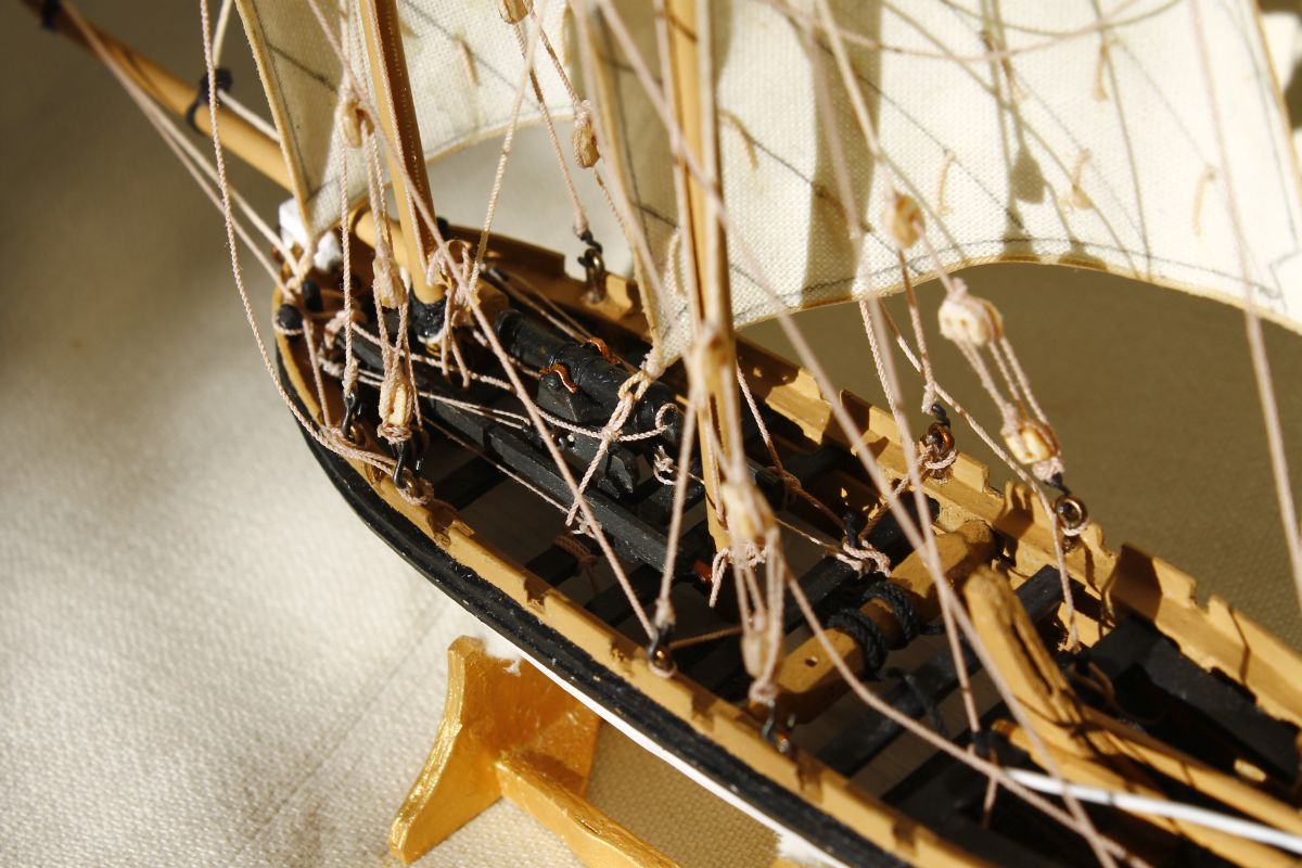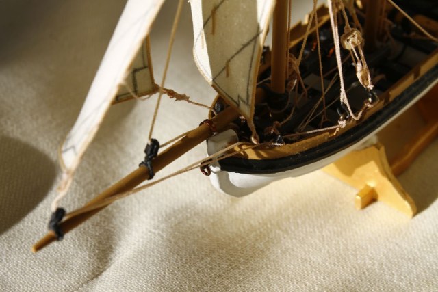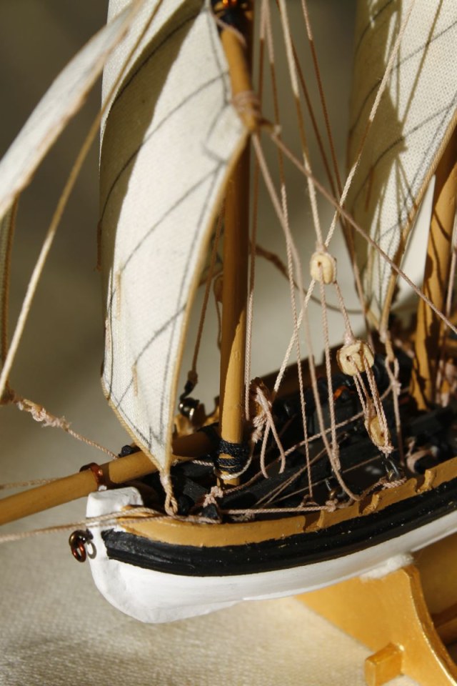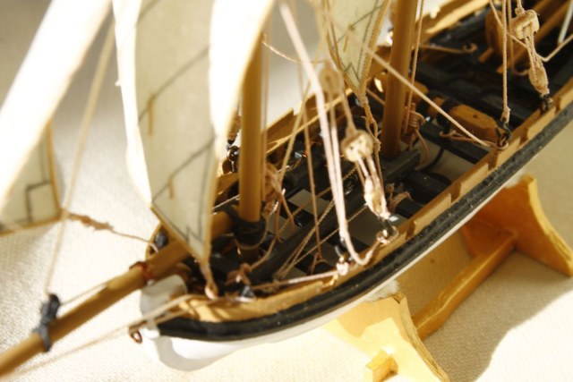 Используемые нитки,судя по фото,скорее самодельные канаты, тоже, большей частью переразмерены, такелаж для подъема рей похоже не совсем верно показан.