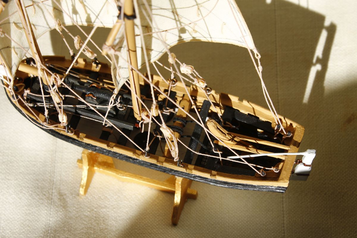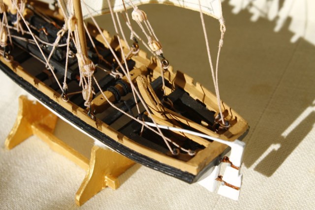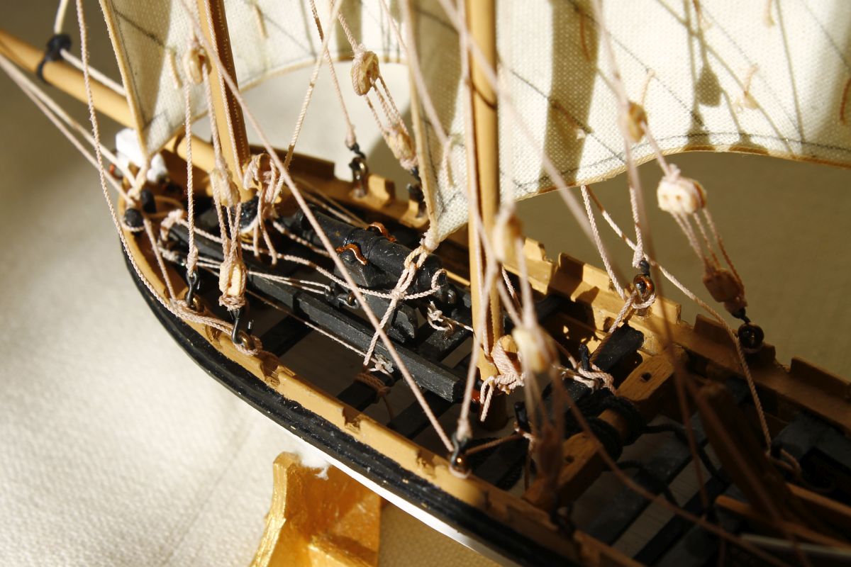 Понравилось то, как смотрятся канаты и приклеен лик трос нампарусах...не понравилось то,что все почти элементы такелажа немасштабны...те двойственное ощущение,вроде такелаж аккуратно поставлен,но по размерам тросов,блоков,крюков и тп...вообще не вписывается...если 2мм блоки что есть в продаже, в лавке корабелла к примеру, велики...то надо было самому сделать...посидеть чуток...наточить из пластика...там то их немного надо.