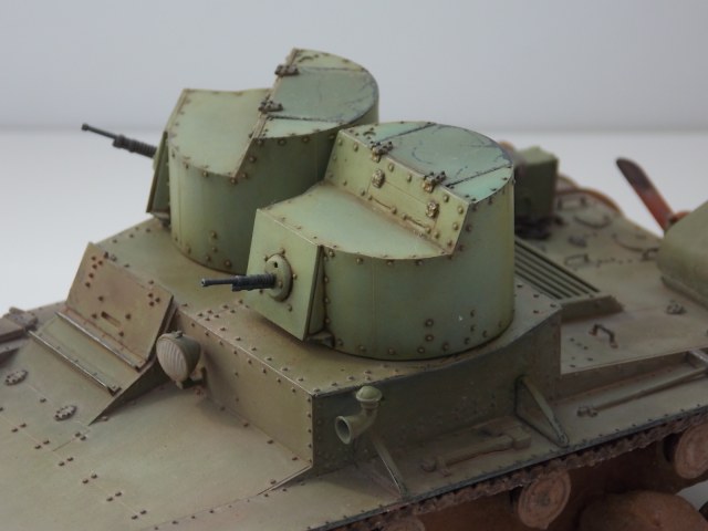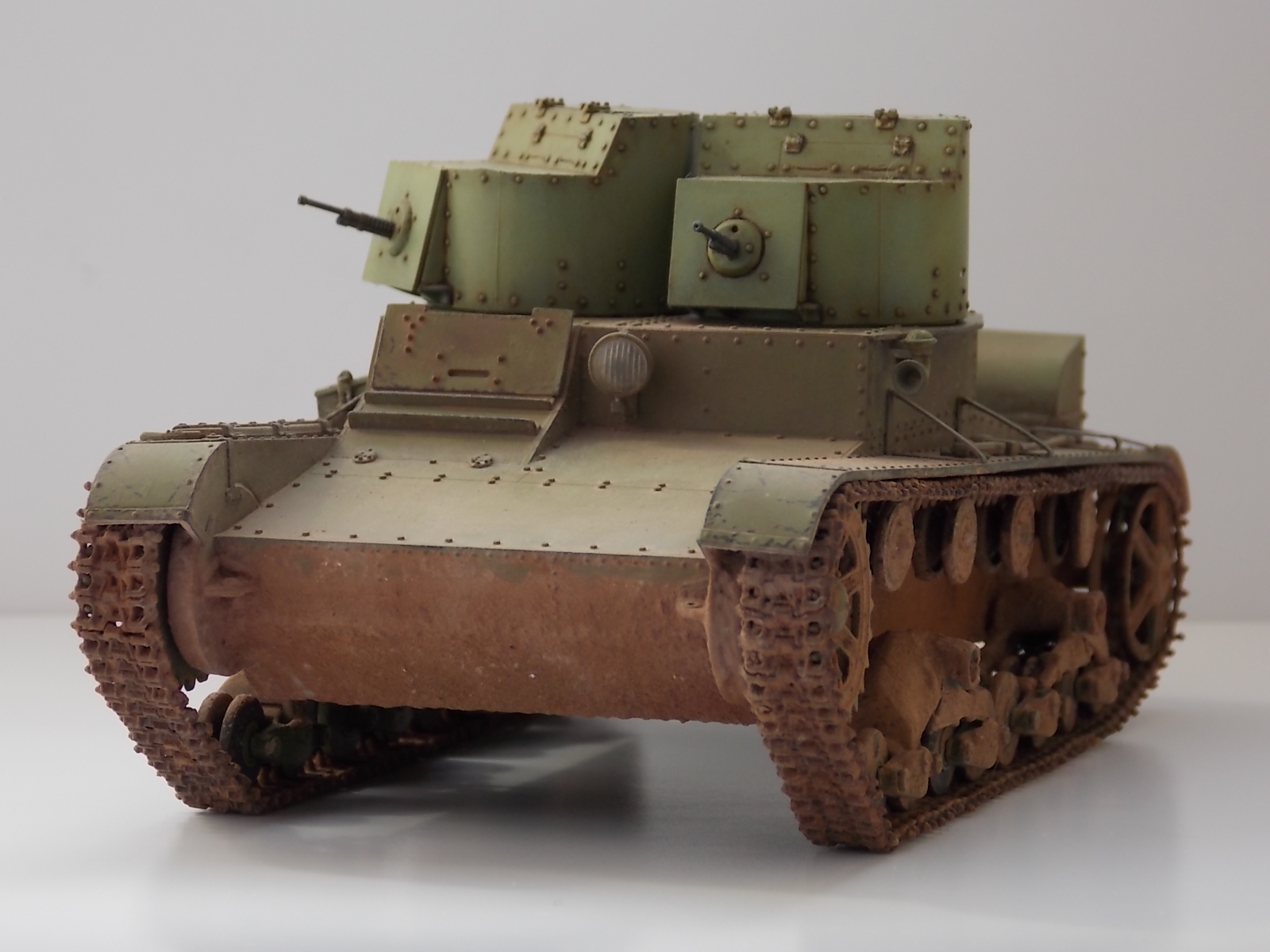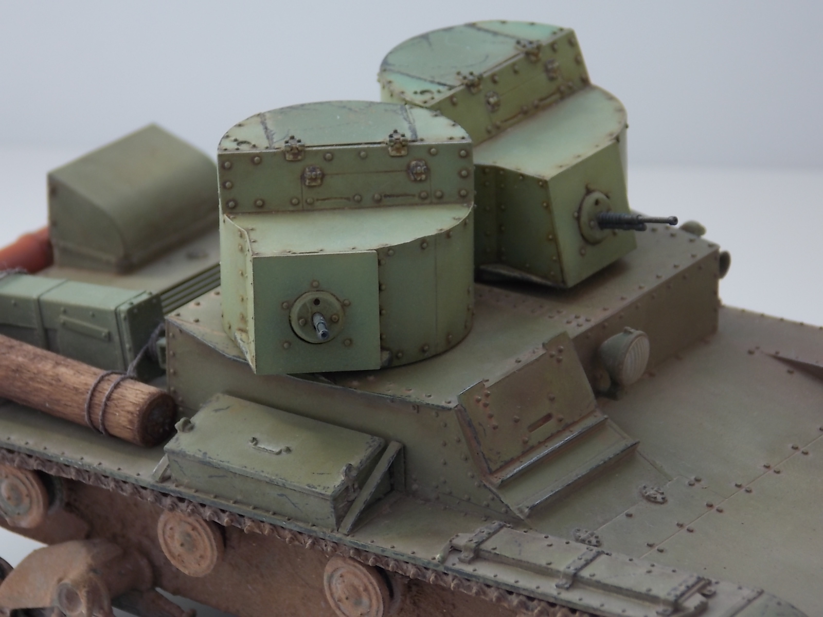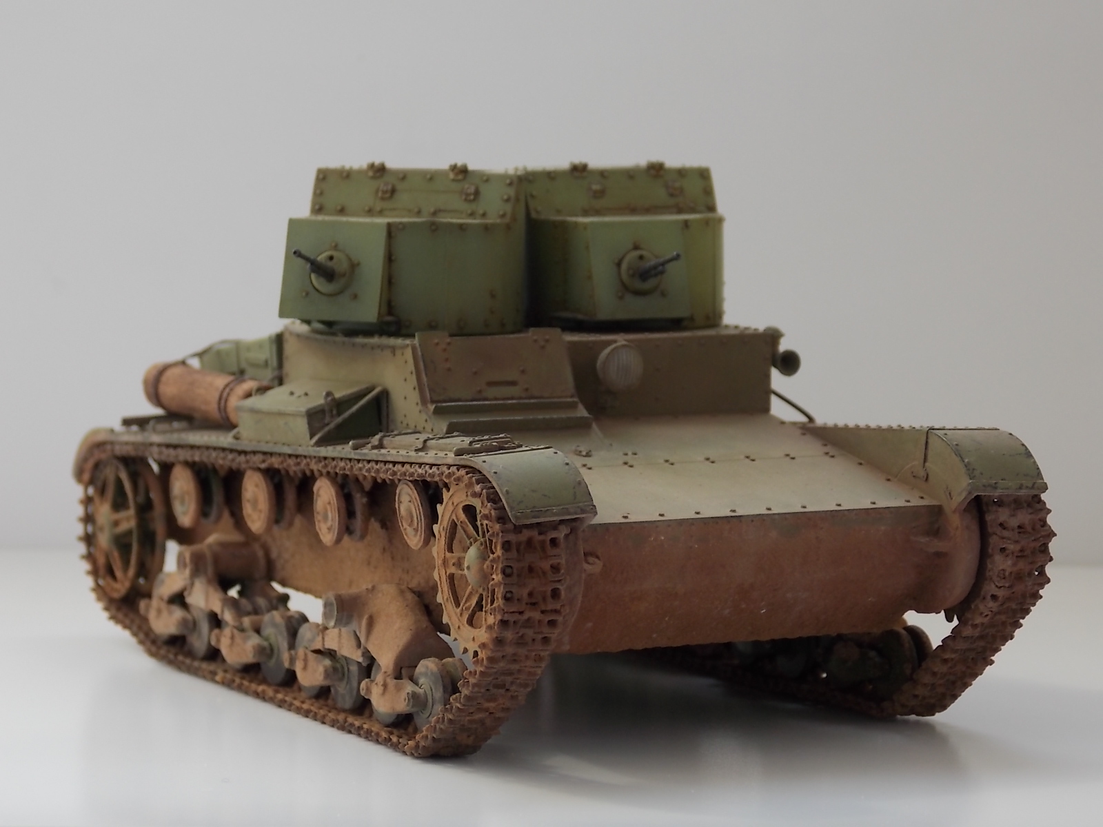 Хорошее исполнение, довольно грамотное и ненавязчивое запыление. Я бы только прошелся "ган металлом" по гребням траков и изобразил натертую полоску от катков на лентах гусениц. Немного напрягает разный оттенок цвета корпуса и башен (может, при ремонте из двух один танк собрали), но это даже какой-то интересный нюанс вносит. Единственные вопросы - это по матчасти (не в укор, а в качестве рассуждения))) - у "ХБ" стоит "ленивец" нового образца (с оребрением), а на двухбашенных должен быть старый, без оребрения. Можно, конечно, допустить, что в результате капремонта его заменили, но обычно, к примеру при ремонте ХТ-26, меняли полностью ходовую - ставили катки со съемной грузошиной и новый "ленивец". А вот подвергались ли "капиталке" обычные двухбашенные - вопрос... Ну и присутствие щитка МВ с защитой петель на немодернизированной машине - тоже вопрос, хотя на ХТ-26 их тоже ставили. Но в целом - очень понравилось.