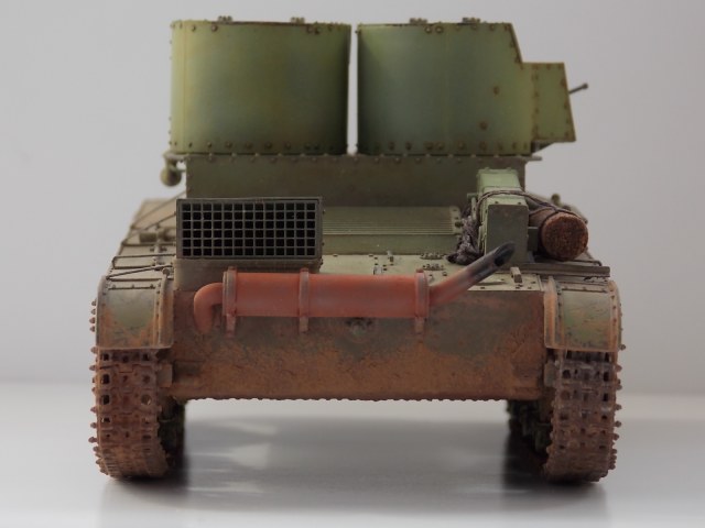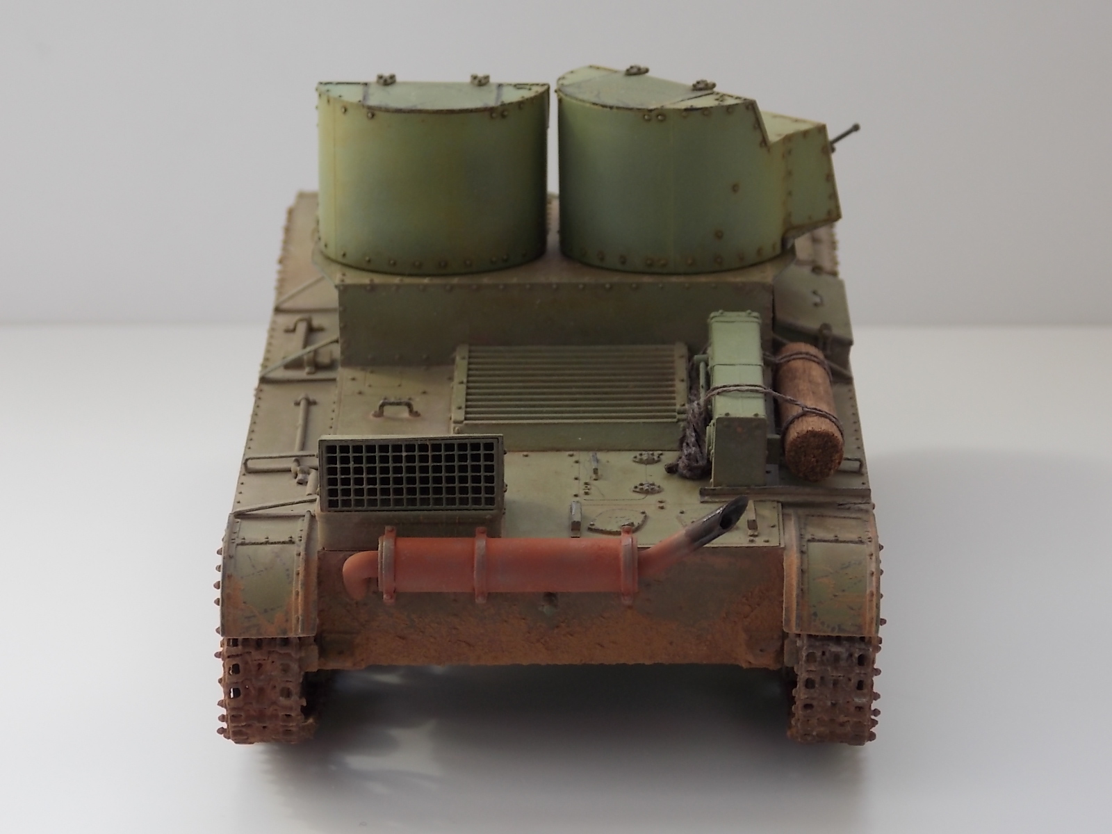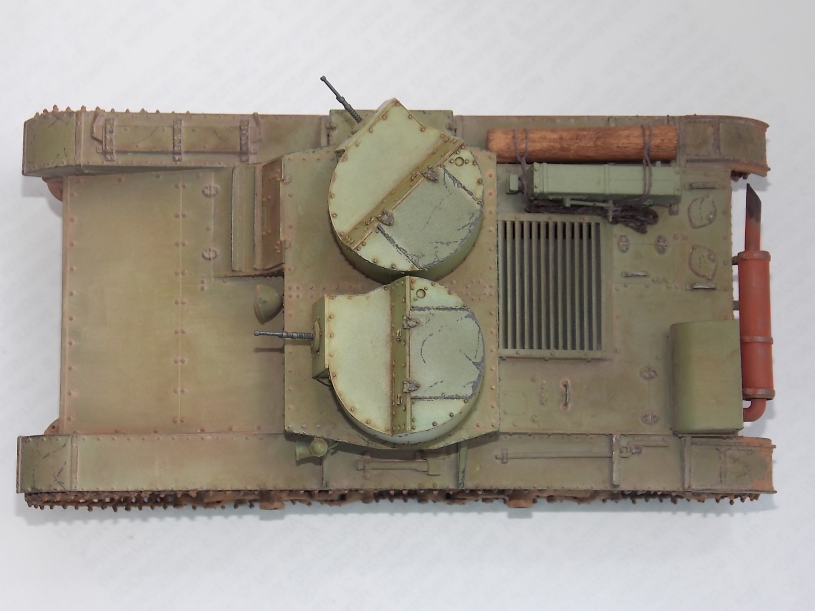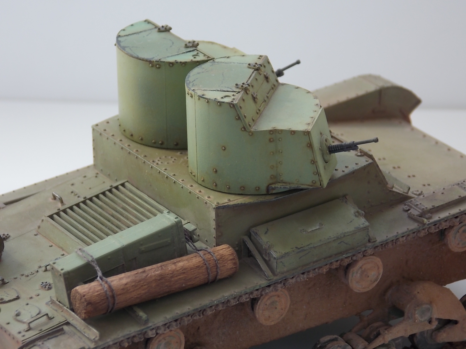 Хорошее исполнение, довольно грамотное и ненавязчивое запыление. Я бы только прошелся "ган металлом" по гребням траков и изобразил натертую полоску от катков на лентах гусениц. Немного напрягает разный оттенок цвета корпуса и башен (может, при ремонте из двух один танк собрали), но это даже какой-то интересный нюанс вносит. Единственные вопросы - это по матчасти (не в укор, а в качестве рассуждения))) - у "ХБ" стоит "ленивец" нового образца (с оребрением), а на двухбашенных должен быть старый, без оребрения. Можно, конечно, допустить, что в результате капремонта его заменили, но обычно, к примеру при ремонте ХТ-26, меняли полностью ходовую - ставили катки со съемной грузошиной и новый "ленивец". А вот подвергались ли "капиталке" обычные двухбашенные - вопрос... Ну и присутствие щитка МВ с защитой петель на немодернизированной машине - тоже вопрос, хотя на ХТ-26 их тоже ставили. Но в целом - очень понравилось.