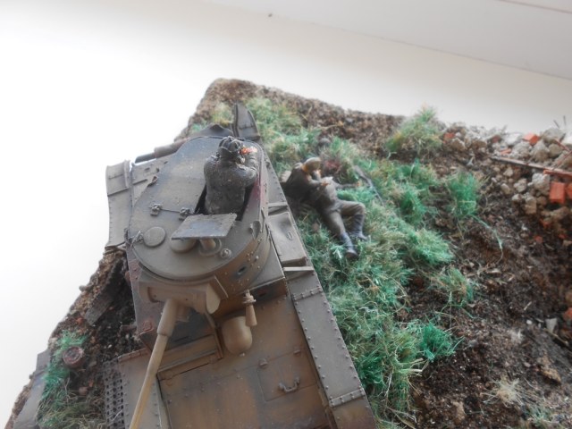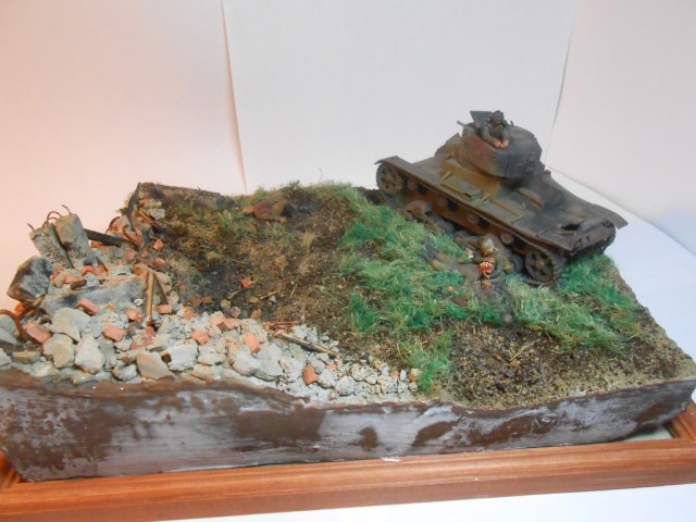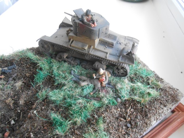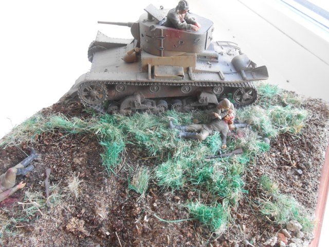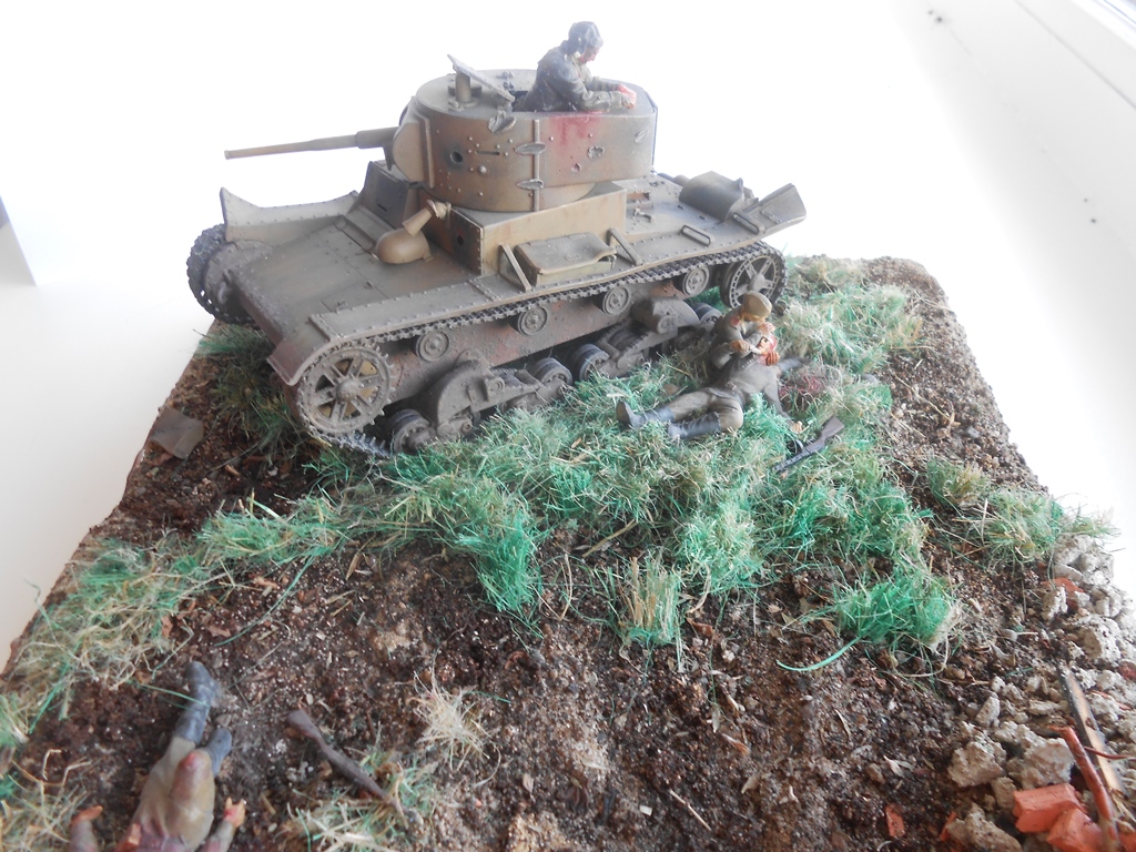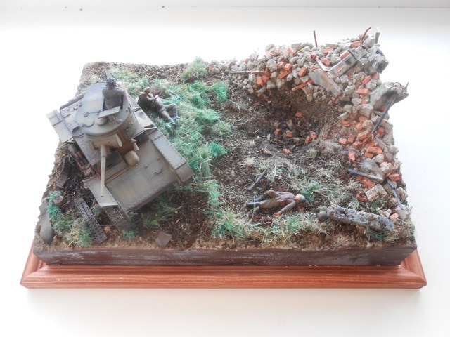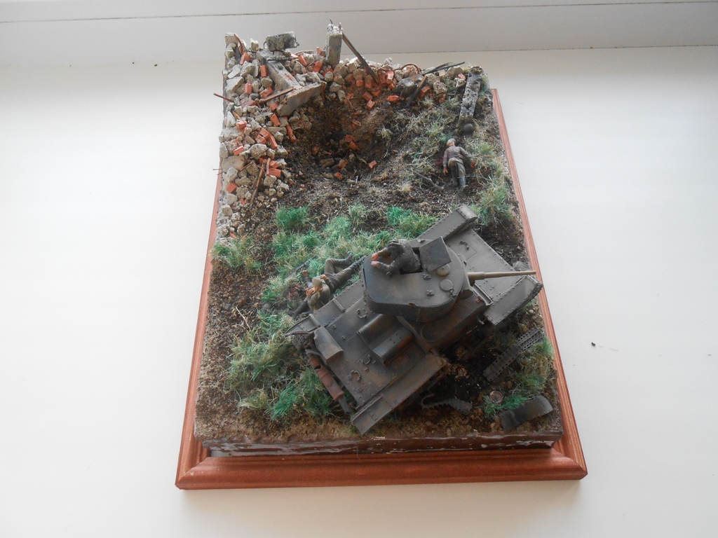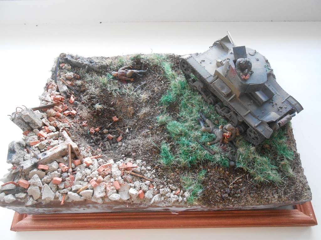 Диорама очень трогательная, но исполнение, к сожалению, только для раздела Песочница. Очень слабо исполнено, танк, фигурки, подставка да и сама композиция.