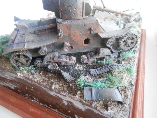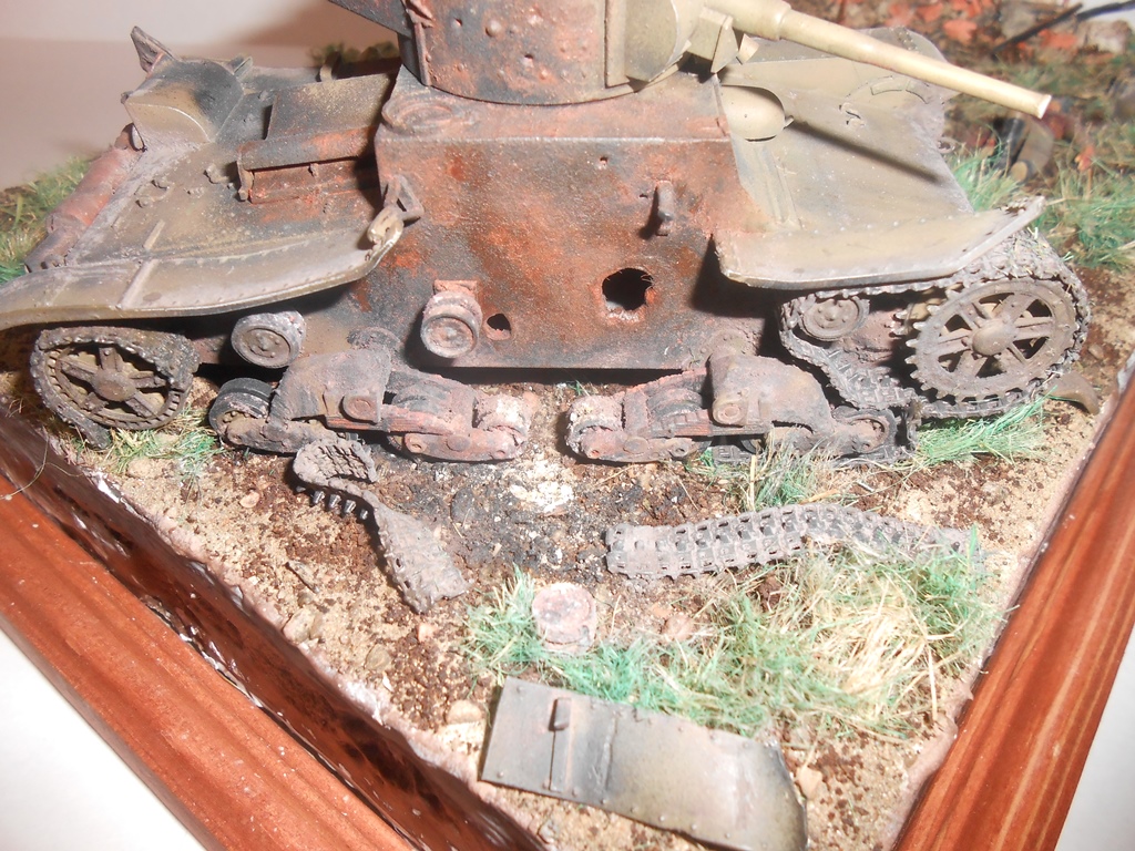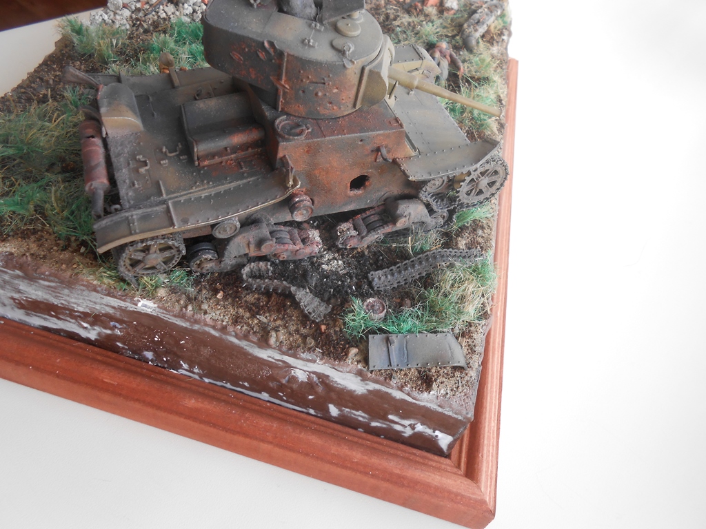 Уважаемые коллеги позвольте также немного высказаться и несколько прояснить ситуацию. Как уже говорилось в описании абсолютно все собиралось "из коробки". Основная задача была передать атмосферу войны, трагизм ситации, героизм солдат. В мат.часть не углублялся в принципе. Так как полумеры не люблю а исправление неточностей и создание модели-копии а не игрушки занимает много времени, коего немало уходит на изучение предмета моделирования. Неточностей выше крыши и заметны невооружонным взглядом (танк образца 1933 года, а бойци меж тем в погонах. Не силен в этой части истории но думаю до 43 мало Т-26 подобной модификации дожило. Это то что очевидно). Да решетка радиатора торчит как броне лист. По поводу снаряда в очередной раз поясню - это не снаряд такого калибра а оторванный каток, который лежит рядом если обратить внимание. Вот одно из фото используемых при работе. Огрехи с броней также устранять не стал так как модель была почти готова и переделка нарушает сроки. После термического воздействия металл ражавеет быстрее и намного, а захоронение, тем более на оккупированных террриториях не всегда производилось вовремя. Если присмотреться - танкист мерт. Наиболее вероятная причина смерти - получение огнестрельных ранений груди во время покидания машины. об этом свидетельствует кровь под ним и ее подтеки на башне. Плюс термические повреждения на его спине в виде растрескиваний кожных покровов.