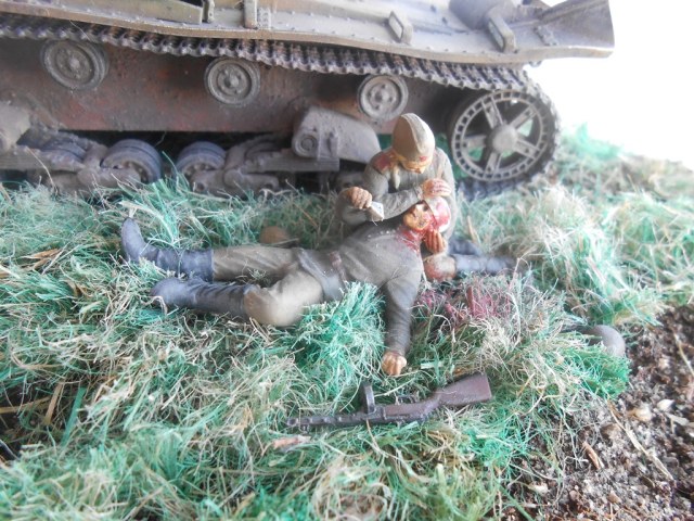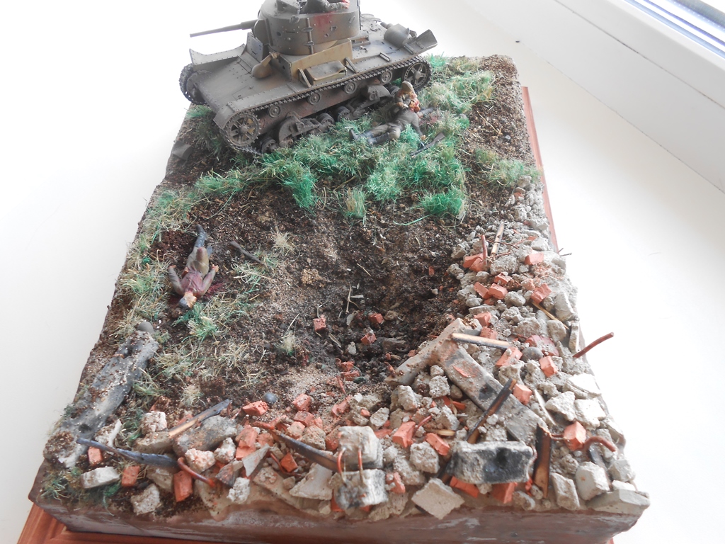 Доброго времени суток. Представляю на ваш суд диораму изготовленную к 9 Мая, на горнизонную выставку. Сюжет не особо праздничный - подбитый танк, погибший член экипажа и боец с десанта, тяжело раненый офицер умирающий на руках медсестры и передающий ей письмо семье. Сюжет из головы. Исторической привязки не имеет. Один из возможных эпизодов войны.
