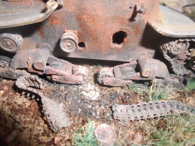Пробоину,бы чуток поменьше, она к тому же, неестевственно оплавлена. Зрелищнее был бы пролом, а тут, вроде как прожгло. И трава вокруг танка немного неестевственного цвета, было бы лучше ее зделать такой же, как участок с травой у камней. Крышку от ящика ЗИП и крылья лучше сделать их толстой фольги,- тогда можно причудливо выгибать и мять,-зрелищней будет. А так,задумка хороша.С Уважением!