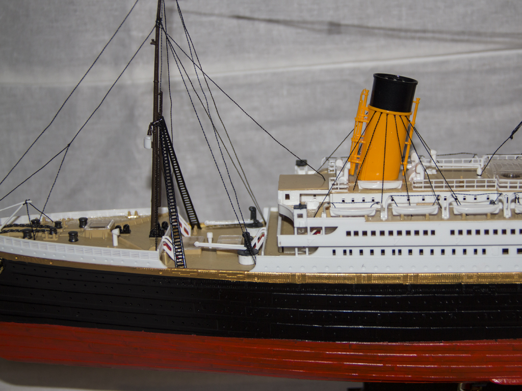 Не хватает вида с носа и кормы, зато много фотографий филейной ( средней) части. Стойкое ощущение что не окрашены трубы, палуба и белые надстройки. А световые люки вообще прозрачные детали без намёка обозначения переплёта и не только над курительным салоном и рестораном, но и над грузовыми трюмами. Глянцевая краска для подводной части- не самый хороший выбор.Просвечивает чернота корпуса. Зато есть попытка изображения такелажа. Нитью одного диаметра весь такелаж передать невозможно, нужно подбирать по диаметру не ворсистые нити, лески. Автор сам сказал, что учится на ошибках. Некоторые из них озвучены.