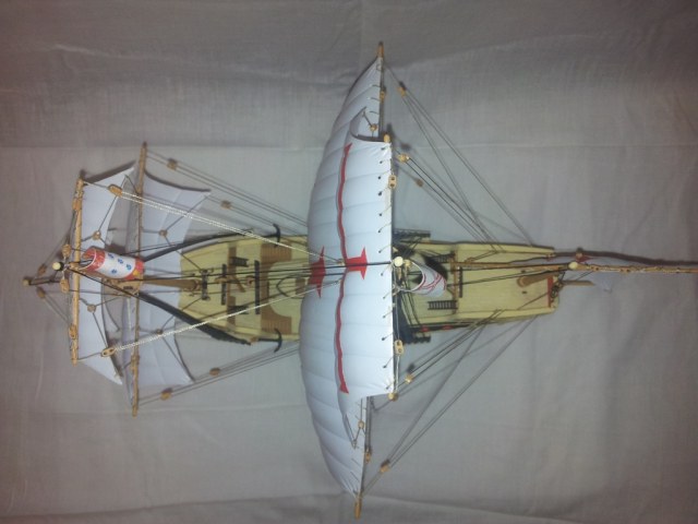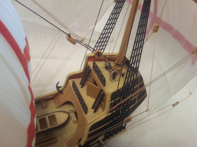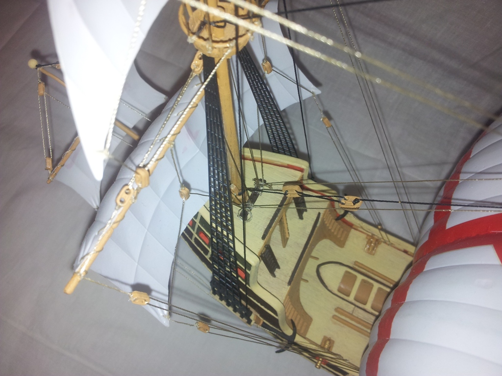 Для первой модели очень аккуратно собран (по инструкции). Мой такой же на песочной мели лежит. А на счёт флагов в этой модели: их трудно поставить на место из-за их размера и проводки такелажа. Я, например, не особо парюсь по поводу неправильного направления флагов. (Исправил "паруса" на "флаги", потому как про флаги и хотел написать, а голова была забита парусами.)