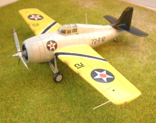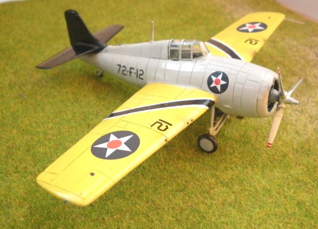 Окраска соответствует раннему F4F-3, а капот позднему. Если самолет ранний, то прицел должен быть в виде трубки. Фюзеляж окрашивался металликом, крылья желтым только сверху, снизу - металлик. Нижние рычаги шасси - черные. ПВД на самолете от F4F-4, у F4F-3 - он прямой, выходит из передней кромки крыла. Нету строевых огней на верхних плоскостях и "спине" самолета.