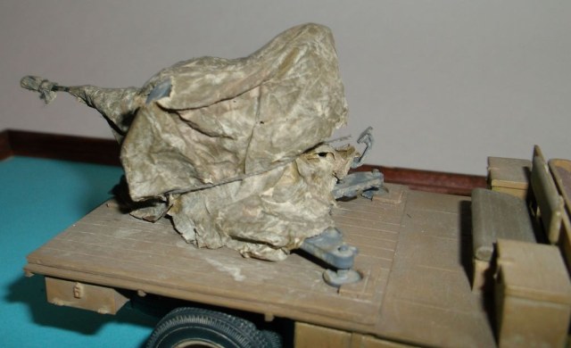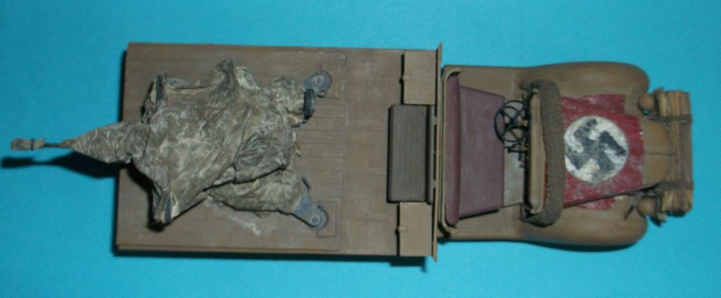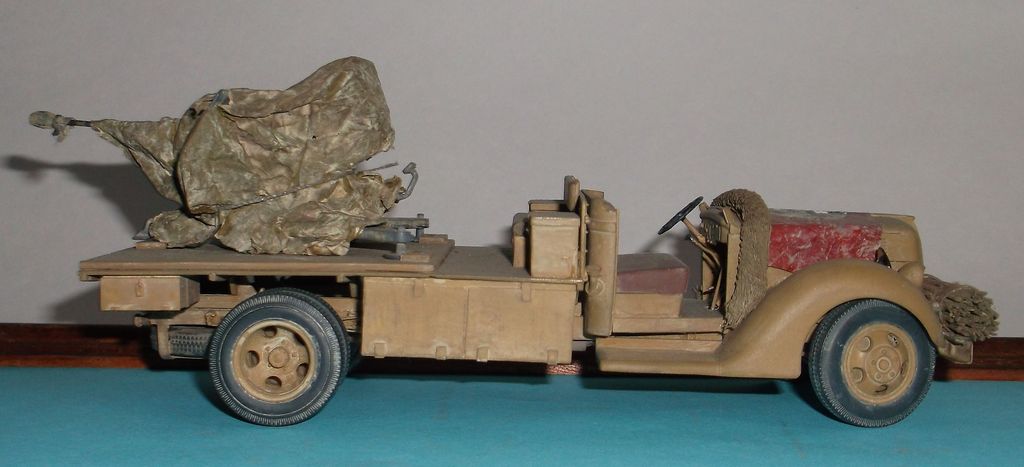 Выставляю работу двухгодичной давности (ну что поделать, урожайный у меня тогда год был). Изначально я хотел изобразить трофейный французкий Мэтфорд (копия немецкого Форда), но ничего не нарыл окромя двух фотографий. Тогда включил своё больное воображение и сотворил вот это. Аппарат собран из коробки, заменил только передний бампер на конкретный швеллер. Зениточку заботливо укутал в брезент (обувная бумага), чтобы пылью и песком не попортило. К сожалению машинка не убереглась от варварского обращения. От мокрых (потных) пальчиков поплыла свастика. Реставрировать не решился. Вот, собственно, и всё (пока).