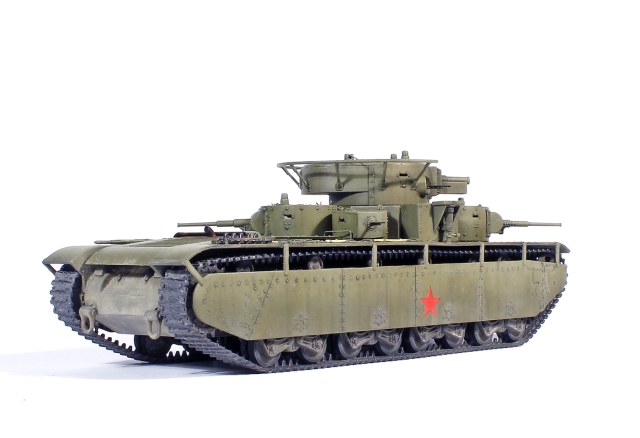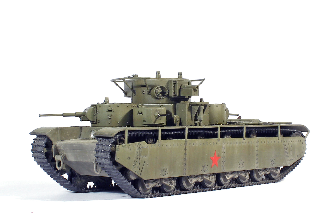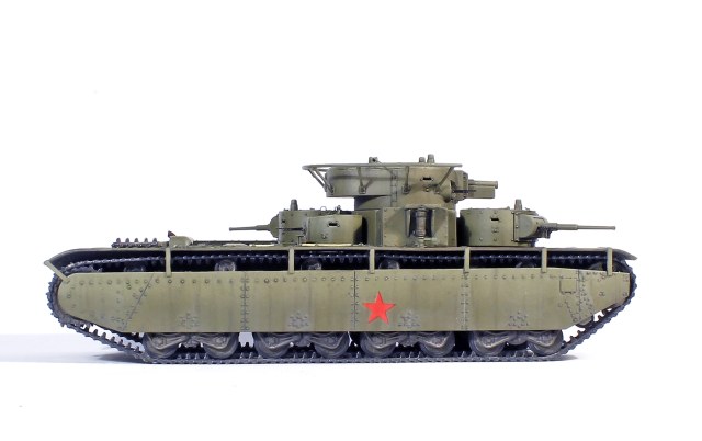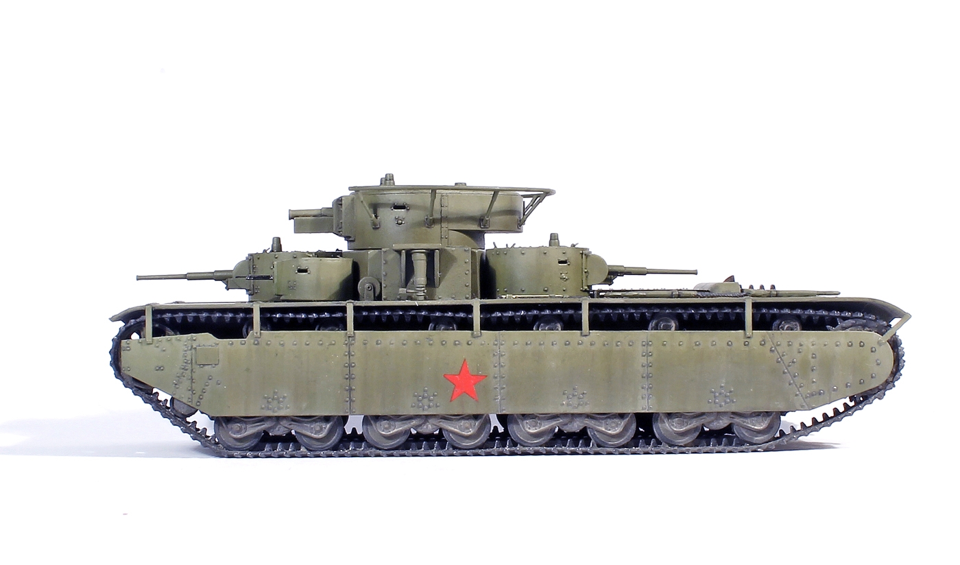 Можно немного поворчать? Я конечно понимаю, что матчасть на данном ресурсе не в почете, но не до такой же степени. Ведь ничего не стоило убрать смотровую щель и пистолетный порт с левого борта средних башен, сделать узкую смотровую щель (или совсем убрать, поскольку в 72-м масштабе ее толком и не видно)и убрать пистолетный порт с правого борта пулеметных башен, в одно движение мелкой наждачкой вынести приговор заклепкам на броненакладках главной башни (на Т-35, в отличии от Т-28, никогда не было клепено-сварных башен) и просверлить отверстие под "панораму" в броневом щитке маски КТ-28 ....