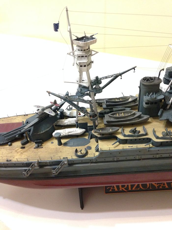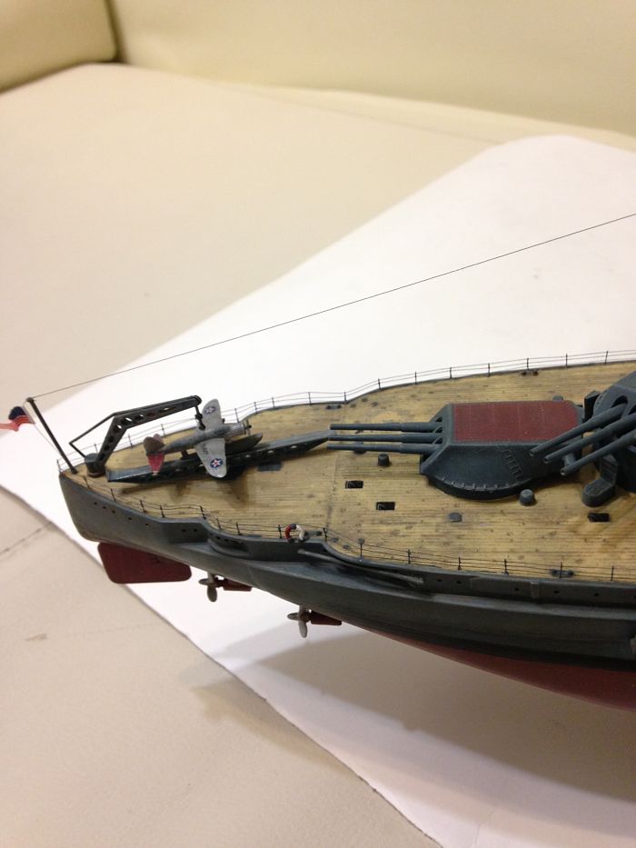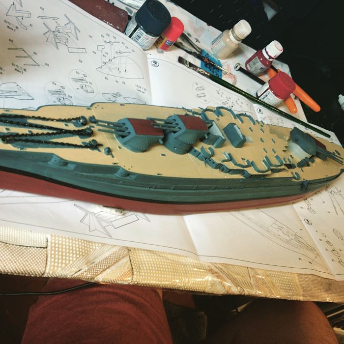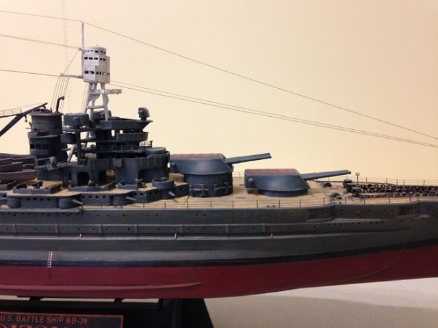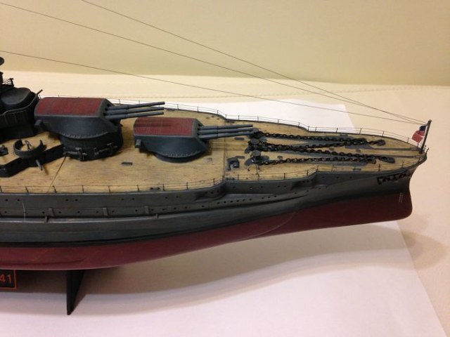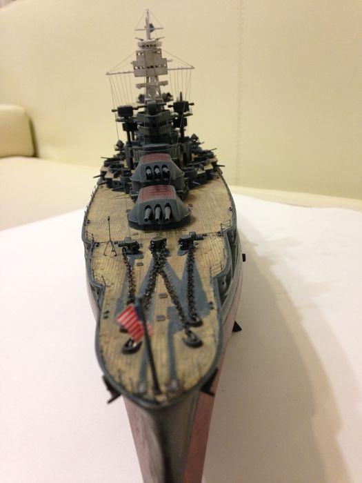 Просматривали ли вы чертежи данного линкора? Сам пластик несколько неверно отлит у производителя, особенно это касается кормовой мачты, и у вас она вроде установлена немного криво. По части окраски никаких претензий нет, всё окрашено очень аккуратно и в цвет, особенно палуба.