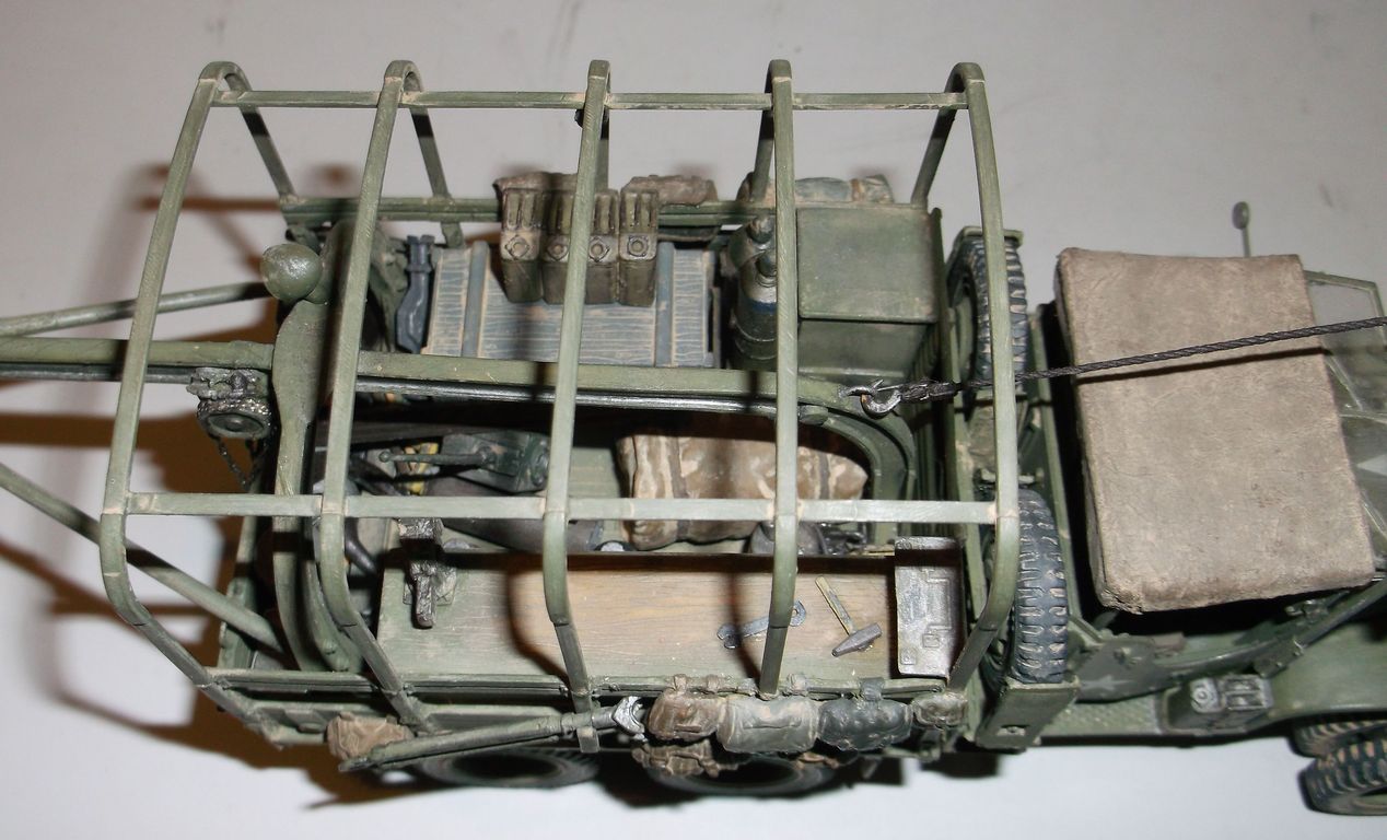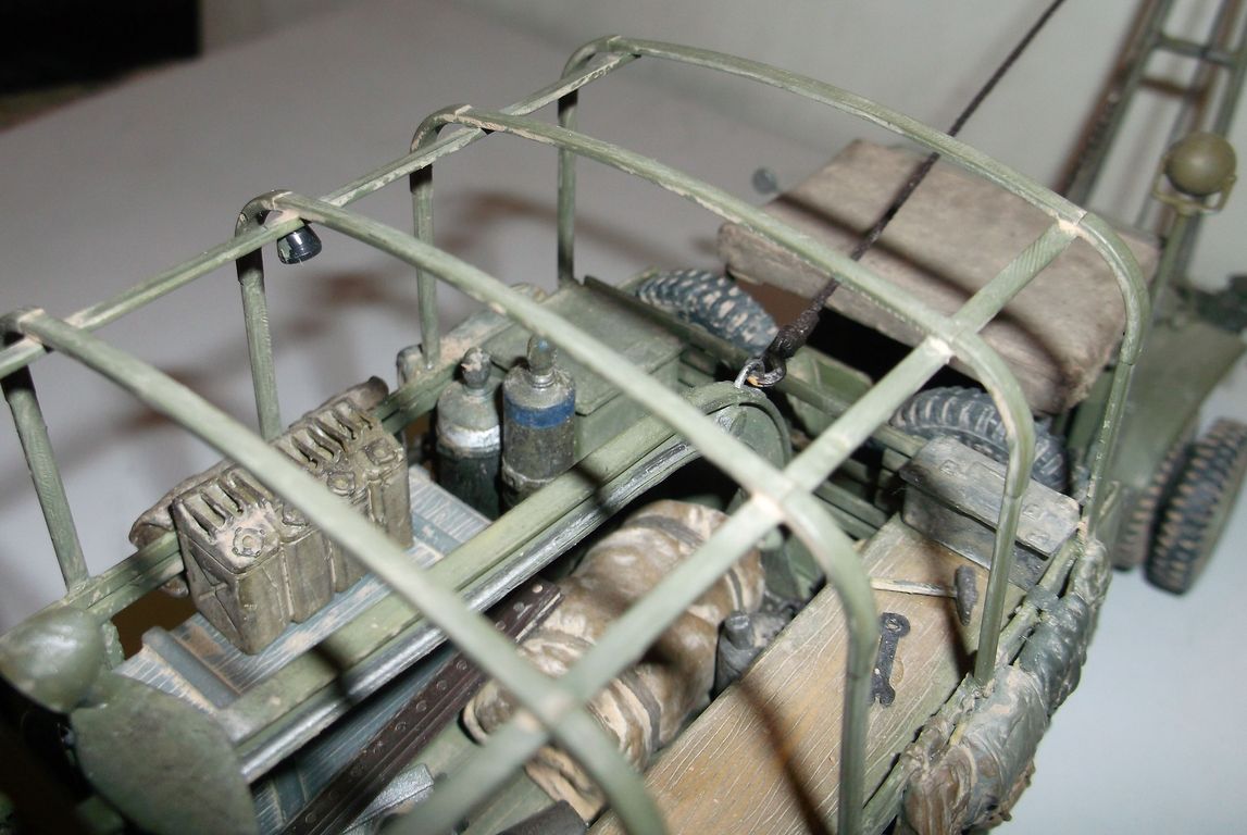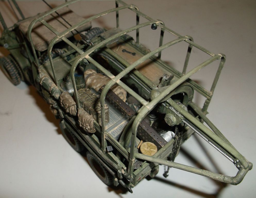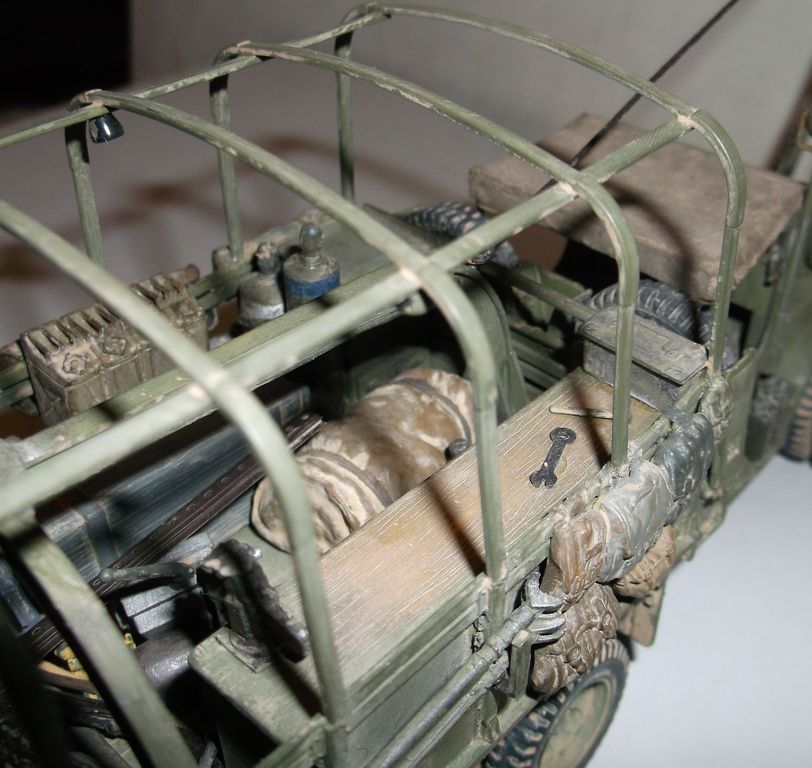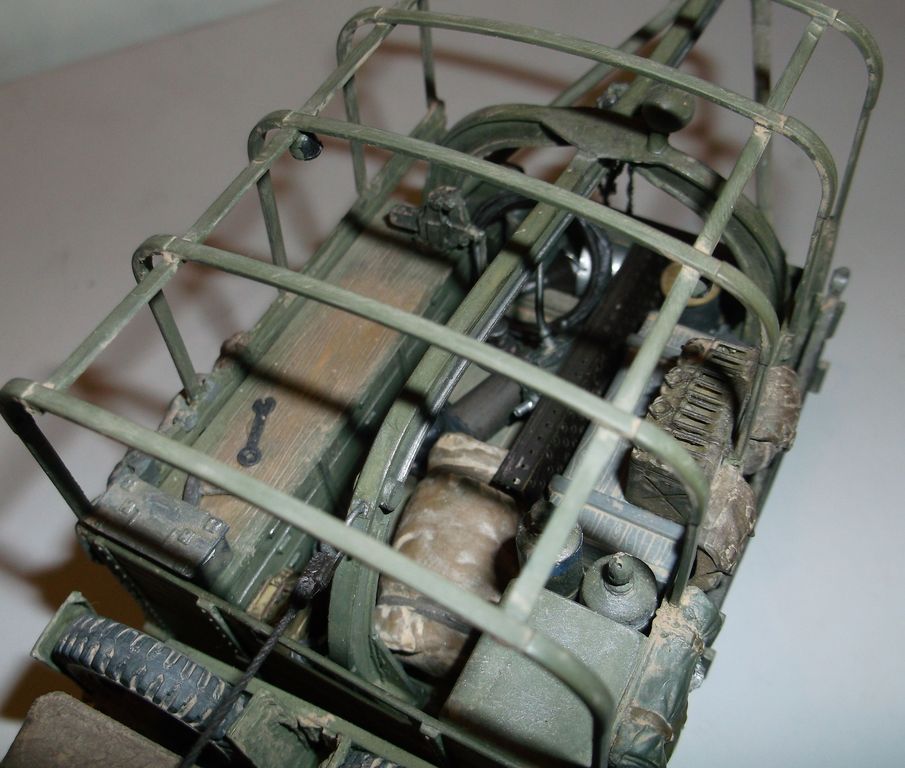 На этот раз выставляю реальный автомобиль. В том смысле, что такие были на самом деле. Базой послужил ДжиЭмСи от Эллер. Мне он больше понравился чем тамиевский, хоть у него немного косячные колёса и капот (короче почти на 2мм). Капот распилил и сделал вставку. Раму и карданы тоже укорачивал. А вот набор от Реал Модел нанёс мне глубокую психическую травму. Почти ни одной прямой детали. Под замену пошла почти вся бортовая платформа, укорачивал тамиевскую. Бензобак представлял собой сплошной кусок смолы с намёками на контуры. Всего даже и не перечислишь. Но то, что получилось, мне понравилось. А чтобы машинка выглядела ещё более необычно, передние колёса сделал сдвоенными (фото есть в нете). Декали от другого джима. Накидал в кузов всякого барахла. Окраска кистью эмалями Model Master. В цвет не попал. Да и Бог с ним. Главное, удовольствие получил. Итак, смотрим.