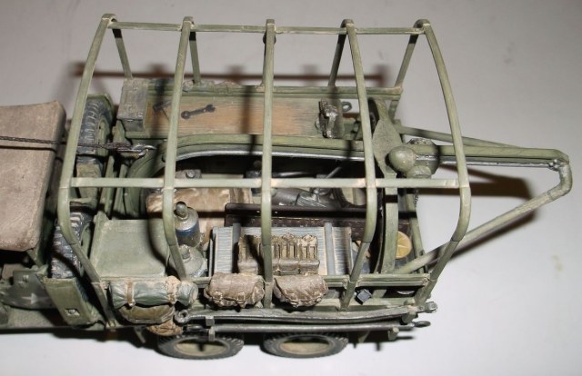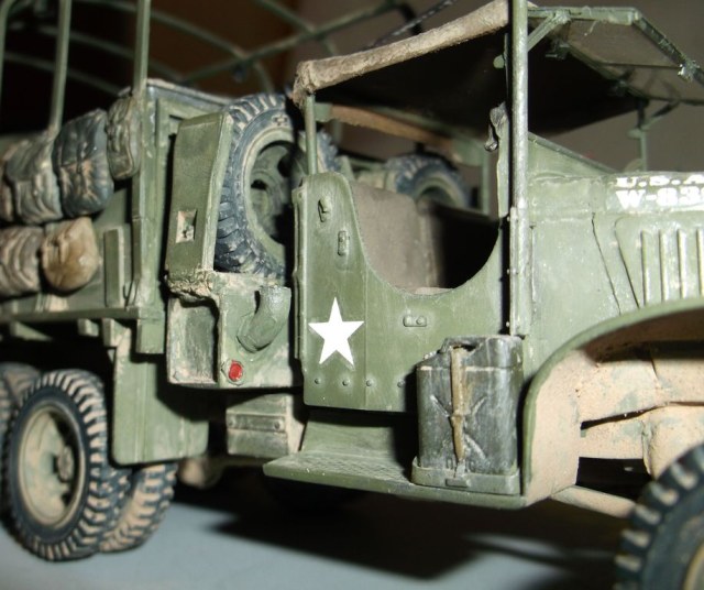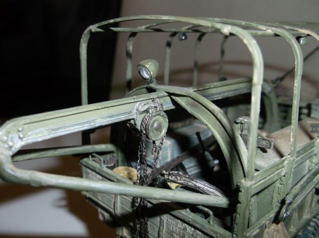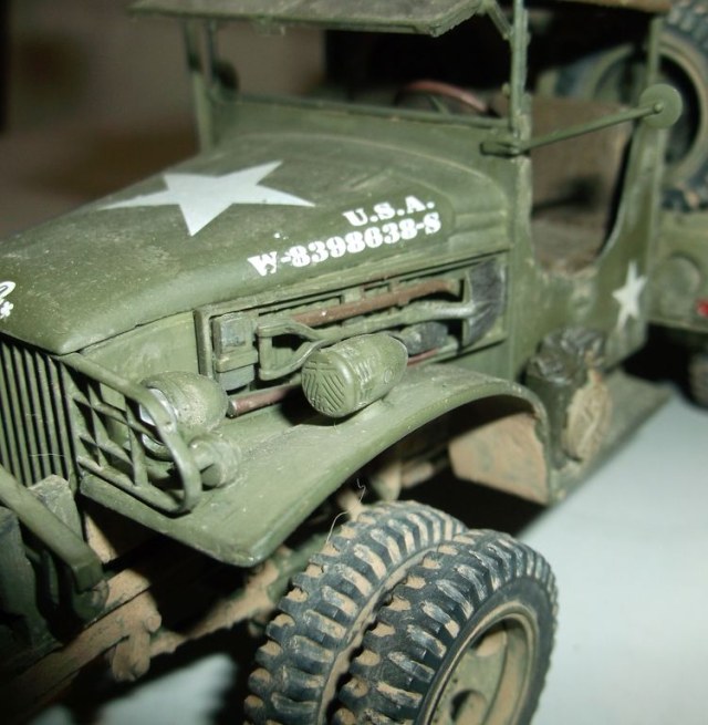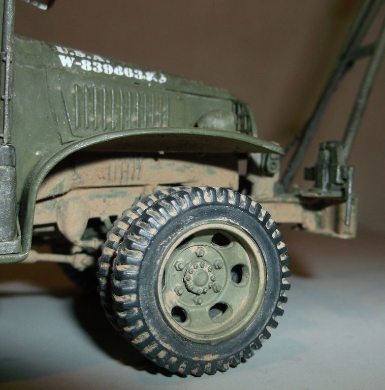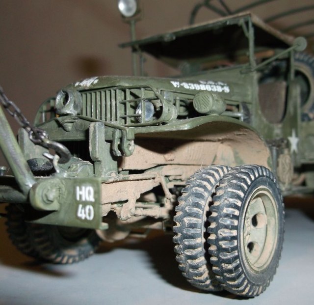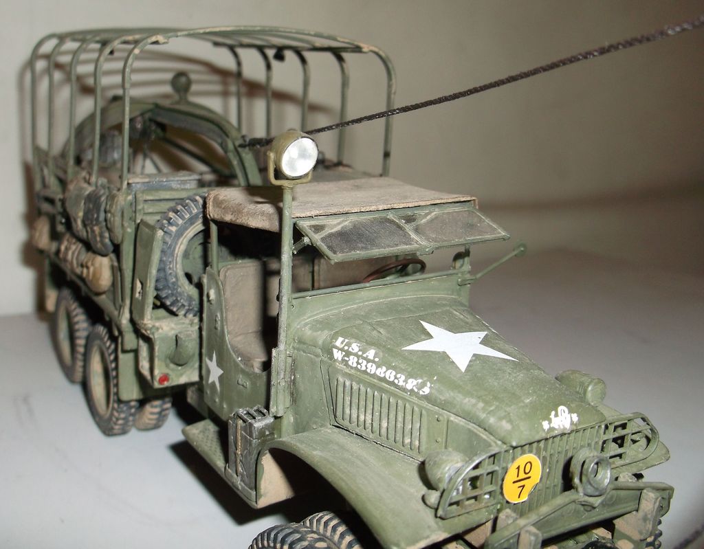 На этот раз выставляю реальный автомобиль. В том смысле, что такие были на самом деле. Базой послужил ДжиЭмСи от Эллер. Мне он больше понравился чем тамиевский, хоть у него немного косячные колёса и капот (короче почти на 2мм). Капот распилил и сделал вставку. Раму и карданы тоже укорачивал. А вот набор от Реал Модел нанёс мне глубокую психическую травму. Почти ни одной прямой детали. Под замену пошла почти вся бортовая платформа, укорачивал тамиевскую. Бензобак представлял собой сплошной кусок смолы с намёками на контуры. Всего даже и не перечислишь. Но то, что получилось, мне понравилось. А чтобы машинка выглядела ещё более необычно, передние колёса сделал сдвоенными (фото есть в нете). Декали от другого джима. Накидал в кузов всякого барахла. Окраска кистью эмалями Model Master. В цвет не попал. Да и Бог с ним. Главное, удовольствие получил. Итак, смотрим.