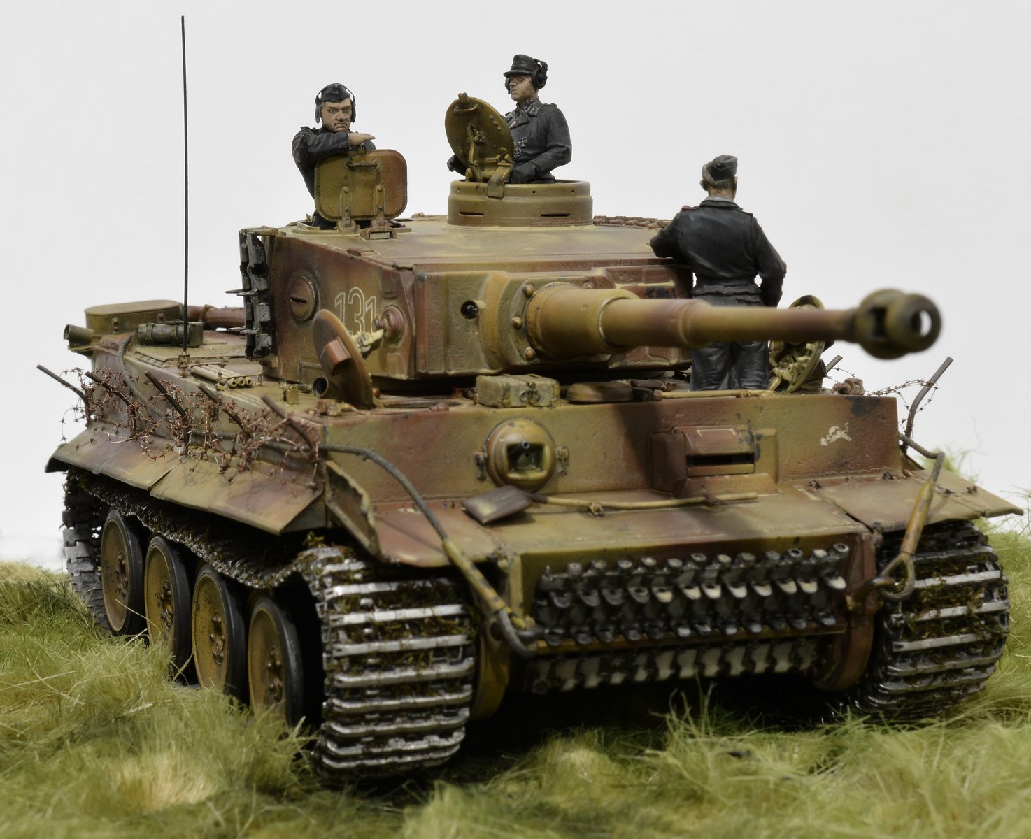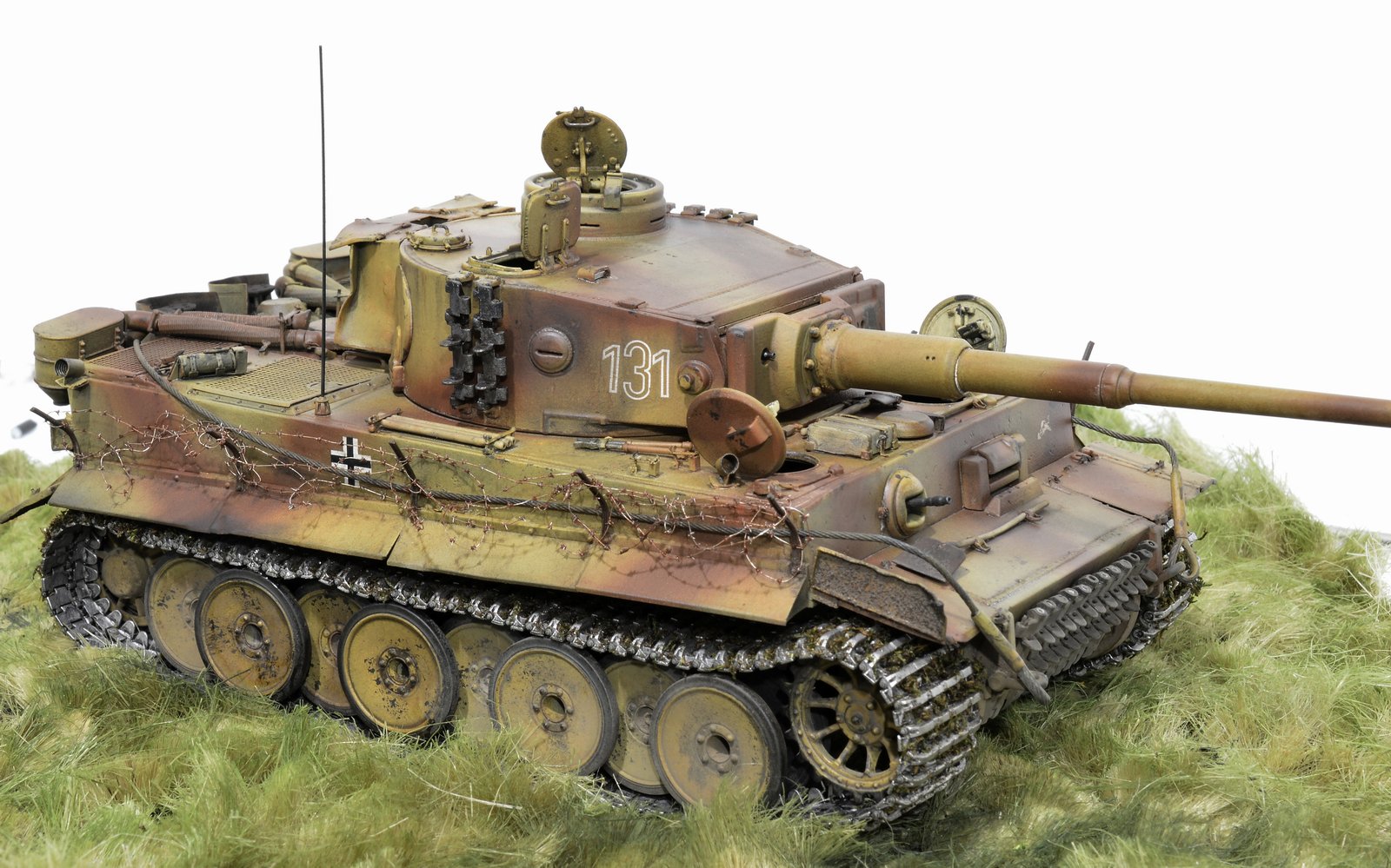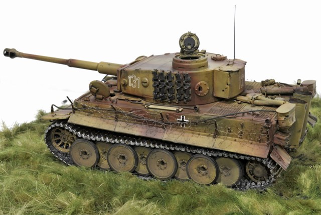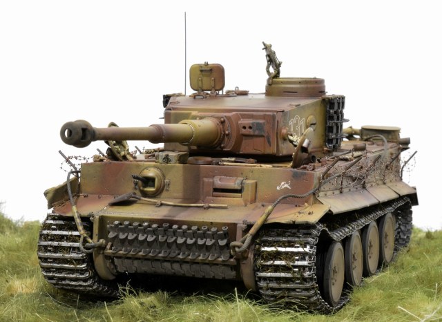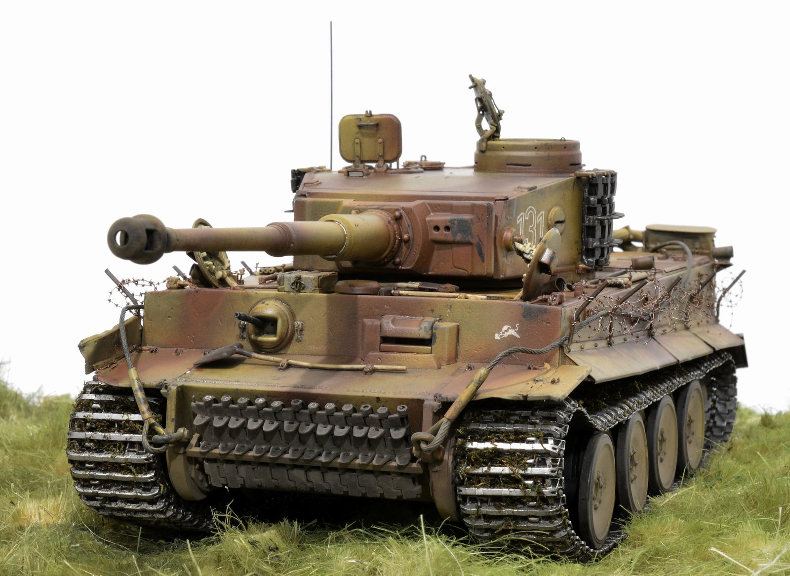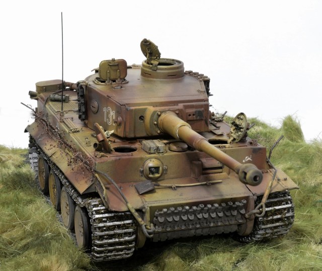 Представляю свою версию Тигра 505-го батальона №131. Долго не решался выставить немецкую зверюгу, к тому же совсем недавно в галерее уже был выставлен Тигр 505-го батальона №114. Номерок на моей модели немного косячный, пришлось собирать из всех резервов и остатков декалей, но именно такой номер требуется мне. Модель танка делал, подсматривая на Тигр №214, поэтому моя модель – это не прототип этого танка. 131-й, к сожалению, найден был намного позже, когда модель была уже полностью готова. На нём башенные гранатомёты были.