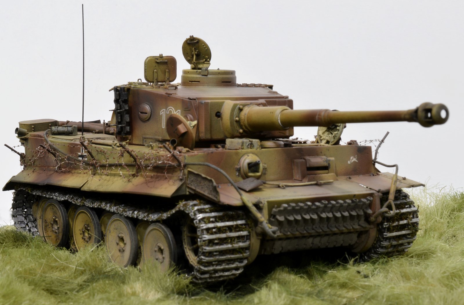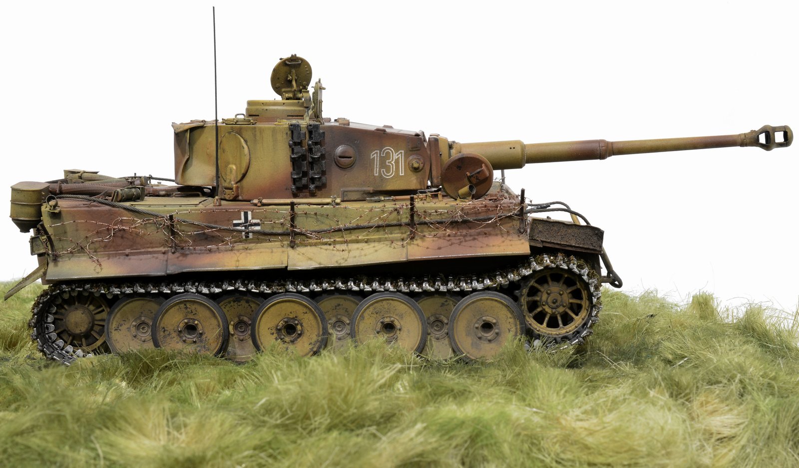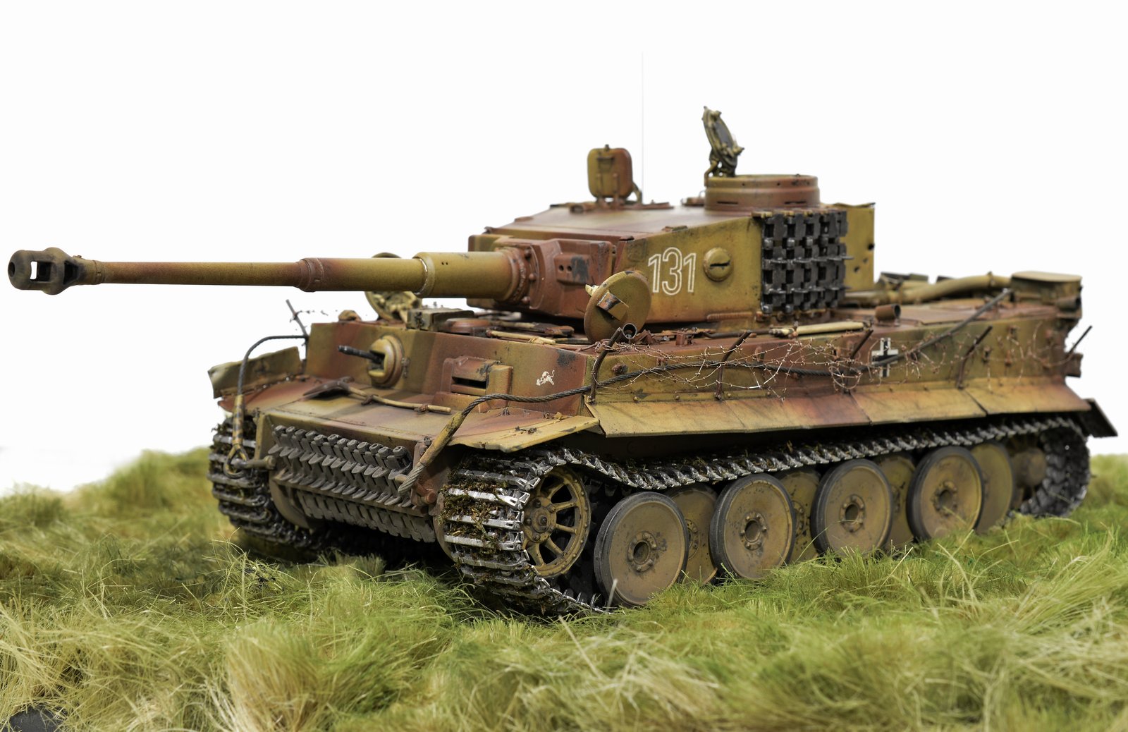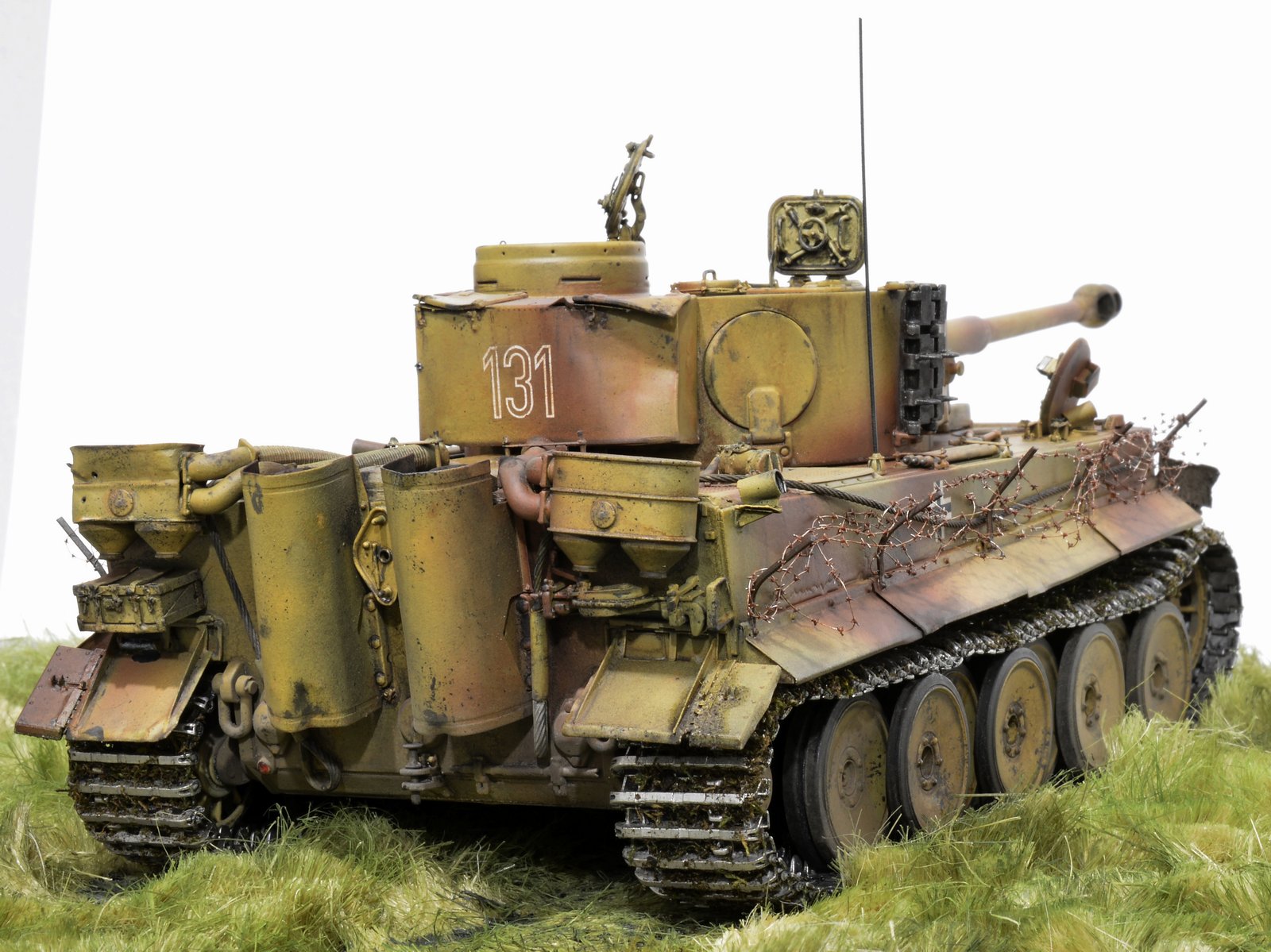 Представляю свою версию Тигра 505-го батальона №131. Долго не решался выставить немецкую зверюгу, к тому же совсем недавно в галерее уже был выставлен Тигр 505-го батальона №114. Номерок на моей модели немного косячный, пришлось собирать из всех резервов и остатков декалей, но именно такой номер требуется мне. Модель танка делал, подсматривая на Тигр №214, поэтому моя модель – это не прототип этого танка. 131-й, к сожалению, найден был намного позже, когда модель была уже полностью готова. На нём башенные гранатомёты были.
