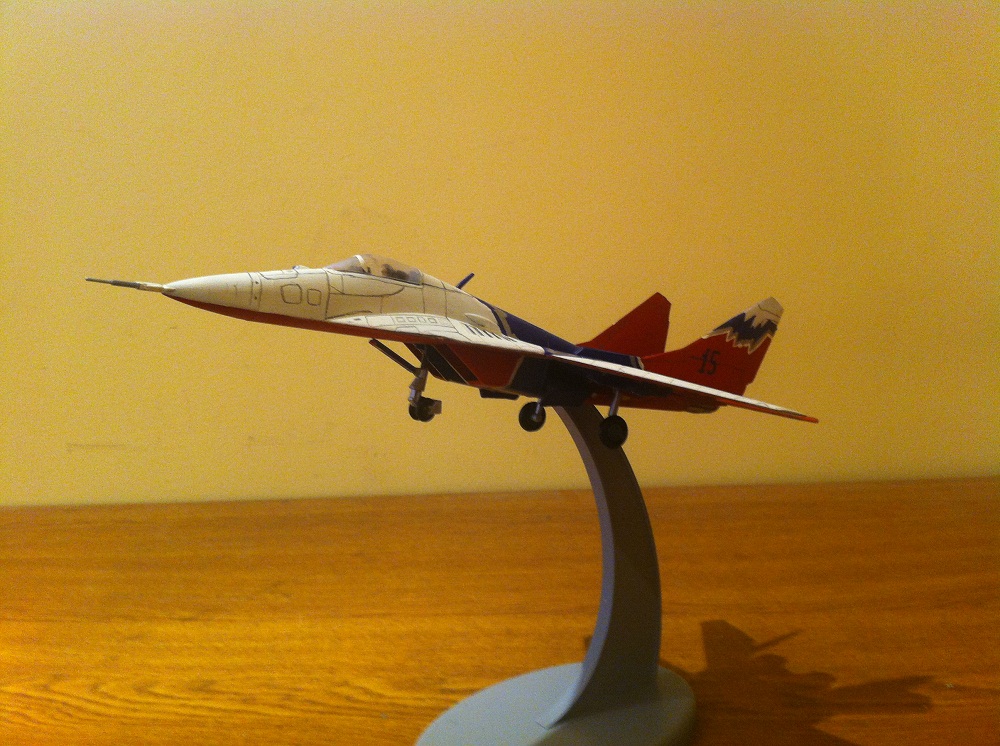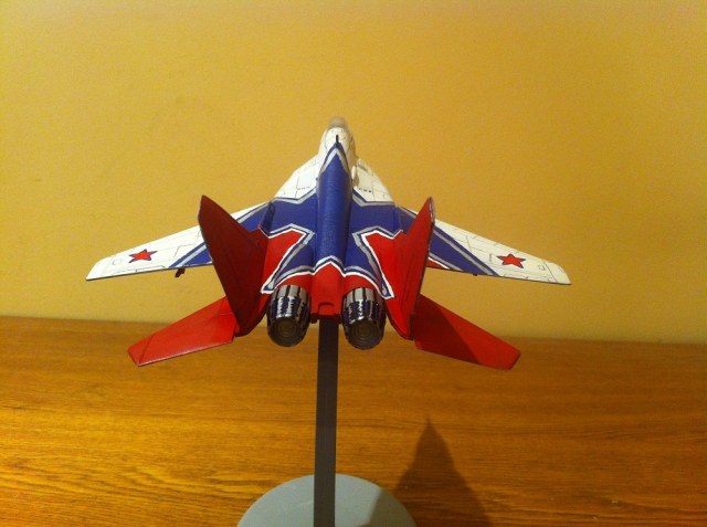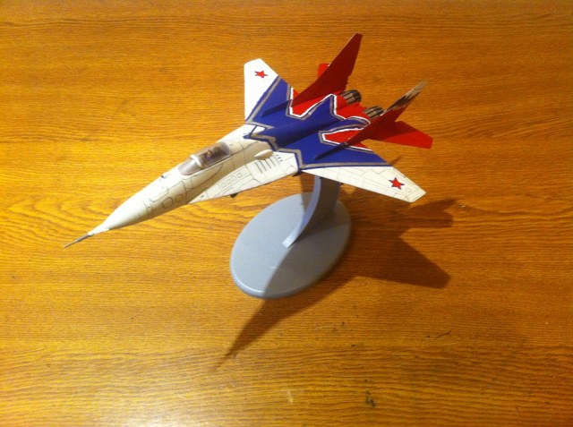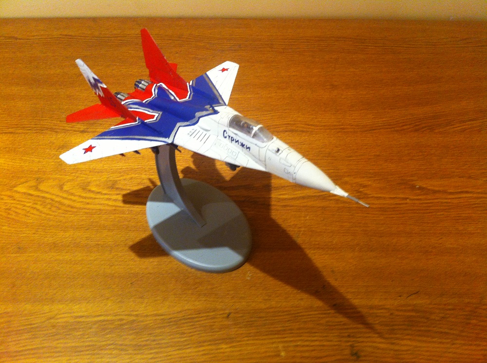 Давно хотел собрать МиГ 29 со пилотажной группой Стрижи но в магазинах были только боевые Миги. Поэтому пришлось взять боевой фирмы Звезда и сильно пожалел что купил. Не знаю может быт подделка или просто попался такой но качество сильно хромала, декали не было, детали были вогнуты. Но ладно собрал модель лишь отдаленно похож на реальный МиГ 29, так как декалей не было пришлось красить трафаретом и кистью. Сразу говорю я не профессионал и допускаю ошибки в сборке так что прощу всех не судить строго. Буду очень благодарен за ценный советы.
