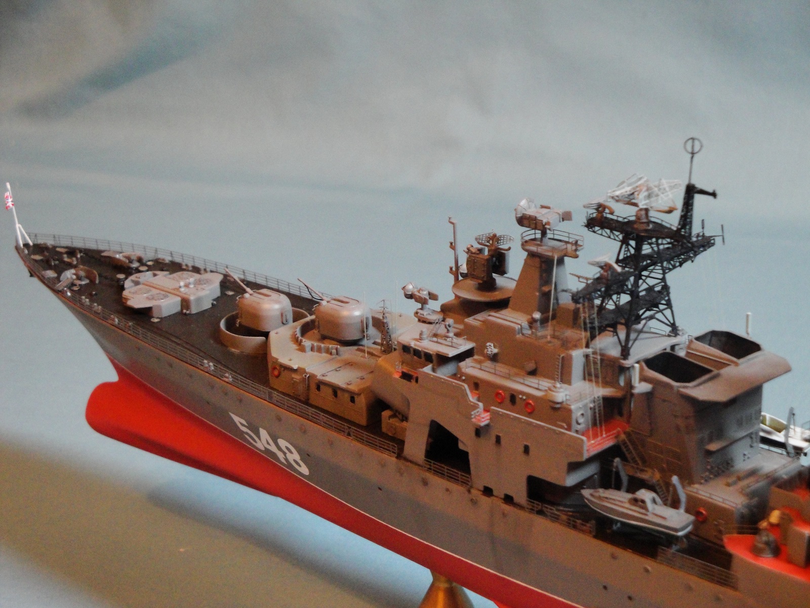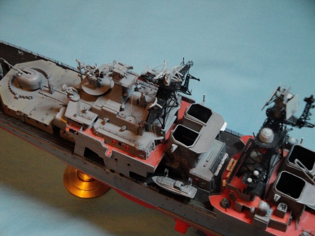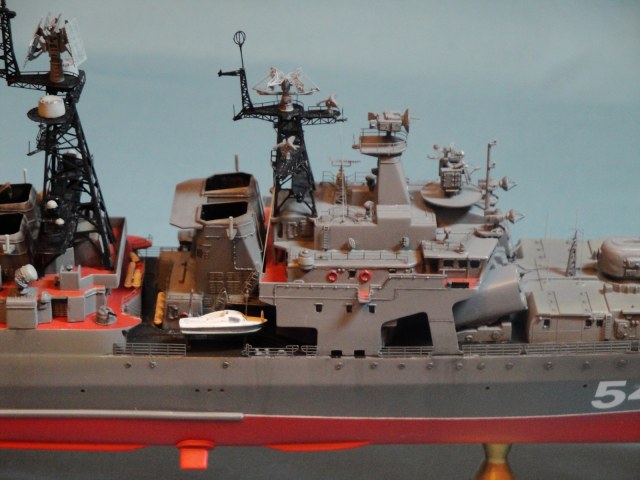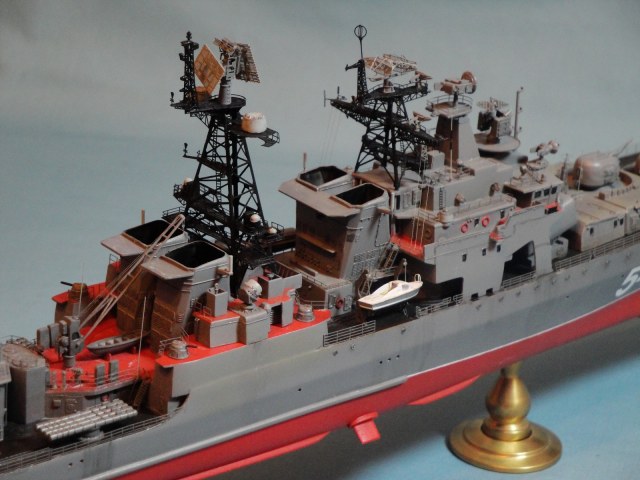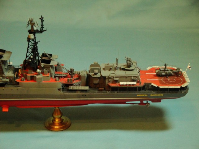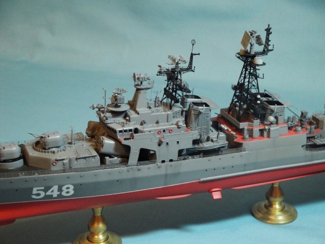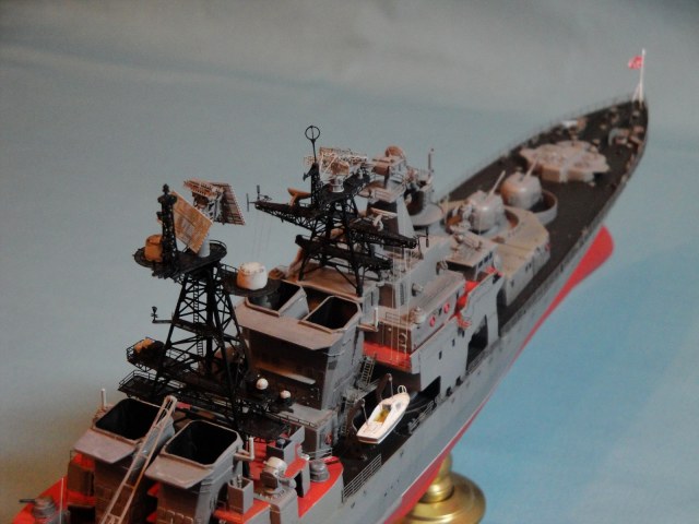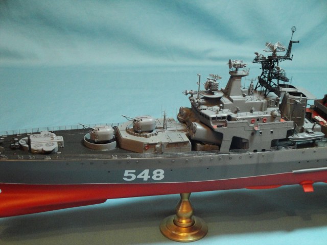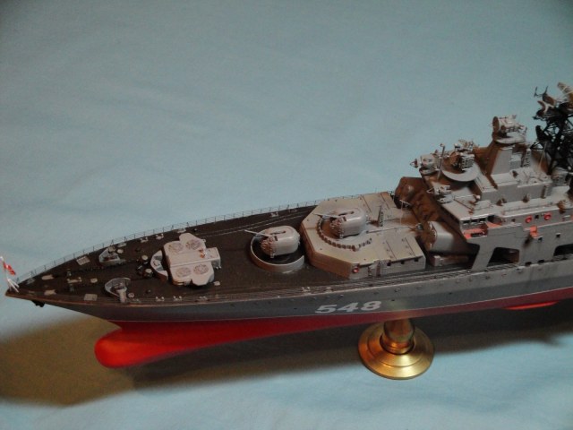 Доброго всем дня! Ну вот и я наконец то домучал свой «долгострой». Все служба ратная мешала в полном объеме заняться стройкой. Модель всем известная, описание выложено на сайте. В процессе стройки использовался набор травления от WEM и частично GMM, пластик, тянутый литник. Попытался сделать максимально близко к прототипу, из доработок : добавил привальный брус по бортам, в районе врг из шпаклевки сформировал «бульбы», которые в оригинале наполнены песком и служат для придания кораблю остойчивости, увеличил вертолетную площадку, доработал мелочевку над вертолетным ангаром, ну так еще по мелочи. Вставил травленые иллюминаторы. Стволы на АУ АК-100 точеные от Sea Master. Пропилил «стрижа» и из прозрачного пластика вставил остекление. Цепи заменил на трумповские. Бортовой номер взял от собрата пр.956, т.к. предлагаемый какой-то не особо…. На ТОФе любят большие номераJ С названием корабля все ясно, китайские друзья слегка начудилиJ Косяков не доделанных полно и один из них опять не сделал кольцевые антенныJ Ну предположим их еще не установили или сняли за чем ни будь (у некоторых бортов они кстати так и не установлены), косячные гребные винты оставил без изменений. Красил акрилом, эмалью и покрывал лаков, все тамия. Сделал легкую смывку, подтеки по бортам. Всем приятного просмотраJ