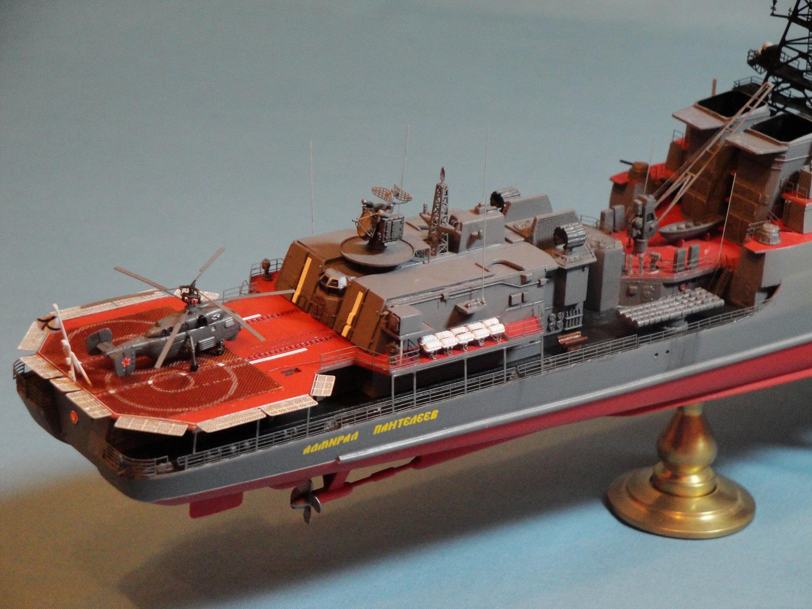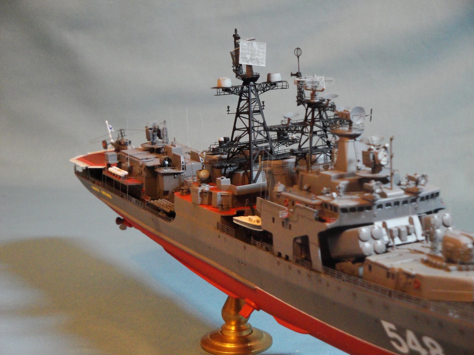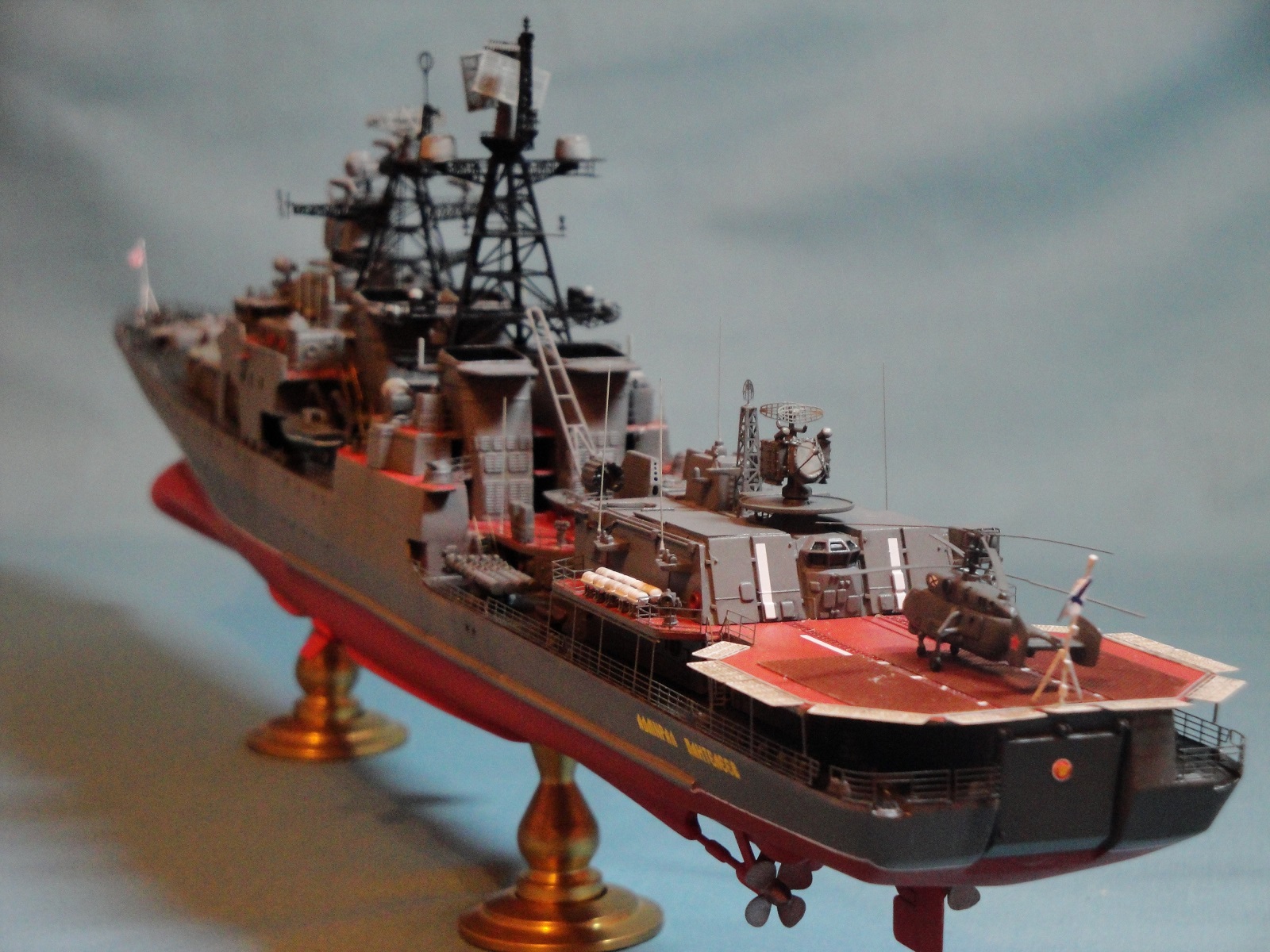 Доброго всем дня! Ну вот и я наконец то домучал свой «долгострой». Все служба ратная мешала в полном объеме заняться стройкой. Модель всем известная, описание выложено на сайте. В процессе стройки использовался набор травления от WEM и частично GMM, пластик, тянутый литник. Попытался сделать максимально близко к прототипу, из доработок : добавил привальный брус по бортам, в районе врг из шпаклевки сформировал «бульбы», которые в оригинале наполнены песком и служат для придания кораблю остойчивости, увеличил вертолетную площадку, доработал мелочевку над вертолетным ангаром, ну так еще по мелочи. Вставил травленые иллюминаторы. Стволы на АУ АК-100 точеные от Sea Master. Пропилил «стрижа» и из прозрачного пластика вставил остекление. Цепи заменил на трумповские. Бортовой номер взял от собрата пр.956, т.к. предлагаемый какой-то не особо…. На ТОФе любят большие номераJ С названием корабля все ясно, китайские друзья слегка начудилиJ Косяков не доделанных полно и один из них опять не сделал кольцевые антенныJ Ну предположим их еще не установили или сняли за чем ни будь (у некоторых бортов они кстати так и не установлены), косячные гребные винты оставил без изменений. Красил акрилом, эмалью и покрывал лаков, все тамия. Сделал легкую смывку, подтеки по бортам. Всем приятного просмотраJ