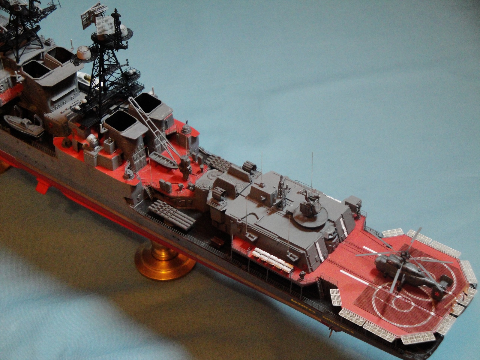 Еще я считаю ошибкой (она у меня тоже присутствует) поднятый кормовой флагшток с Андреевским флагом при опущенных вниз ограждениях вертолетной площадки и тем более при присутствии Ка-27 на площадке. Это и нарушении техники безопасности и наверное это технологически так сделано.