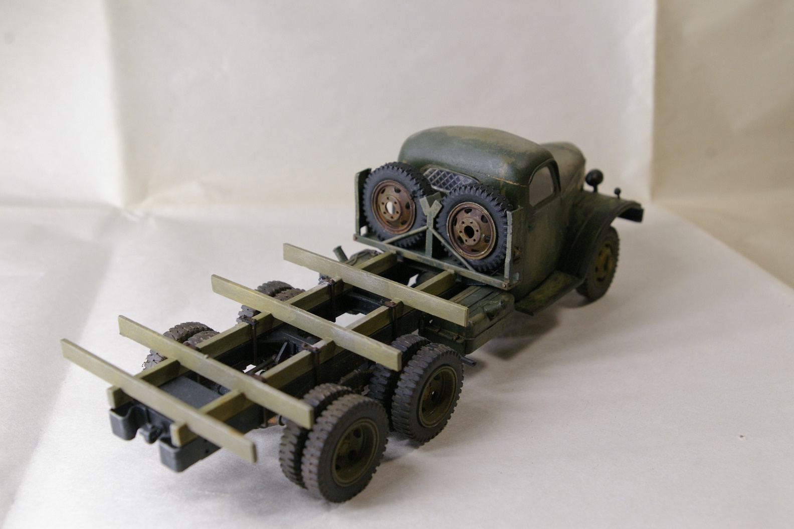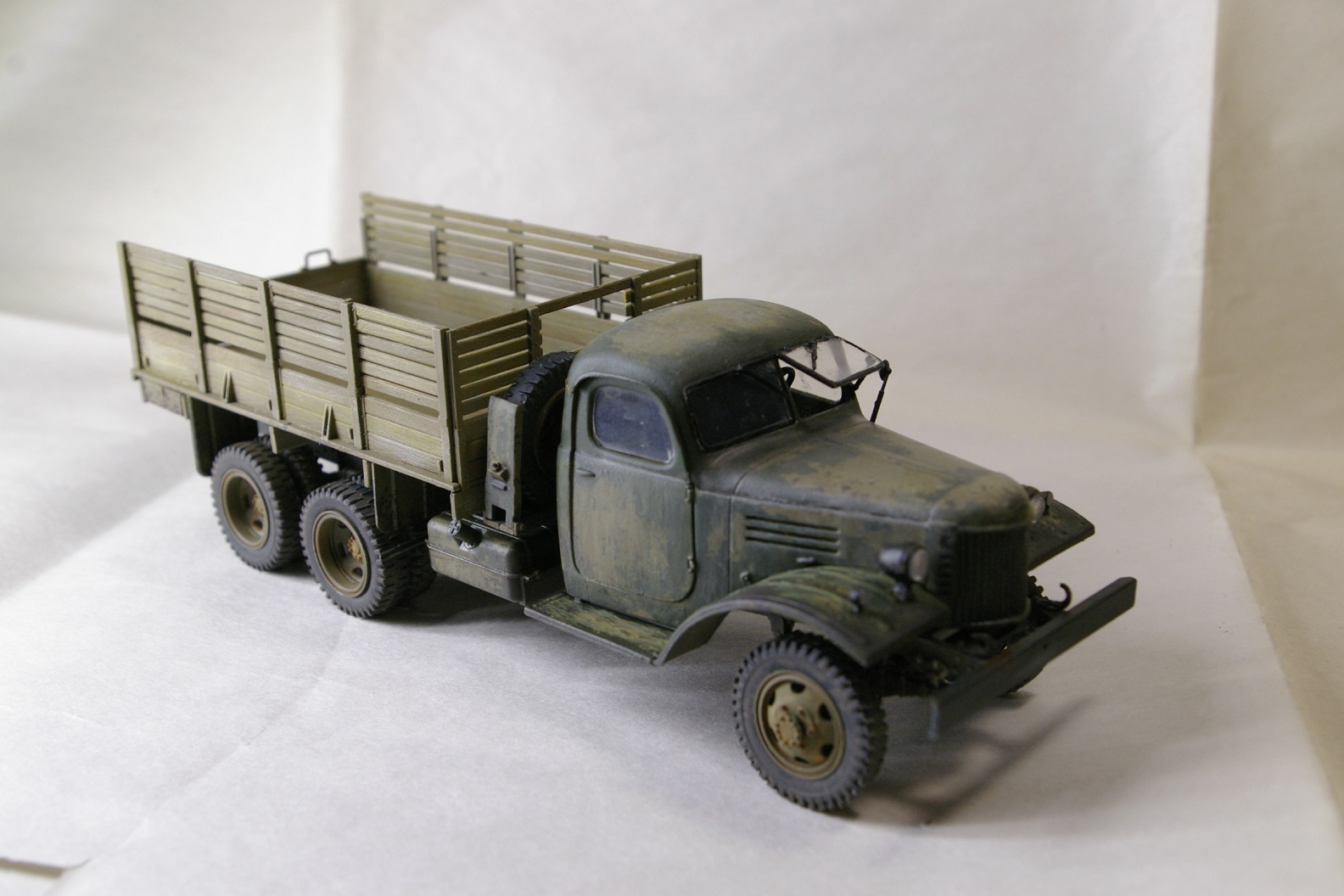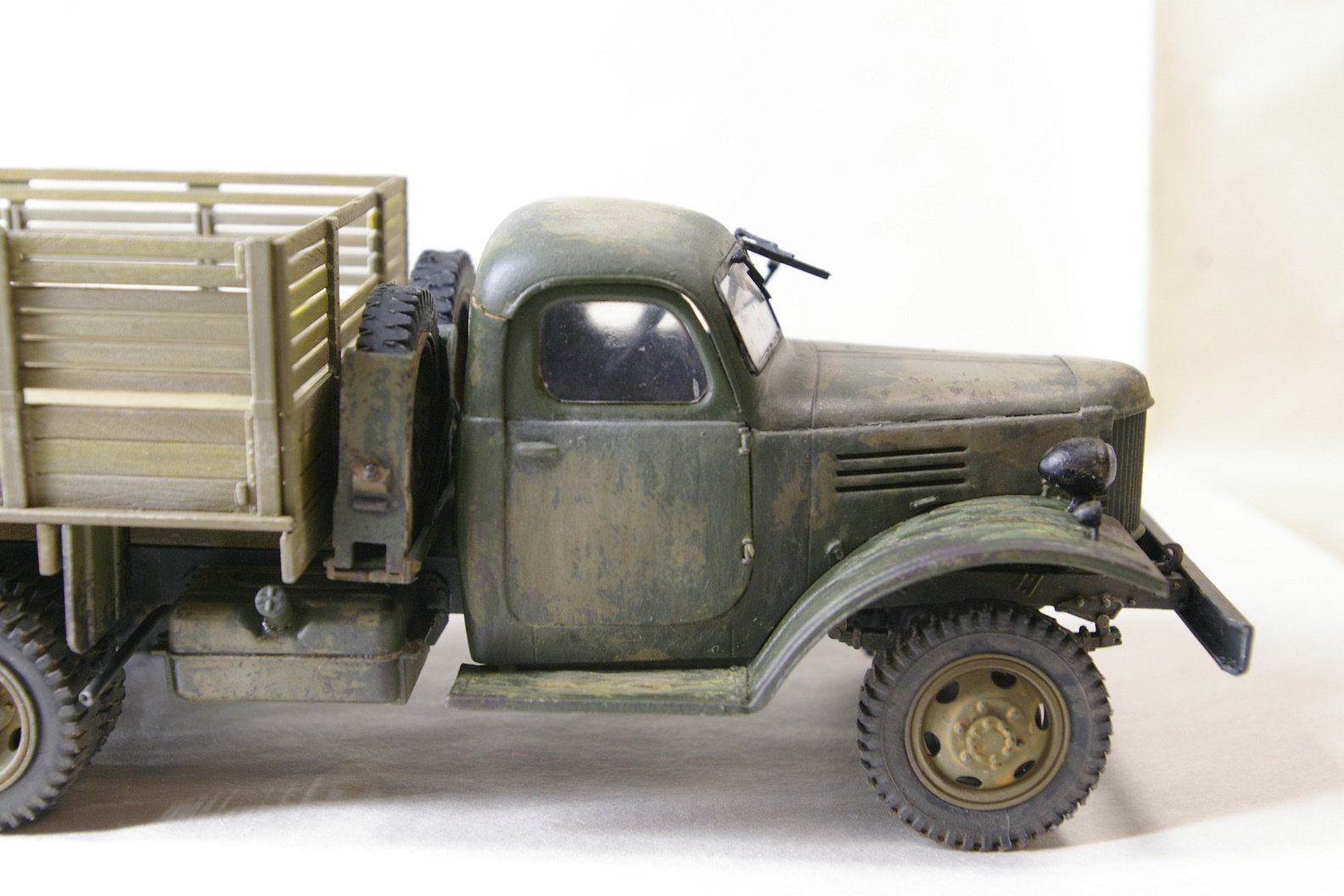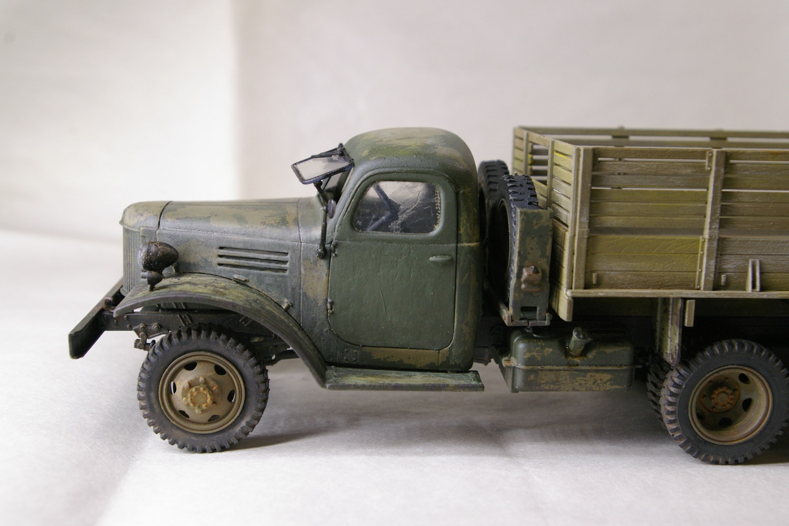Чисто коробочная сборка. Окраска рамы Tamya XF-1, кузов Tamia XF-49. Кабина окрашена Tamia XF-49 и поверху Tamia XF-58, между ними AK-089 жидкость для обдирки. Кузов дополнительно доведен масляными точками.