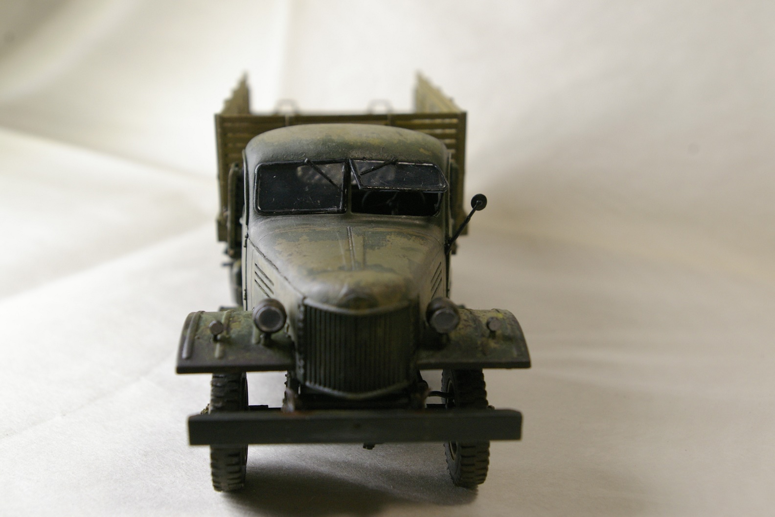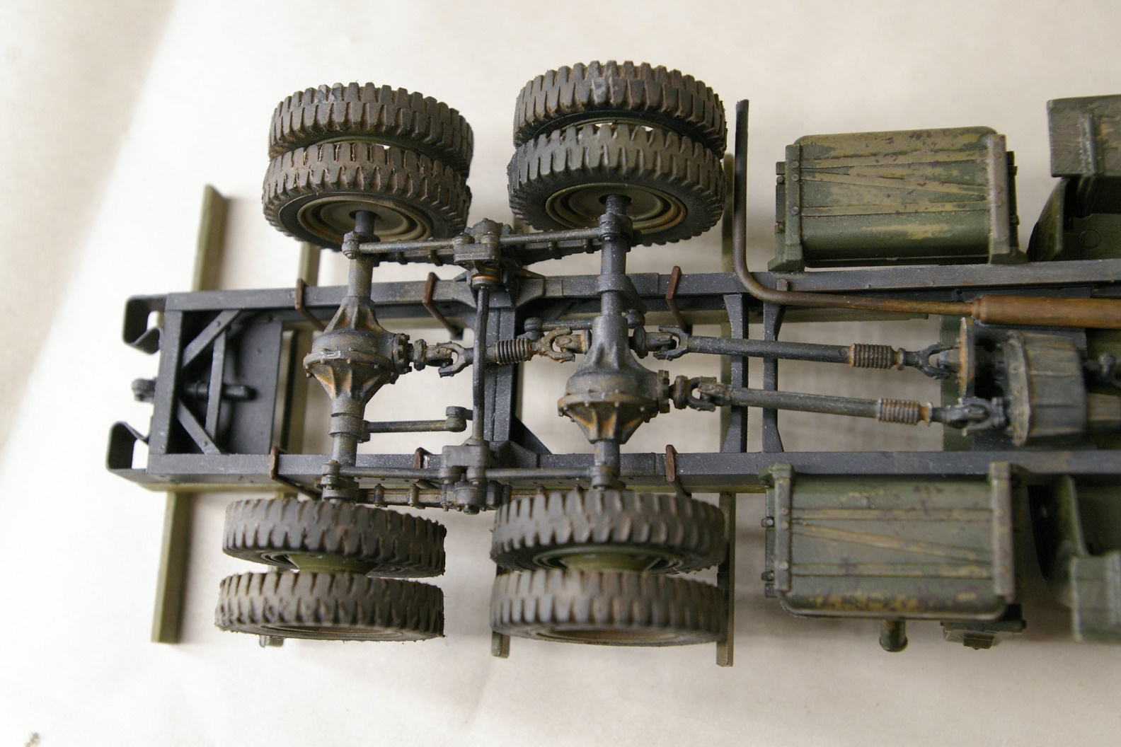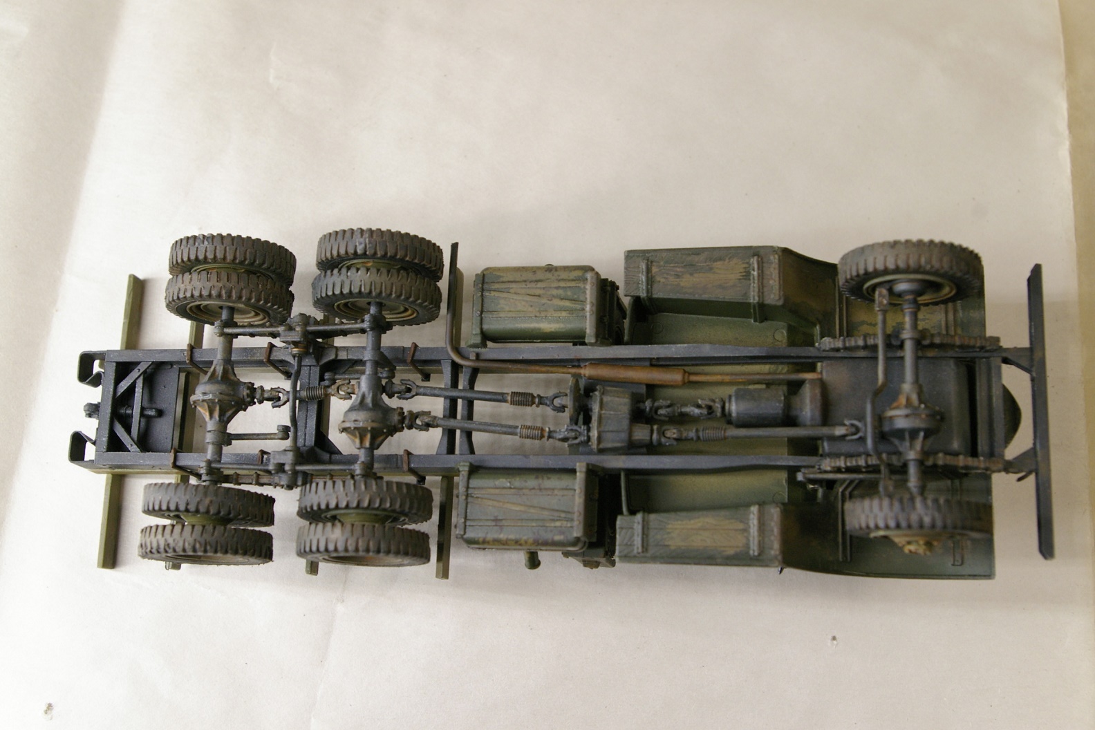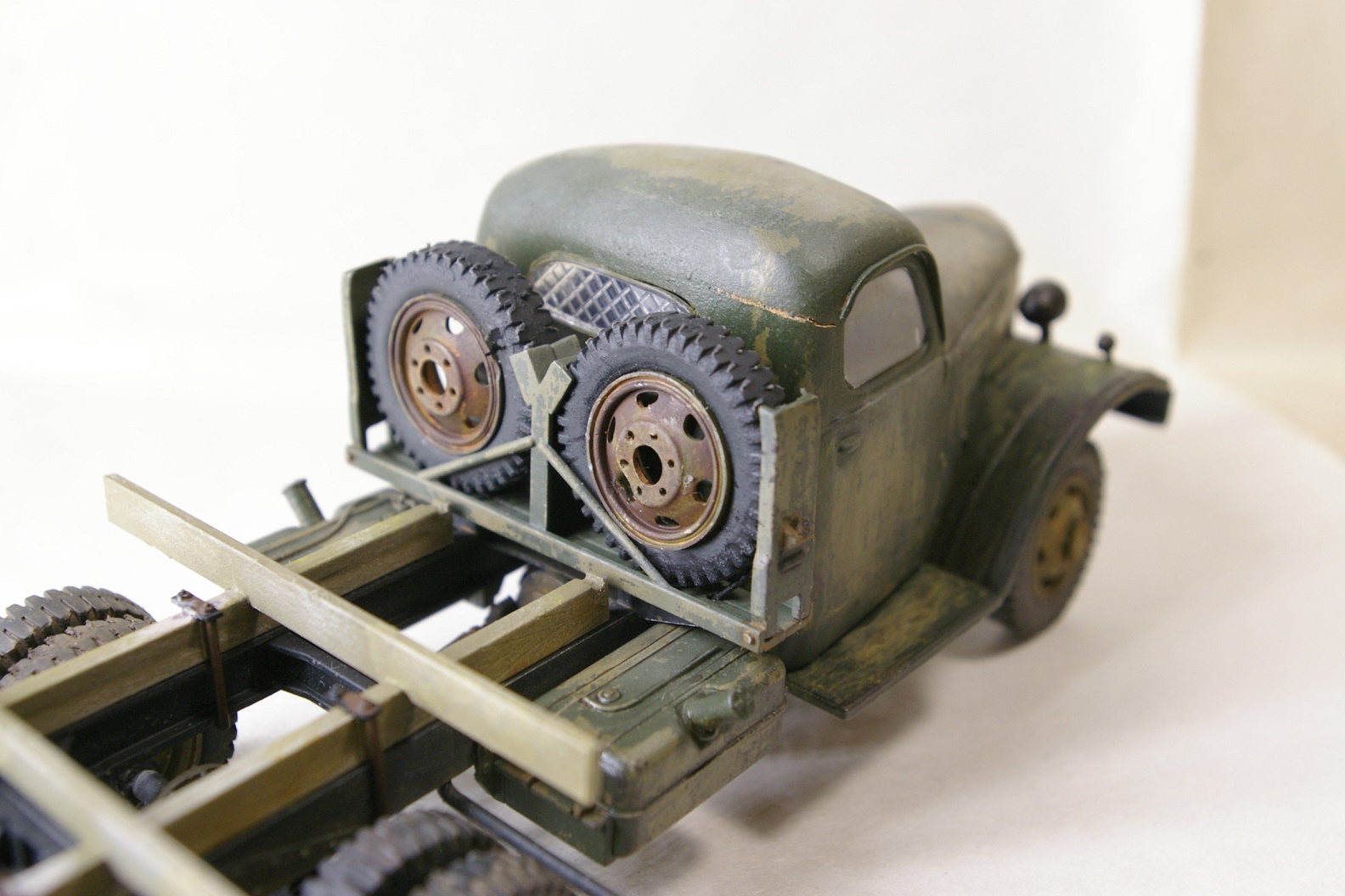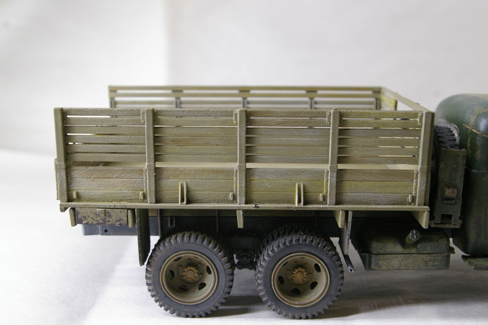 Чисто коробочная сборка. Окраска рамы Tamya XF-1, кузов Tamia XF-49. Кабина окрашена Tamia XF-49 и поверху Tamia XF-58, между ними AK-089 жидкость для обдирки. Кузов дополнительно доведен масляными точками.