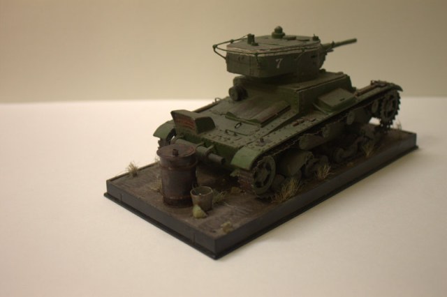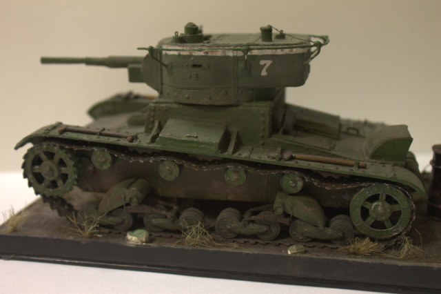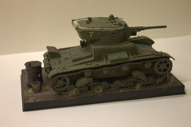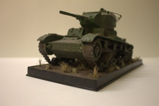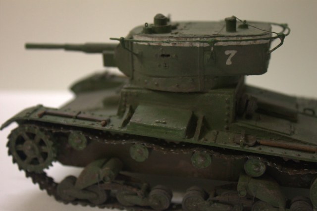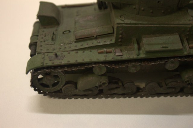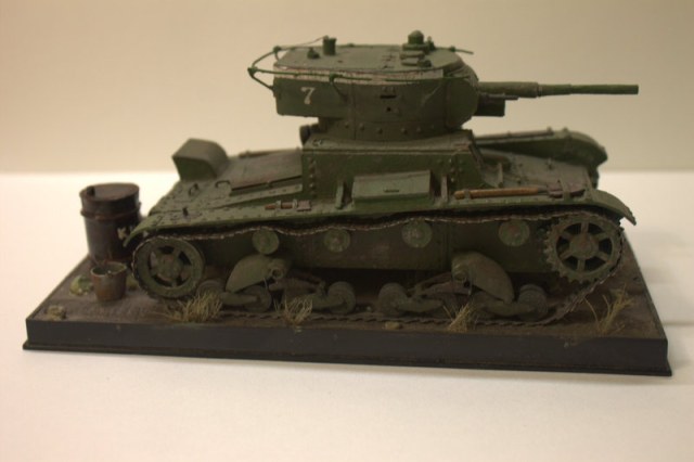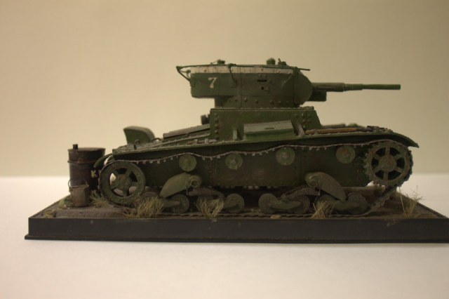 Доброго дня Каропчане!!! Вот выкладываю свою модель танка Т- 26, которую начал еще в прошлом году. Модель выполнена в нестандартном масштабе 1: 30, из бумаги и картона, а так же медной и стальной проволоки, ещё пара зубочисток.. Заклёпки проработал каплями клея, никаких наборов при этом не использовалось, строго чертежи, найденные на просторах интернета. Приходилось расчерчивать детали и вырезать из картона, что используется для изготовления фото-рамок. Акварельной бумагой прорабатывались мелкие детали и детали с изгибом. Гусеницы так же, из бумаги. Сначала хотел сделать их наборными на проволоке, но по ходу сборки выяснилось, что шаг на звёздочке не совпадает с отверстиями траков, пришлось делать целиковую, и подрезать лишние зубцы. Что касается катков, то они собраны по принципу "Сэнгвича" , как и рессоры тележек катков. Медной проволокой дорабатывал их рельефность. Заранее прошу прощение, если не смог где-то закрыть медь. Очень сложно было с покраской модели. Сначала выгибало корпус, потом пришлось многократно проклеивать стыки, чтобы добиться целости корпуса. Красил "Звездой", не стал строить экспериментов со смывкой и тонировкой, просто закрыл, и запылил грифелем карандаша, плюс художественная пастель.