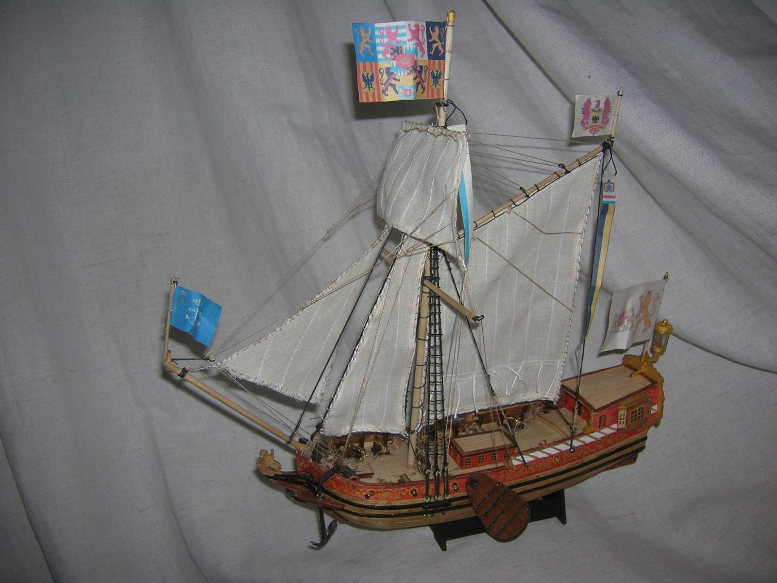 Относительно покраски: обшивка корпуса протравлена марганцовкой, все остальное- фломастерами, узор на бортах, оковки на швертах, якоря - различные варианты акрилового металлика. Есть над чем поработать в плане техники работы с кистью и подбора инструментов. Думаю, в следующий раз все буду красить акрилом.