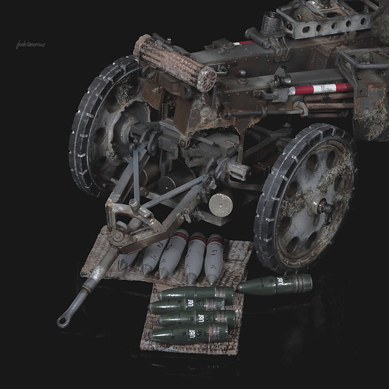 Проводилась с использованием фототравления фирмы Partдля моторного отделения и боковин платформы, «родные» гусеницы и ведущие катки были заменены на металлические от Friulmodel.