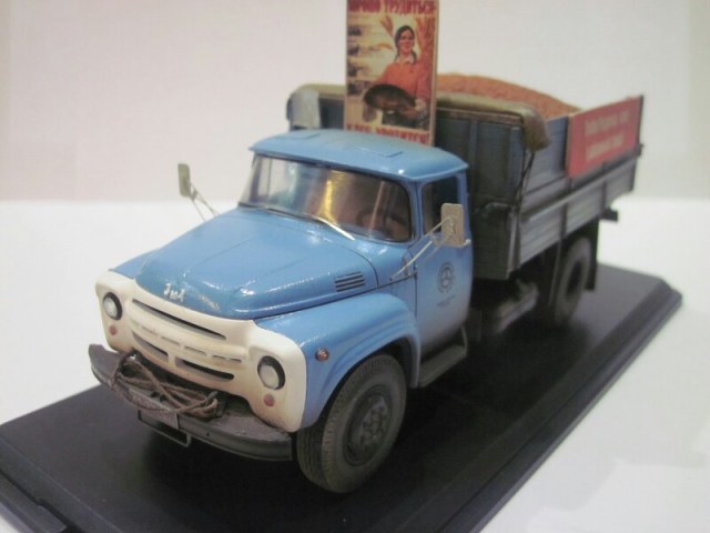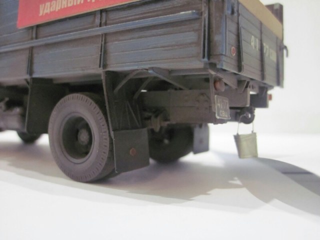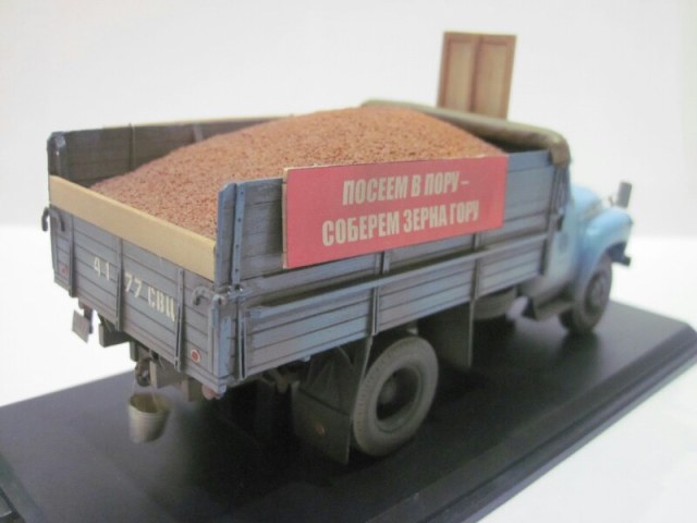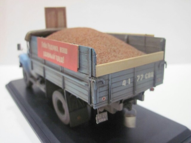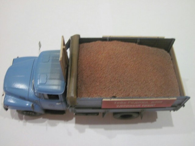 Модель собрана из кита (SSM), кабина окрашена эмалью Кудо (Сенеж), всё остальное акрилом Тамия. От себя добавлены подпорки брызговиков, нарощенные борта, Харьковская резина, декали, трос, тент, груз, плакаты. Лопата сделана из пивжести, черенок деревянный. Также использованы ФТД "Петроград". Очень хотелось сделать с пшеницей во время уборки урожая!