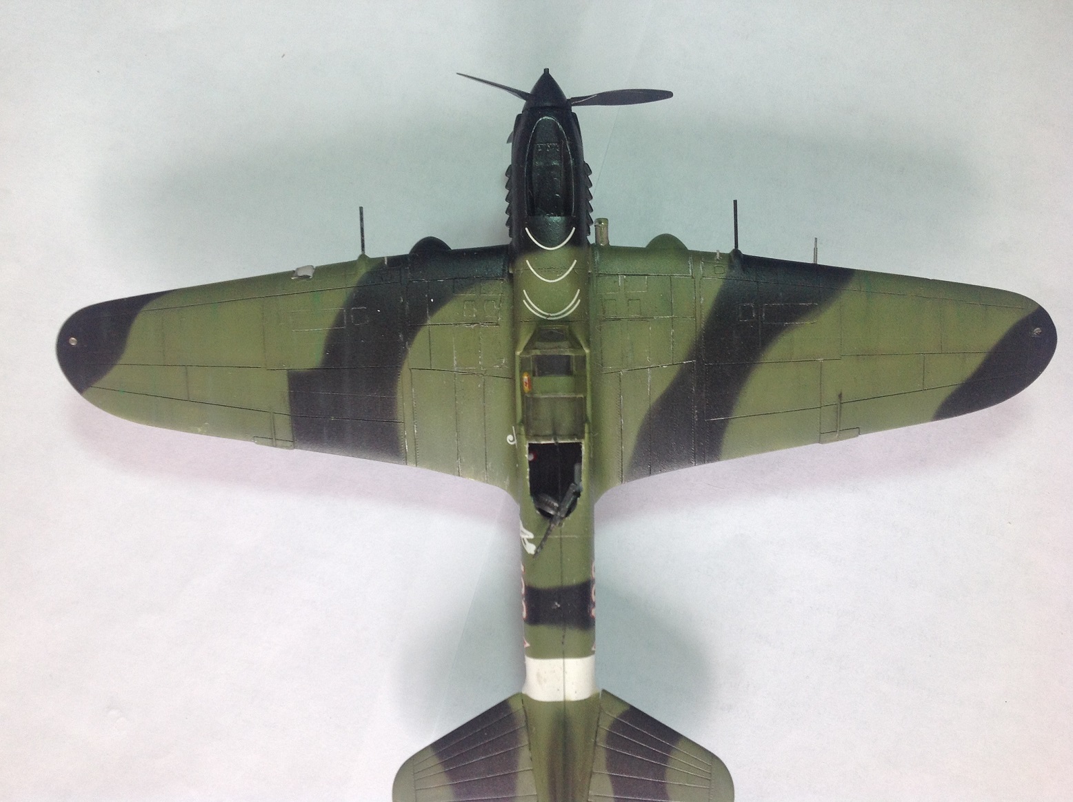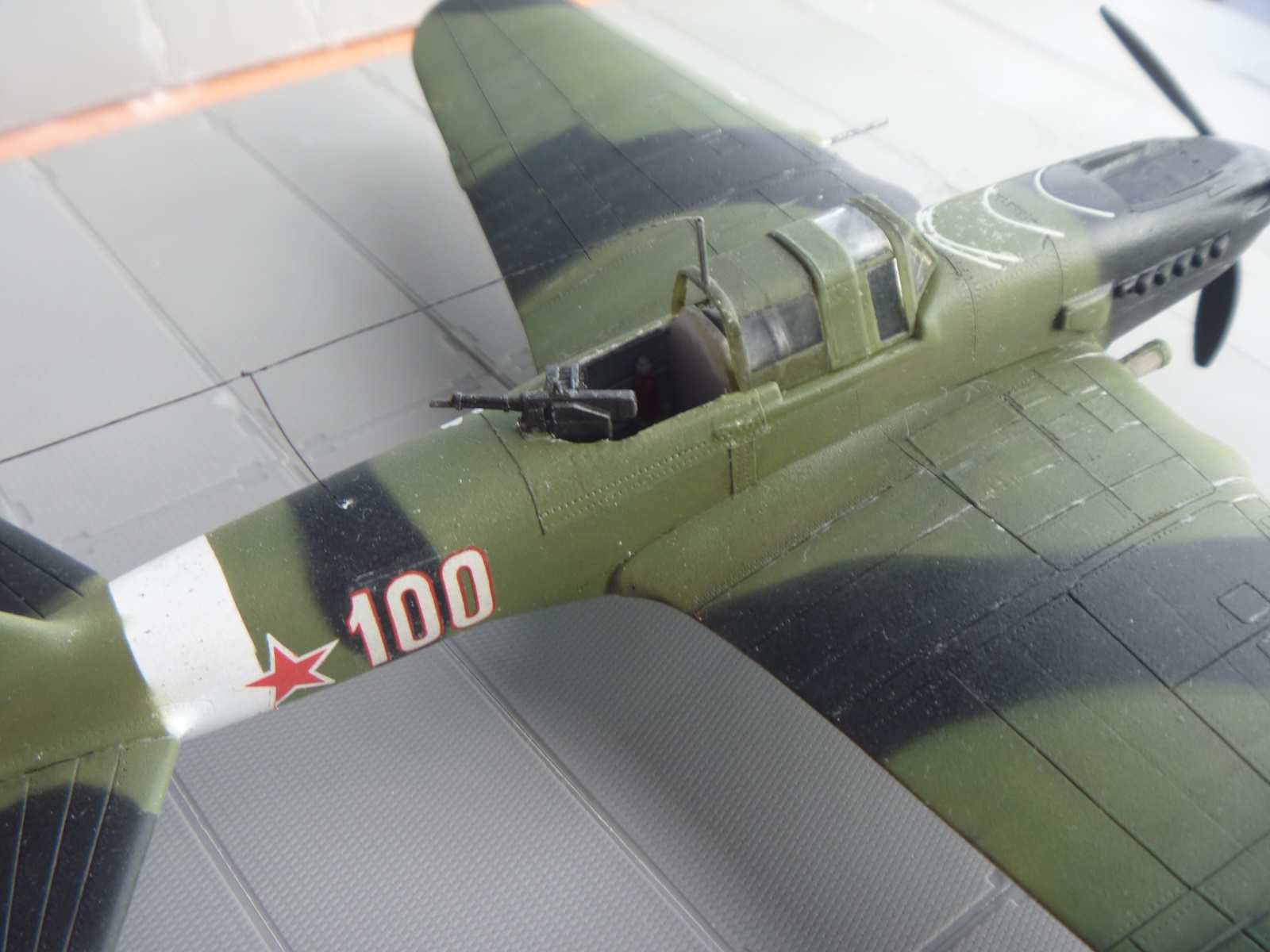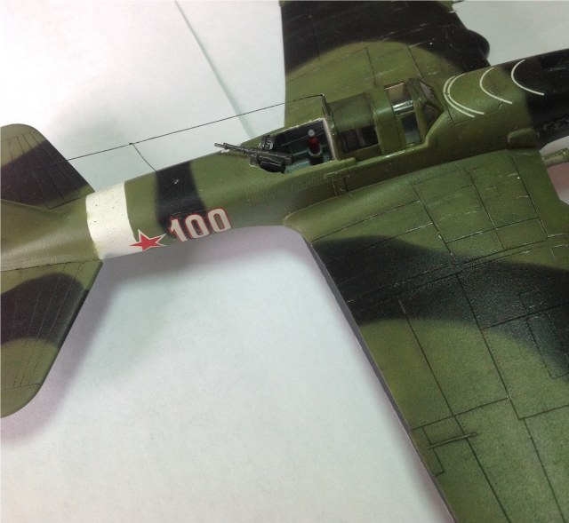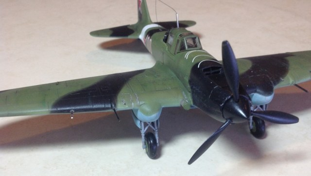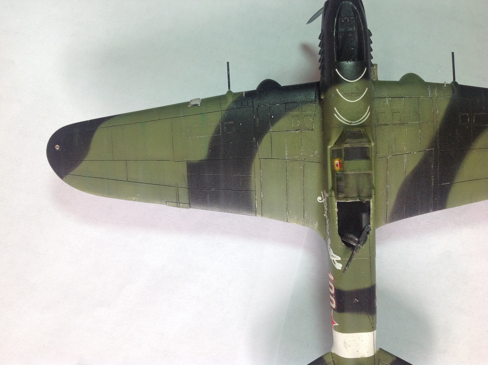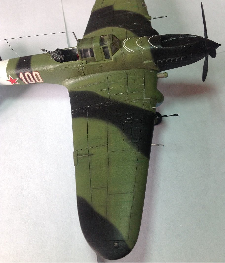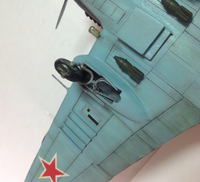 К выше сказанному добавлю что фонарь кабины прокрашен "слабо", не хватает серого слоя "внутрянки" отчего он выглядит прозрачным. Сочленение кока винта с фюзеляжем - могло быть лучше. Выхлопные патрубки ну не должны быть одного тона с камуфляжем. Местами чуть-чуть не хватает шпатлёвки, ну самую малость, по стыковочным швам.