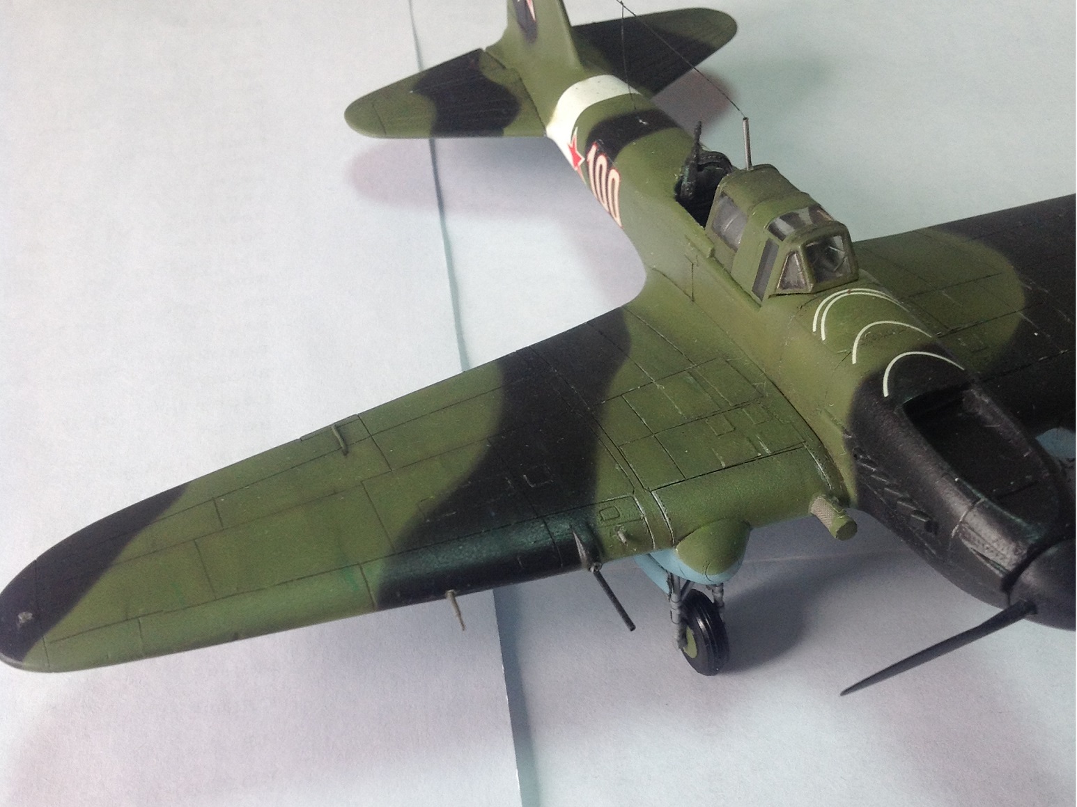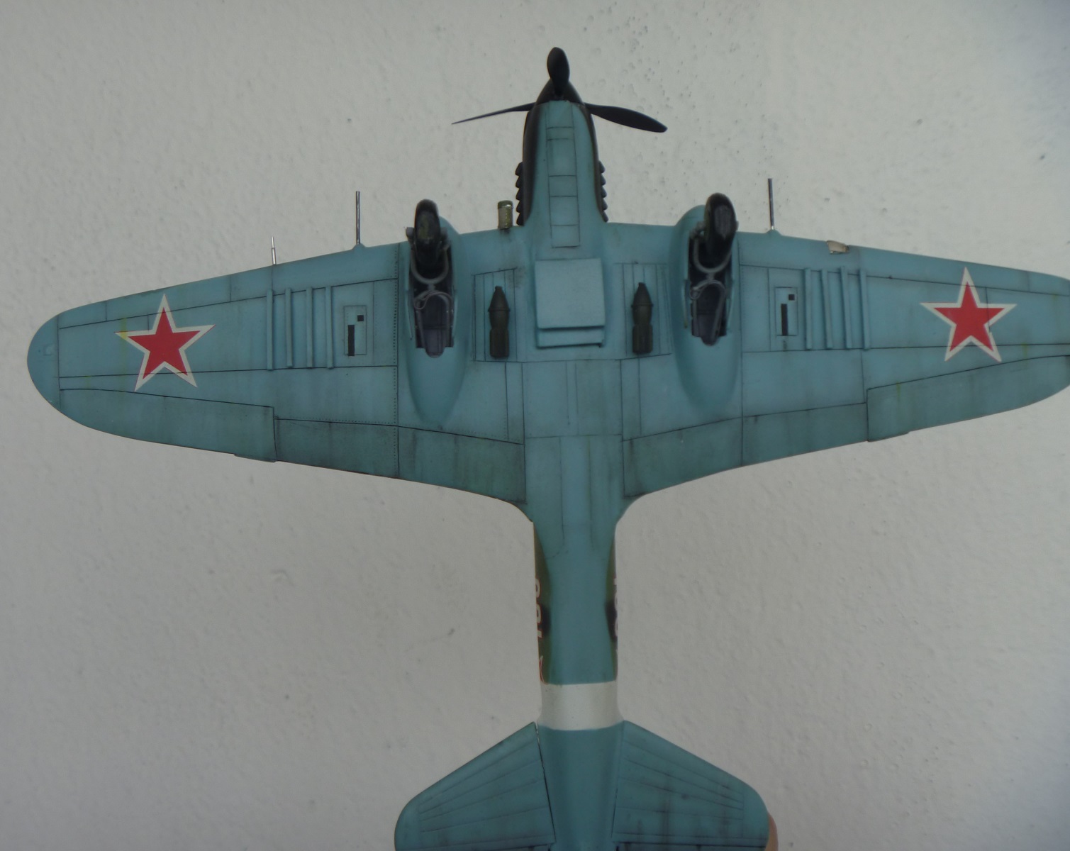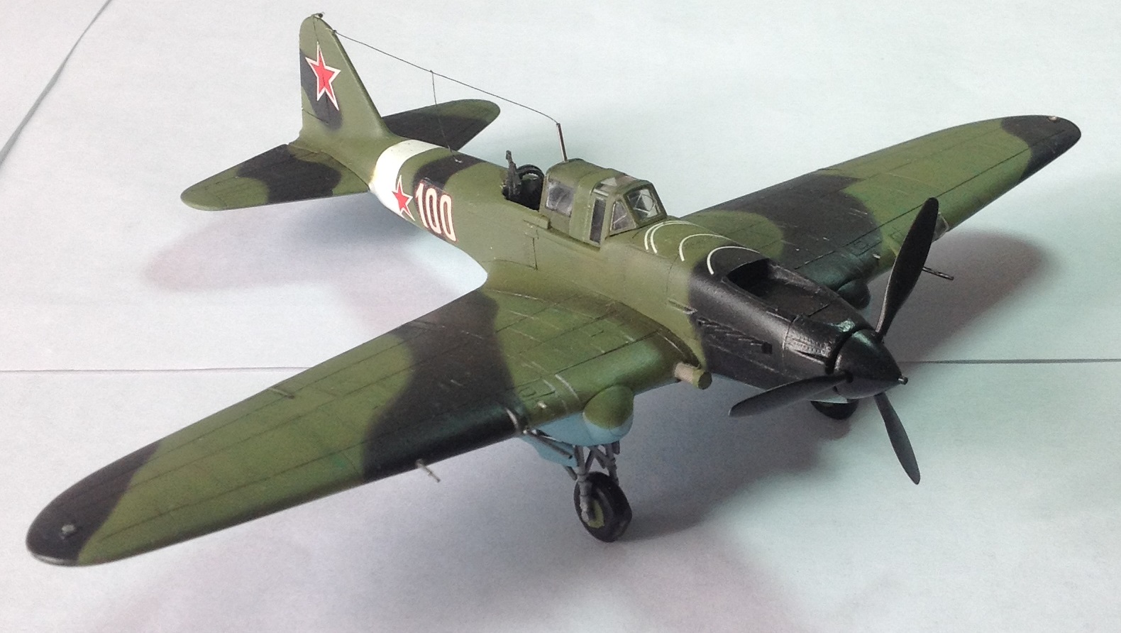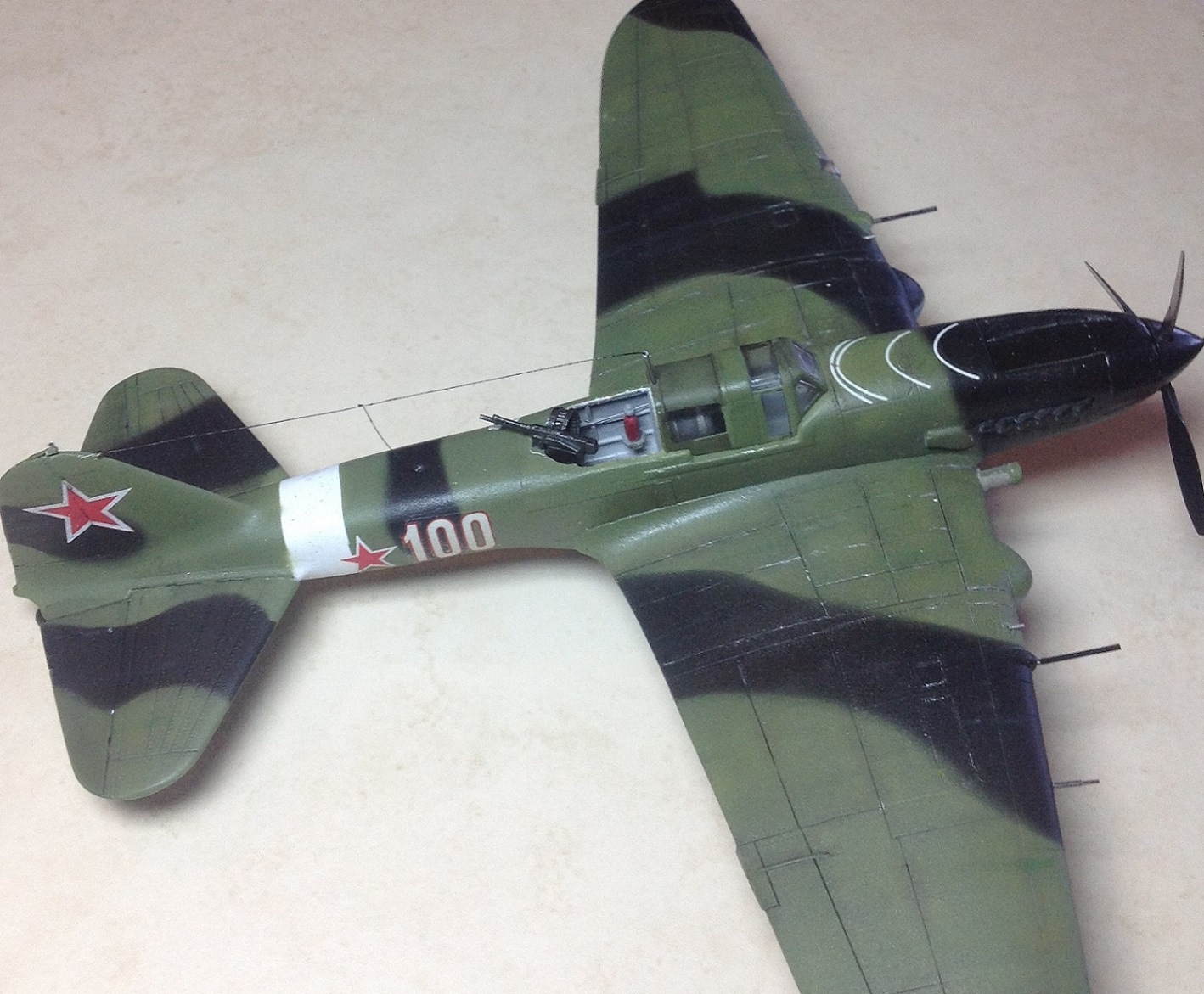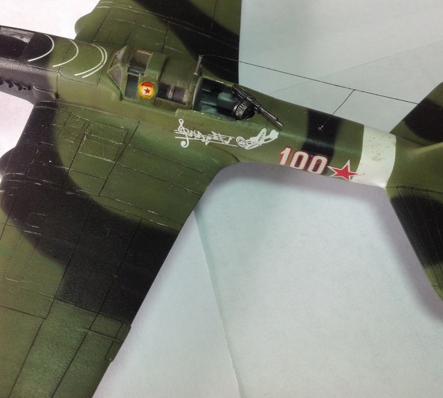 К выше сказанному добавлю что фонарь кабины прокрашен "слабо", не хватает серого слоя "внутрянки" отчего он выглядит прозрачным. Сочленение кока винта с фюзеляжем - могло быть лучше. Выхлопные патрубки ну не должны быть одного тона с камуфляжем. Местами чуть-чуть не хватает шпатлёвки, ну самую малость, по стыковочным швам.