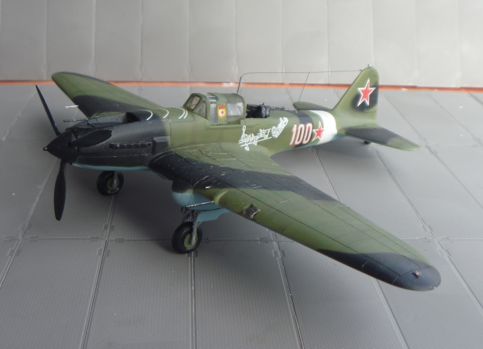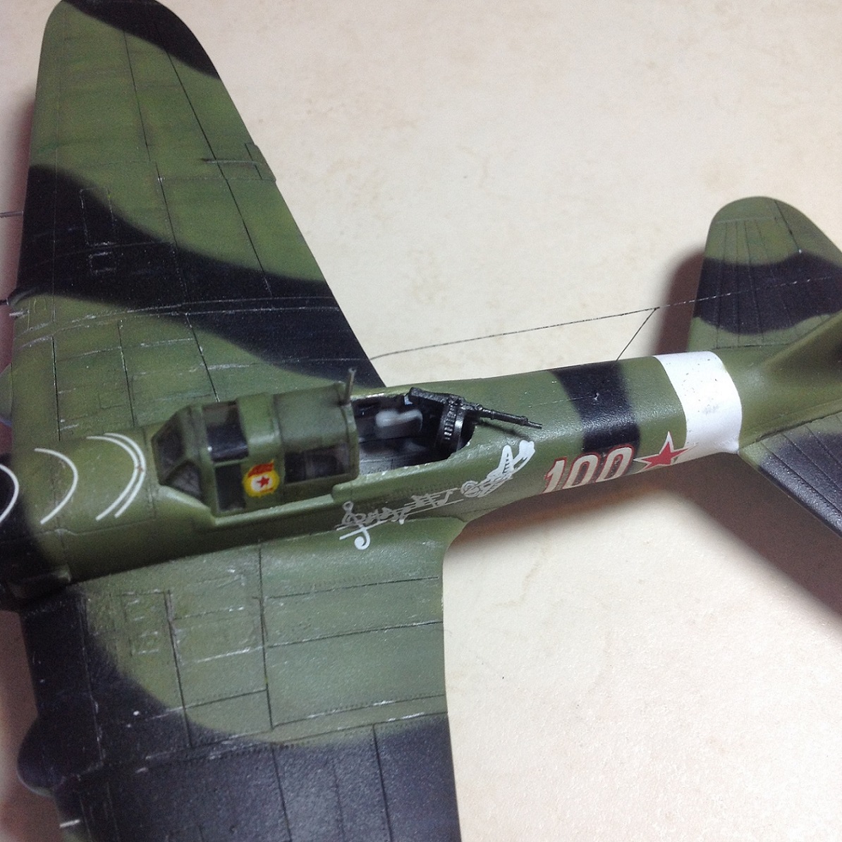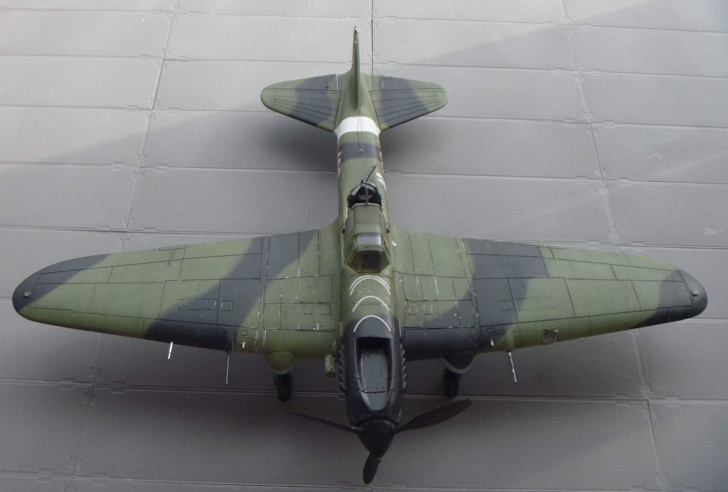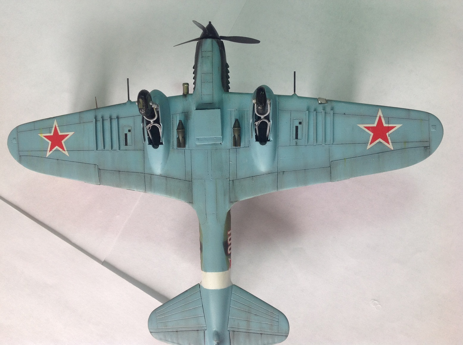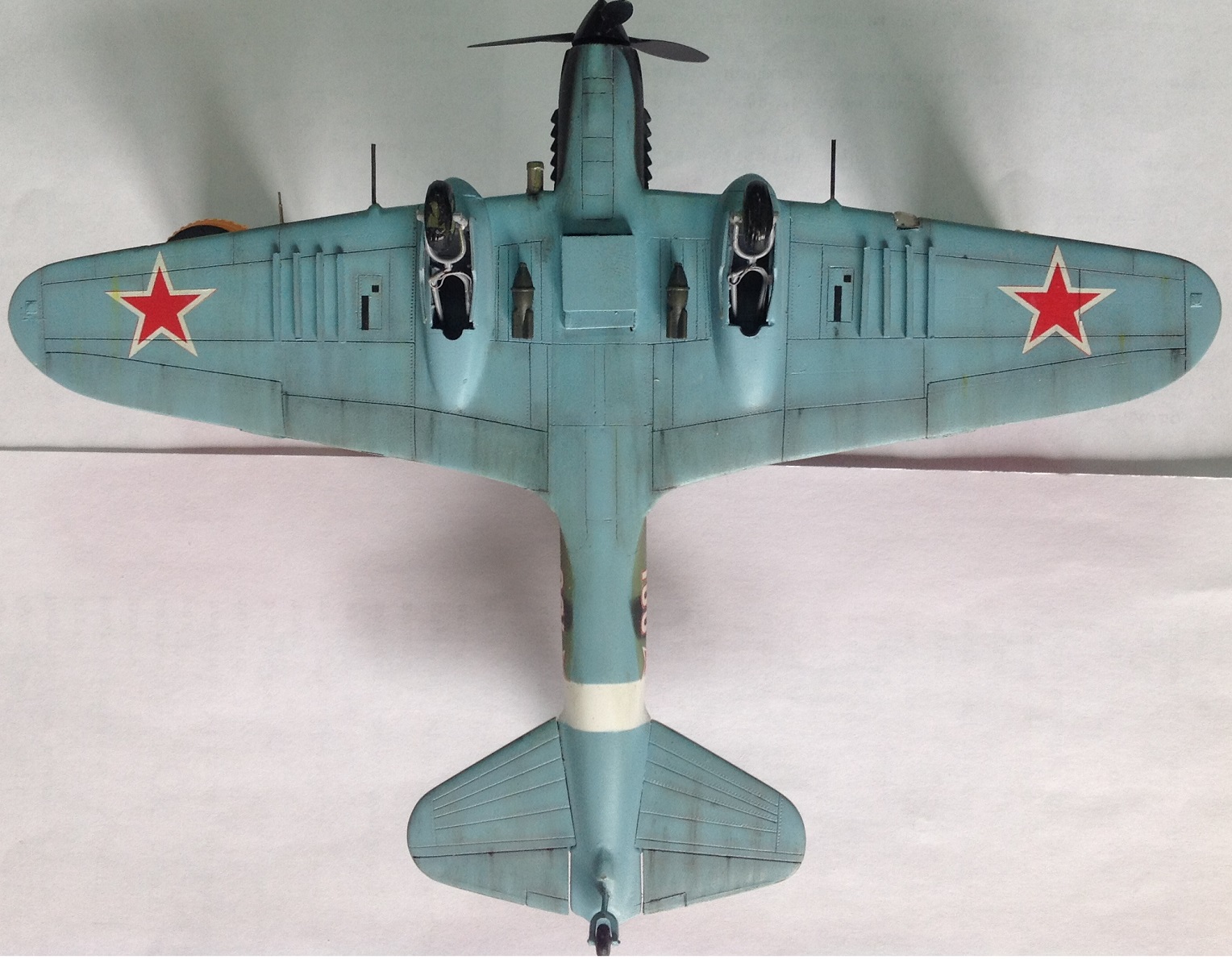 К выше сказанному добавлю что фонарь кабины прокрашен "слабо", не хватает серого слоя "внутрянки" отчего он выглядит прозрачным. Сочленение кока винта с фюзеляжем - могло быть лучше. Выхлопные патрубки ну не должны быть одного тона с камуфляжем. Местами чуть-чуть не хватает шпатлёвки, ну самую малость, по стыковочным швам.