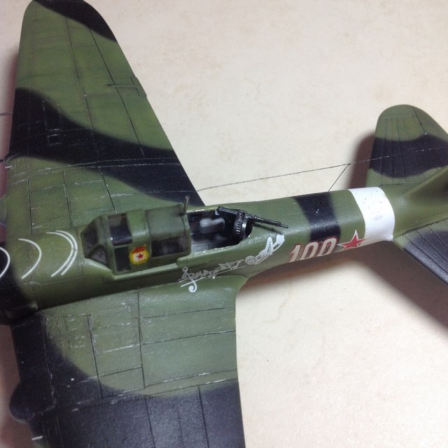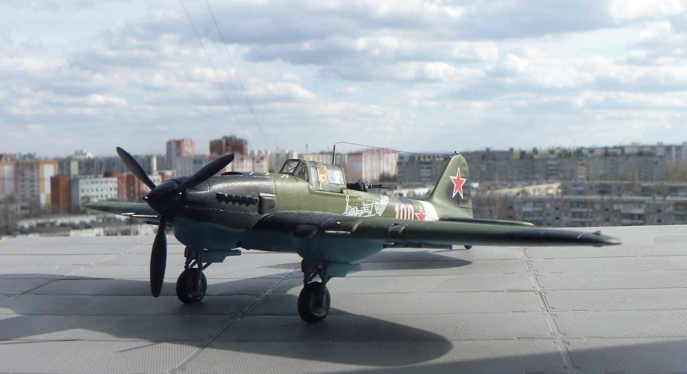 Всех приветствую. Модель приобретена совершенно случайно во время прогулки по т.ц. и была призвана заменить давно собранный ИЛ-2, который без малого простоял на полке лет 10 и был последней моделью которая окрашивалась кистью, и пережившая многих китов собранных в дальнейшем. Долго определялся с прототипом, в итоге был выбран борт Василия Емельяненко в черно-зеленом камуфляже с Б.Н. 100 декаль которого предоставил Сергей Бусаргин за что ему сердечно благодарен.
