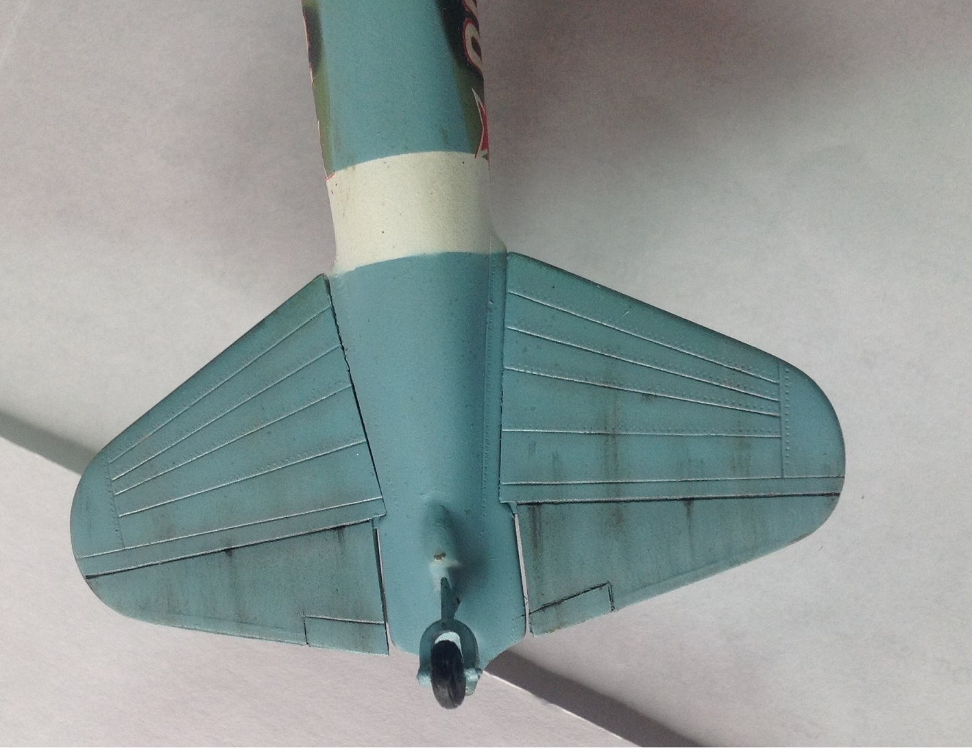 Хорошо получилось. Есть, правда, несколько замечаний. Модель матовая а колеса блестят. При таком количестве сколов вообще нет выхлопа от двигателя и гари от пушек и пулеметов. И виден шов между половинками фюзеляжа за кабиной. Правда, я не знаю, может он там и должен быть. Но в целом, отличный результат.