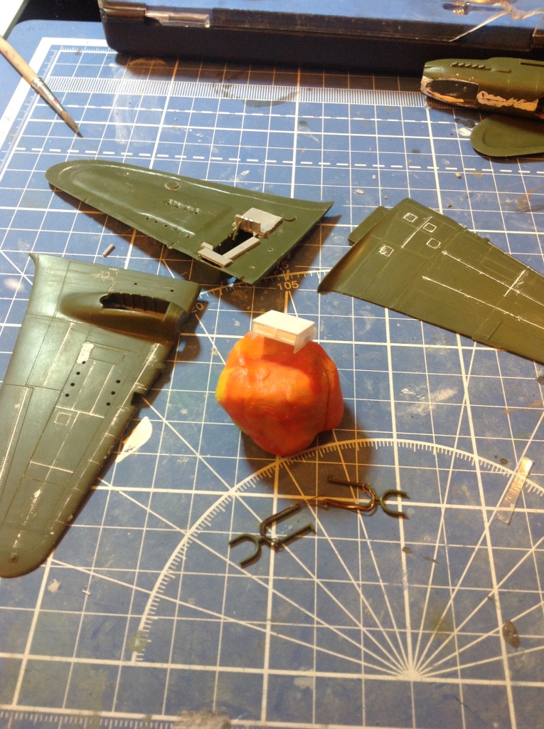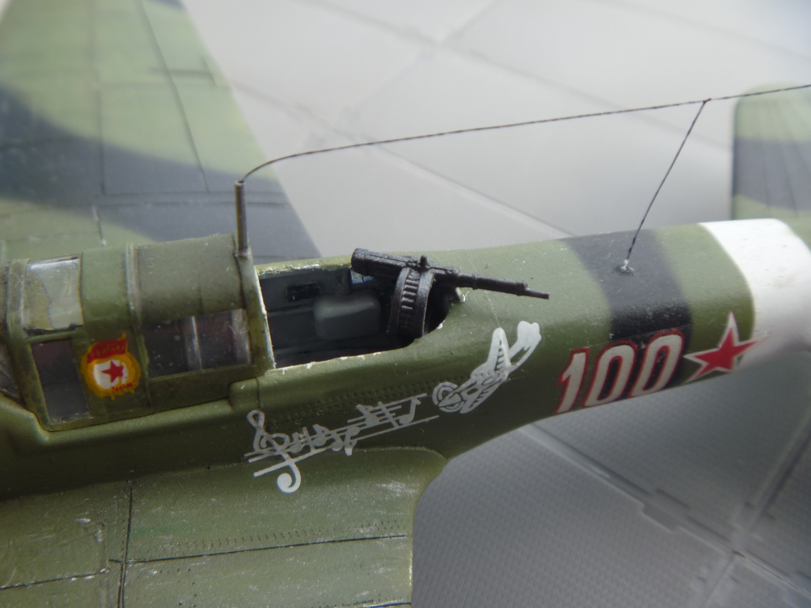 Из доработок. Полностью перерезана расшивка,сделан наплыв на брюхе, из фольги эмитированы лючки и бронелист стрелка, само место стрелка было переделано, добавлена проводка, выключатели и огнетушитель, пулемет тоже подвергся незначительным доработкам, ствол сделан из иглы, добавлена пулеметная лента, облагороженны ниши шасси, добавлена гидравлика стоек, просажены колеса, воздухозаборник был сточен до приемлемого, сделан рассекатель потока, маслорадиатор изготовлен с ноля, добавлена заслонка, была выдавлена фара и стекло к ней из прозрачного пластика, делать это нужно конечно было на начальном этапе а не в конце как я, антена, пулеметы, пушки, трубка пито из игл, тросик мононить. ЛКП ТАМИЯ, тонировка масло.
