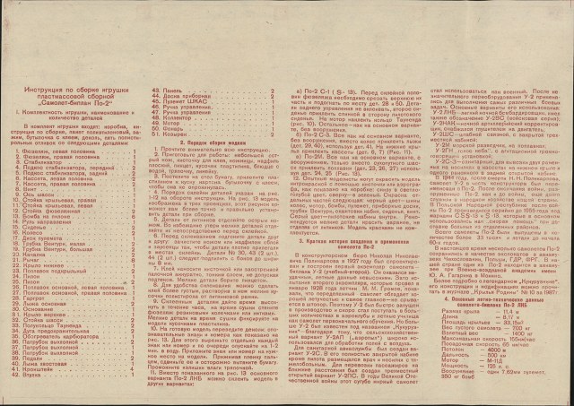 Инструкция подробная, с краткой справкой об истории самолета, (стоит отметить что в инструкции перечислены основные детали модели с их количеством)