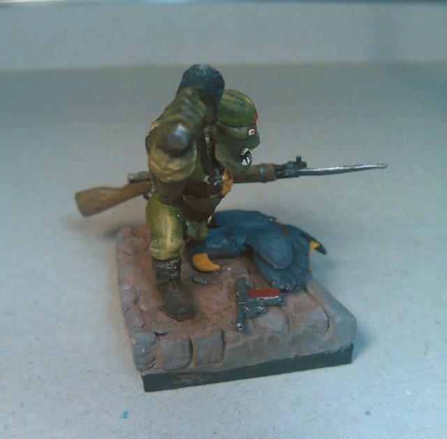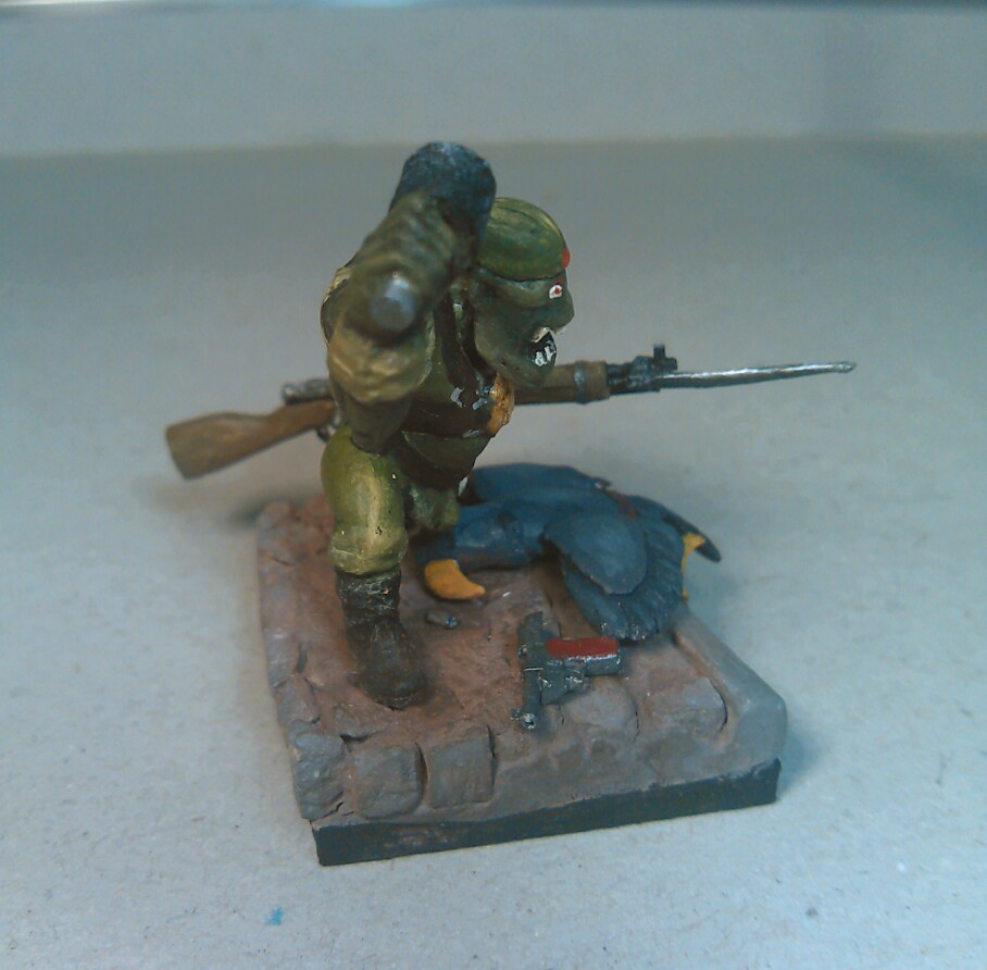 Первая виньетка, доведенная до конца. Думаю пояснения излишни. Технологически: олово (отливка из малого набора бойзов от ГВ), литники, сапоги советского танкиста от ICM, камушки и деревянная "пуговица" для основания. Покраска: акрил сонет, мастер-звезда, пастель.