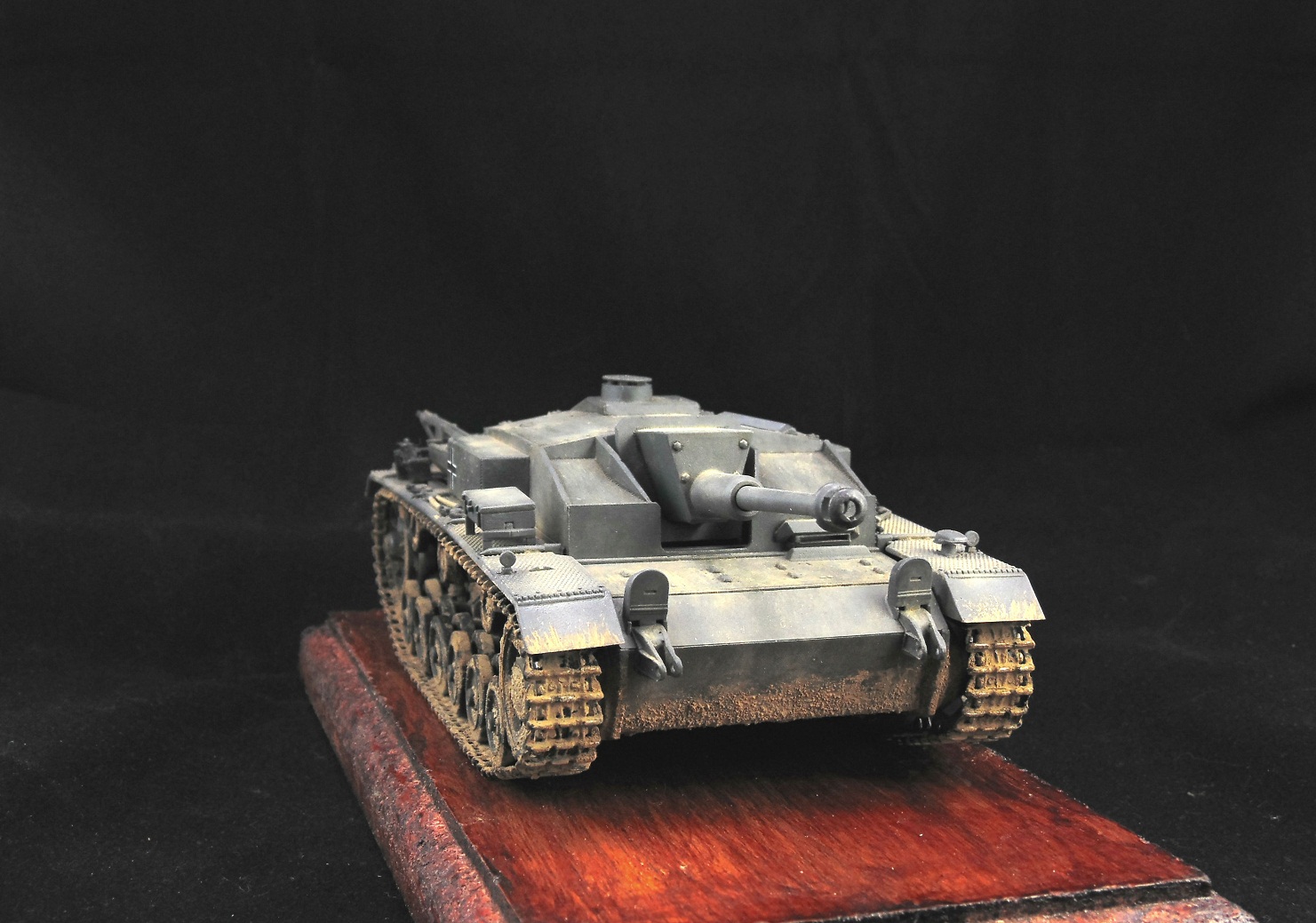 Stug III F от Звезды здесь можно обсуждать только в художественном плане,матчасти там как таковой попросту нет.Навскидку что бросилось в глаза сразу отсутствие рымов на башне.нет брызговиков под задними подкрылками, крюк для демонтажа надмоторной плиты приклеен неправильно,куда делся второй ложемент с антеной по левому борту?ручки саперных кусачек были не деревянными а из бакелита(темно-коричневые),про габарит сзади сказали выше.