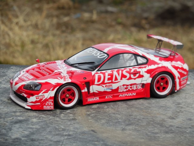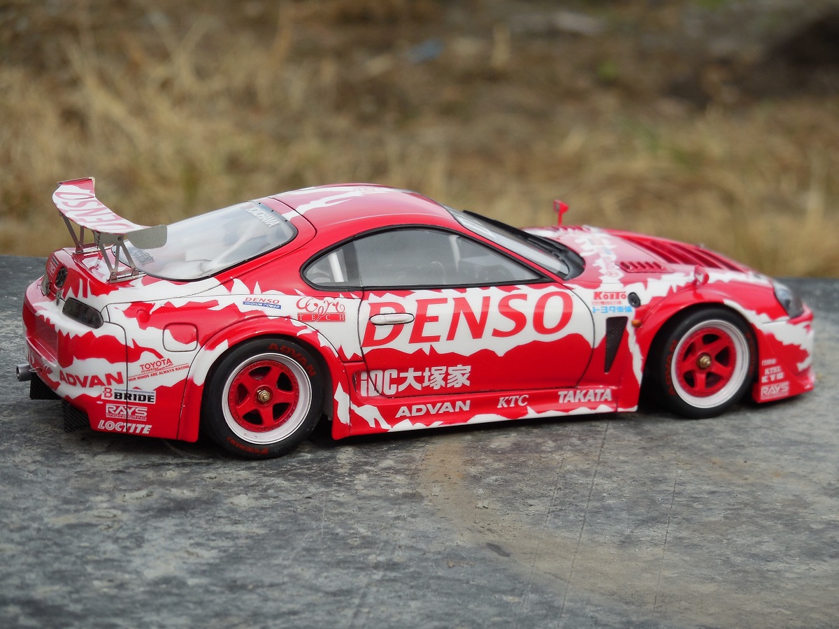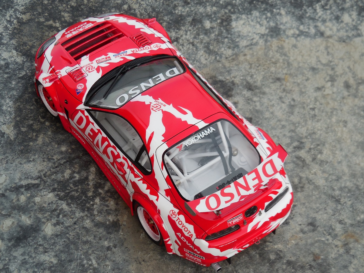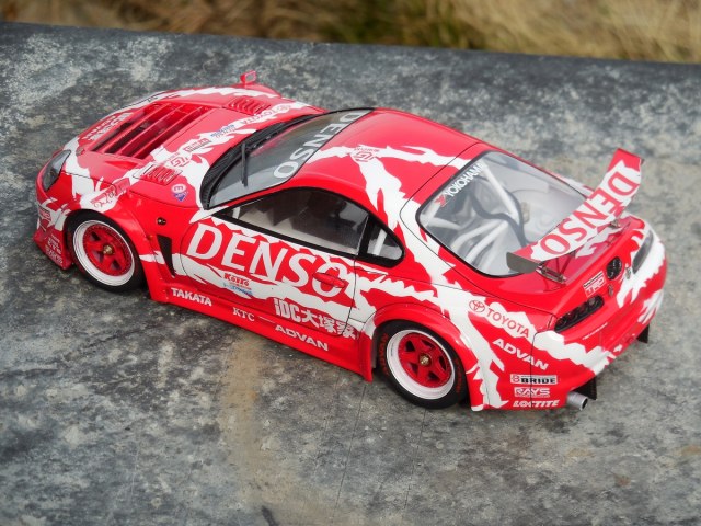 Сам кит Toyota Supra GT от Tamiya. Декали Studio 27, предназначались для Supra JGTC, от них я взял только логотипы. Идея покраски возникла после примерки декалей, т.к. подкрашивать пришлось бы всё равно а цвет какой не известно, поэтому окрас решил произвести сам, найдя прототип(гражданская версия), добавил немного фантазии, чтоб белое было на красном,красное на белом.