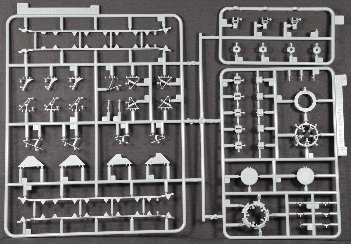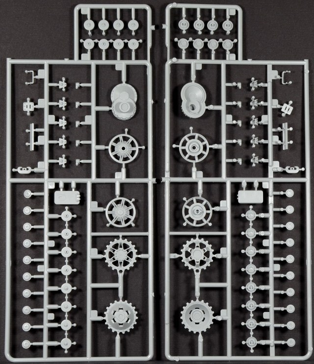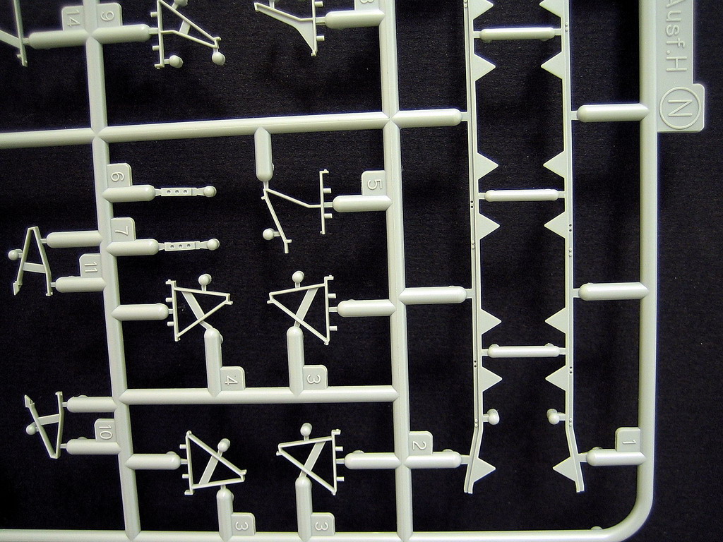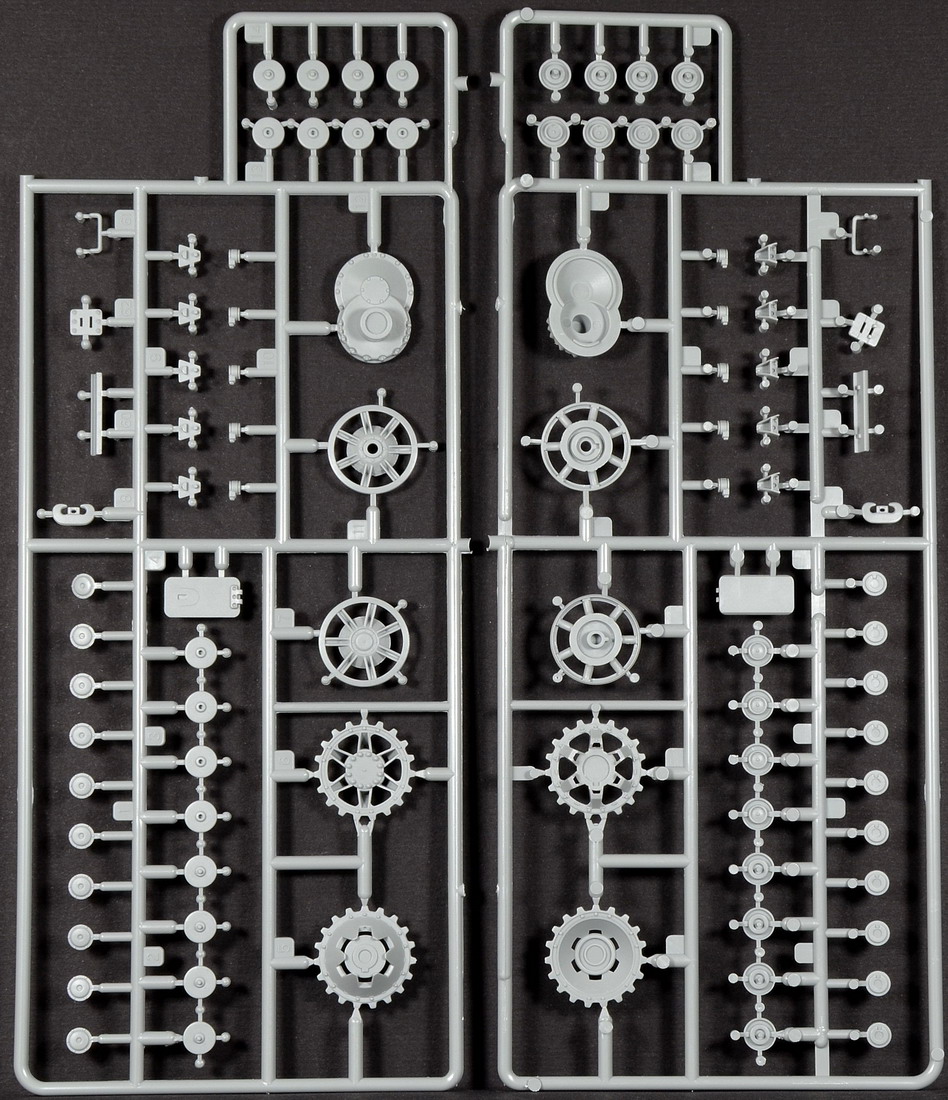 При беглом осмотре каких-то ярко выраженных недочетов не выявлено. Качество отливок, как всегда, безупречное. Данный набор предполагает сборку так называемой «Mid-версии», поэтому сразу проверил наличие деталей, имеющих характерные особенности. Поддерживающие катки даны в двух вариантах, как с обрезинкой, так и без; воздушные фильтры характерены именно для модификации Н; крепление зап.траков на корме – все верно; кронштейны крепления экранов тоже вроде соответствуют, сильно не вдавался пока; ленивцы двух типов, так как могут быть разными в зависимости от прототипа; дульные тормоза тоже разных типов; глушитель поворота башни правильный; картеры главных фрикционов верные. В общем, вроде всё путём. Более детально буду разбираться при сборке, т.к. учесть и проверить все мелочи сейчас вряд ли получится.