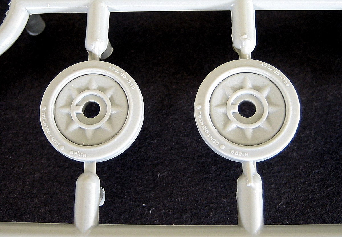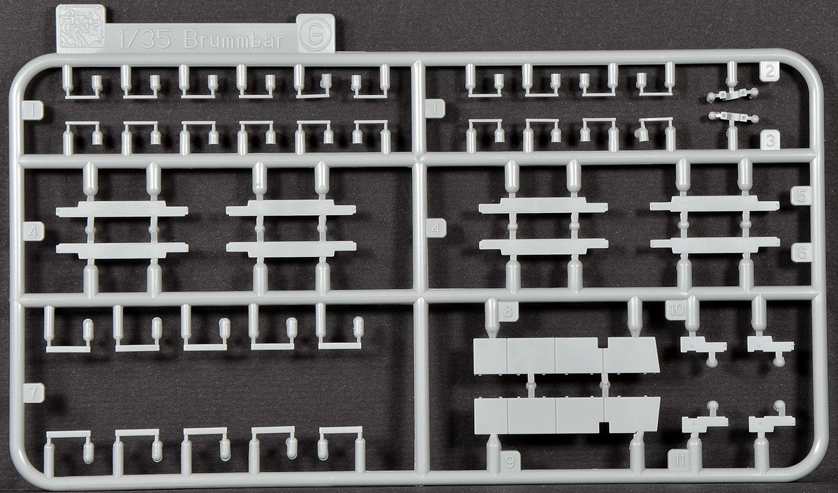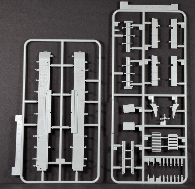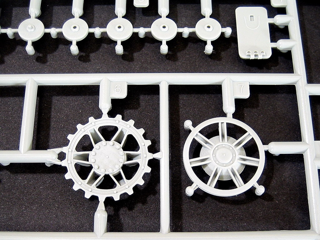 При беглом осмотре каких-то ярко выраженных недочетов не выявлено. Качество отливок, как всегда, безупречное. Данный набор предполагает сборку так называемой «Mid-версии», поэтому сразу проверил наличие деталей, имеющих характерные особенности. Поддерживающие катки даны в двух вариантах, как с обрезинкой, так и без; воздушные фильтры характерены именно для модификации Н; крепление зап.траков на корме – все верно; кронштейны крепления экранов тоже вроде соответствуют, сильно не вдавался пока; ленивцы двух типов, так как могут быть разными в зависимости от прототипа; дульные тормоза тоже разных типов; глушитель поворота башни правильный; картеры главных фрикционов верные. В общем, вроде всё путём. Более детально буду разбираться при сборке, т.к. учесть и проверить все мелочи сейчас вряд ли получится.